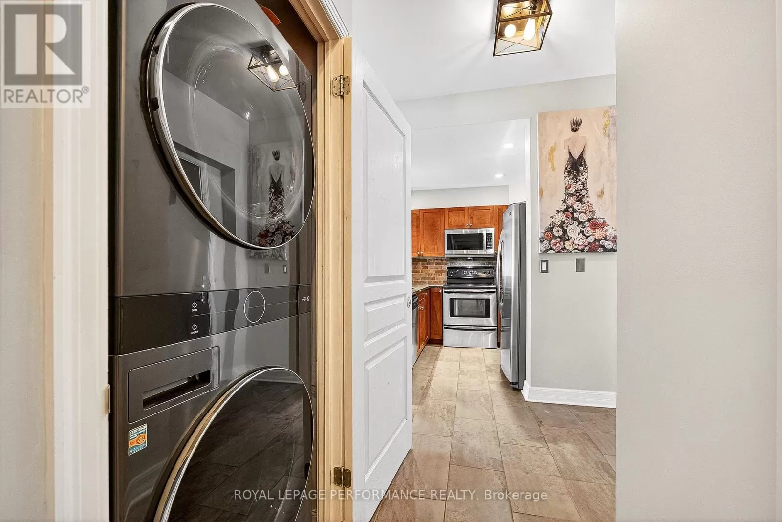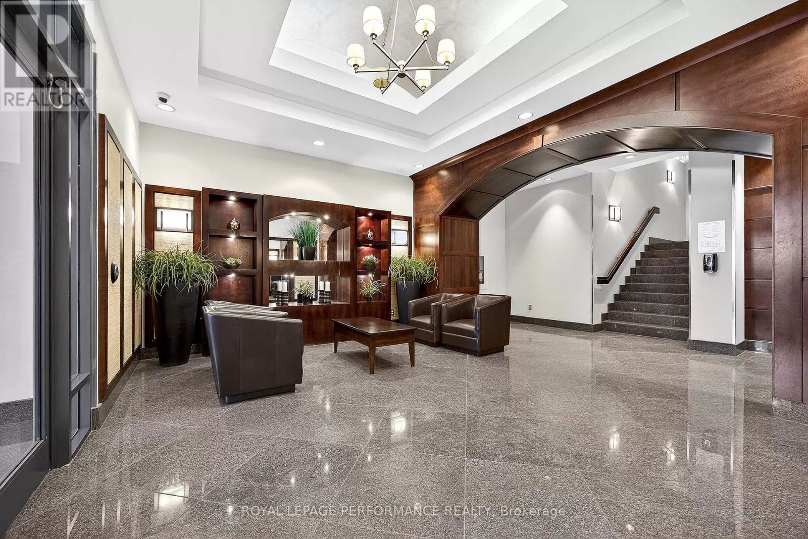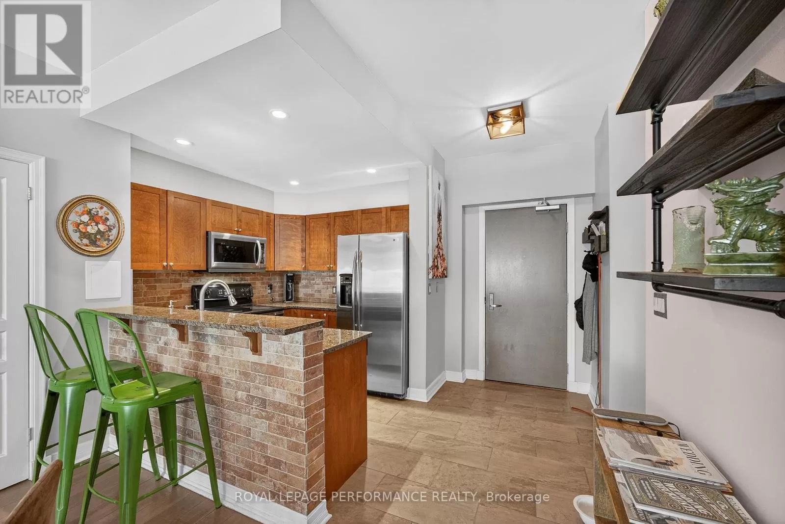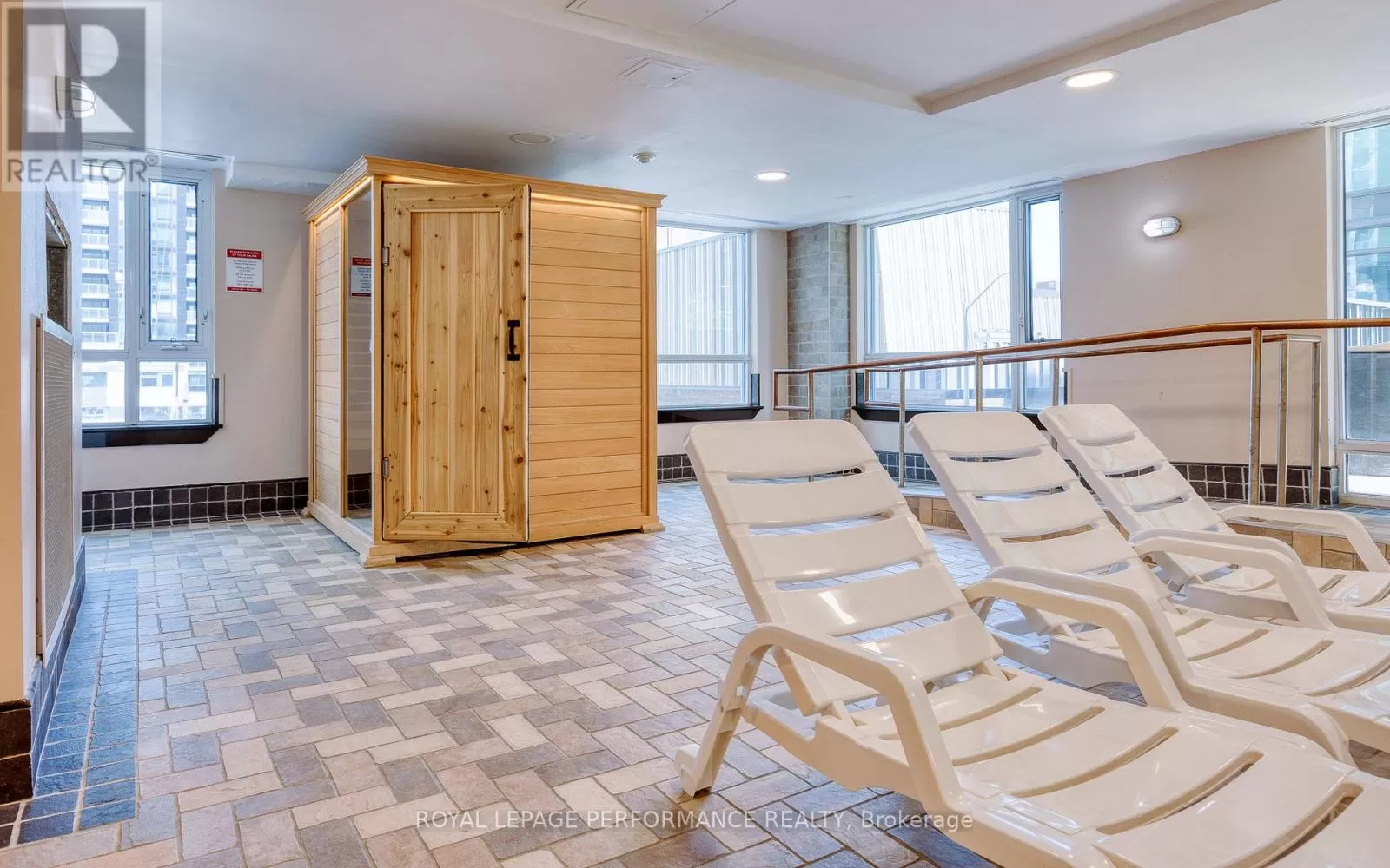 Cross Streets: Daly and Rideau. ** Directions: Rideau to Besserer. Rarely offered, this modern and elegant 2 BEDRM condo also has a large DEN, 2 FULL bathrooms, 2 INDR underground parking spots & a storage locker. Approx. 1135 sq ft as per Builder's plan. The owner has lovingly added modern upgrades to embrace natural elements into the space; brick facade added to the granite breakfast bar, wood panels in the den, Edison light fixtures and metal and wooden shelving etc. Hardwood flooring throughout and open concept layout. Kitchen features granite countertops, convenient double sink, stainless steel appliances and hidden pantry. Full sized ,newer LG washer and dryer that offers durability while being quiet. Primary Bedrm has a wall of windows with views of the terrace, 2 sets of closet space and a 4 pc ensuite bathrm with a separate shower area. Have a roommate or a guest? 2nd bedroom also has a wall of windows with views of the terrace, & great closet space. Gym and sauna /lounge area on the 2nd floor. Parking P1-7, P1-3. Storage S4-20. Walking distance to grocery stores, LCBO, LRT etc. This building allows for pets - with some restrictions on size. Security - on site.This prime location is perfect for those who love the energy of being downtown. This unit has a walking score of= 99. Transit score =91, Bike Score =97. (id:27476)