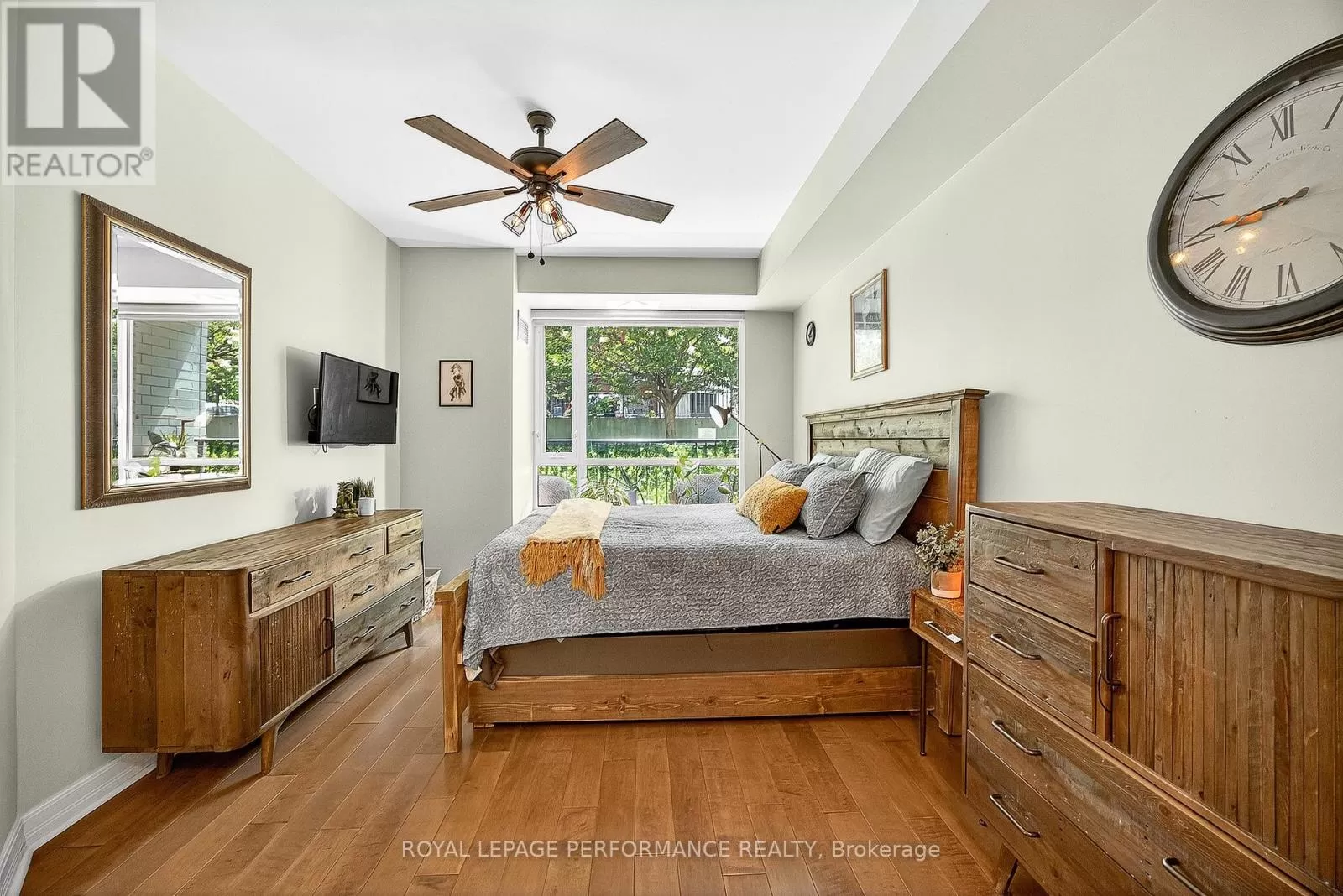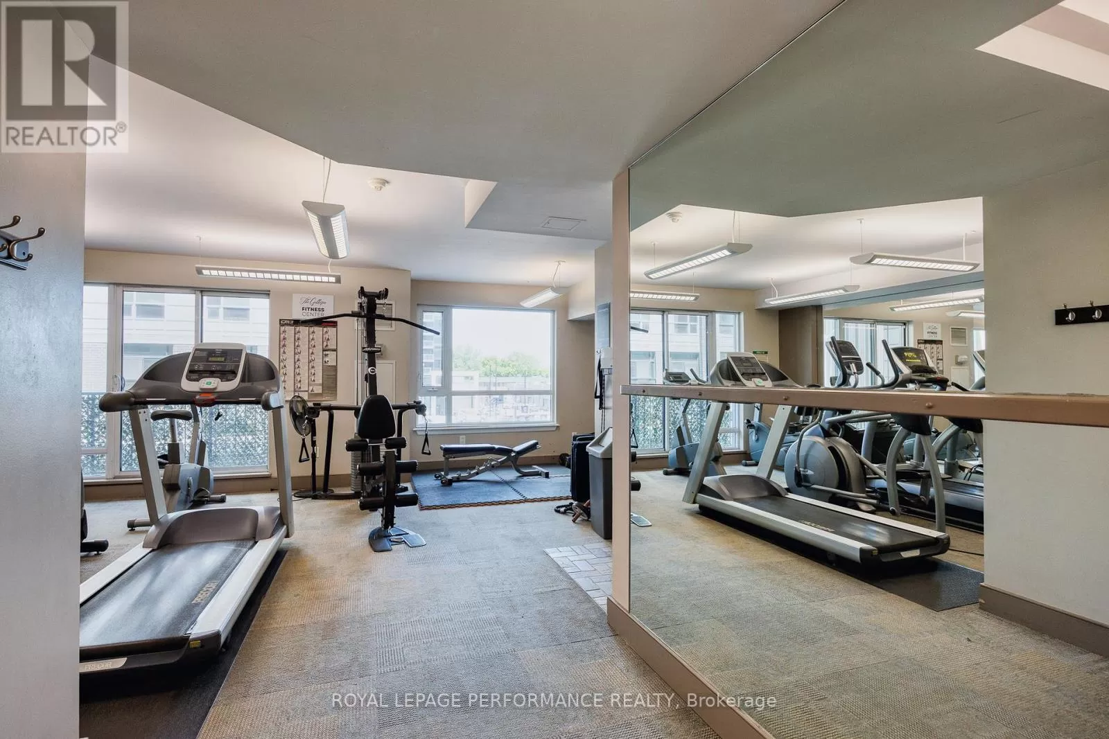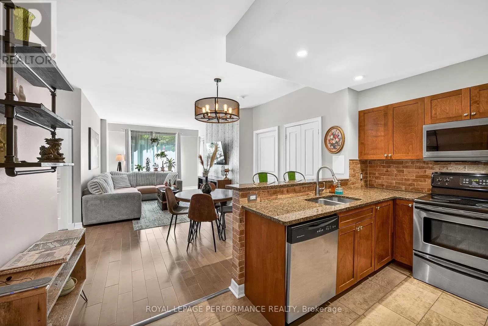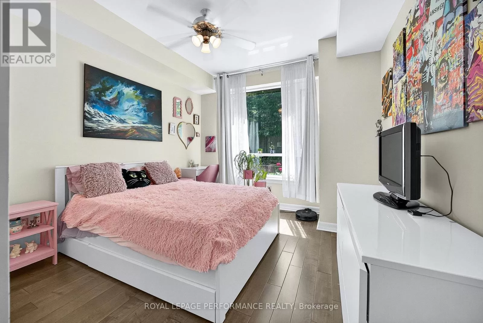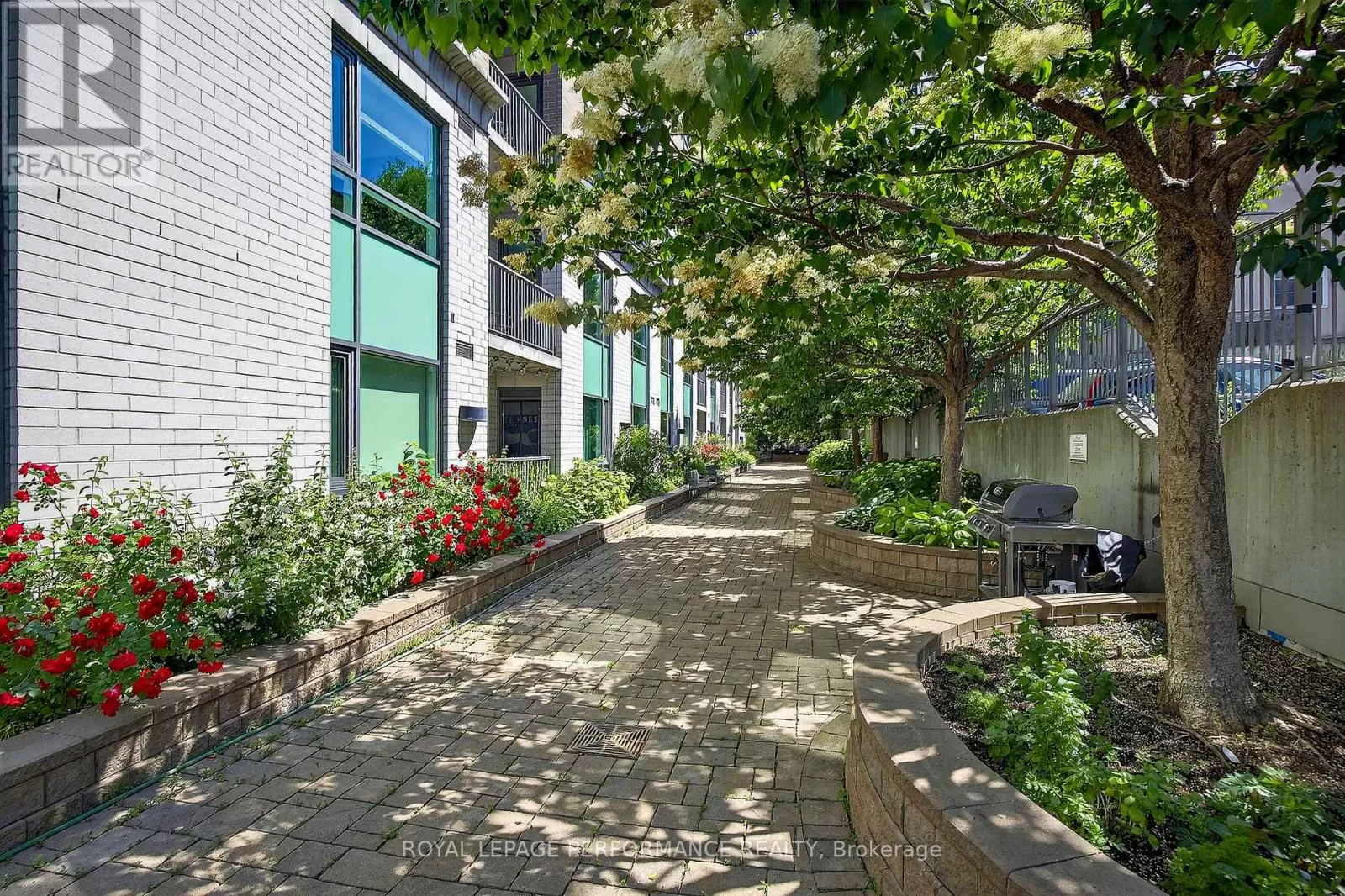 Cross Streets: Daly and Rideau. ** Directions: Rideau to Besserer. Rarely offered, this modern and elegant 2 BEDRM condo also has a large DEN, 2 FULL bathrooms, 2 INDR underground parking spots & a storage locker. Approx. 1135 sq ft as per Builder's plan. The owner has lovingly added modern upgrades to embrace natural elements into the space; brick facade added to the granite breakfast bar, wood panels in the den, Edison light fixtures and metal and wooden shelving etc. Hardwood flooring throughout and open concept layout. Kitchen features granite countertops, convenient double sink, stainless steel appliances and hidden pantry. Full sized ,newer LG washer and dryer that offers durability while being quiet. Primary Bedrm has a wall of windows with views of the terrace, 2 sets of closet space and a 4 pc ensuite bathrm with a separate shower area. Have a roommate or a guest? 2nd bedroom also has a wall of windows with views of the terrace, & great closet space. Gym and sauna /lounge area on the 2nd floor. Parking P1-7, P1-3. Storage S4-20. Walking distance to grocery stores, LCBO, LRT etc. This building allows for pets - with some restrictions on size. Security - on site.This prime location is perfect for those who love the energy of being downtown. This unit has a walking score of= 99. Transit score =91, Bike Score =97. (id:27476)