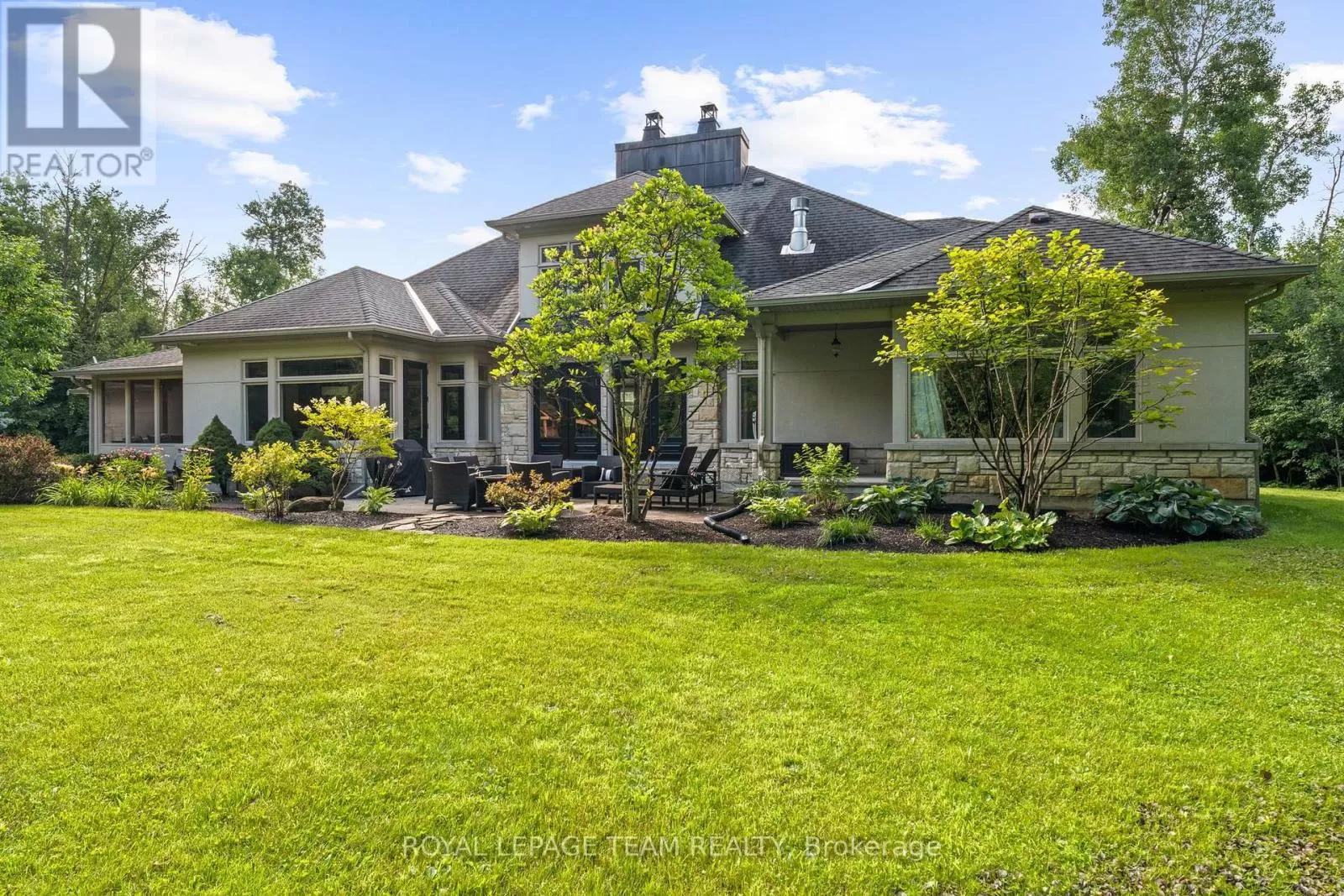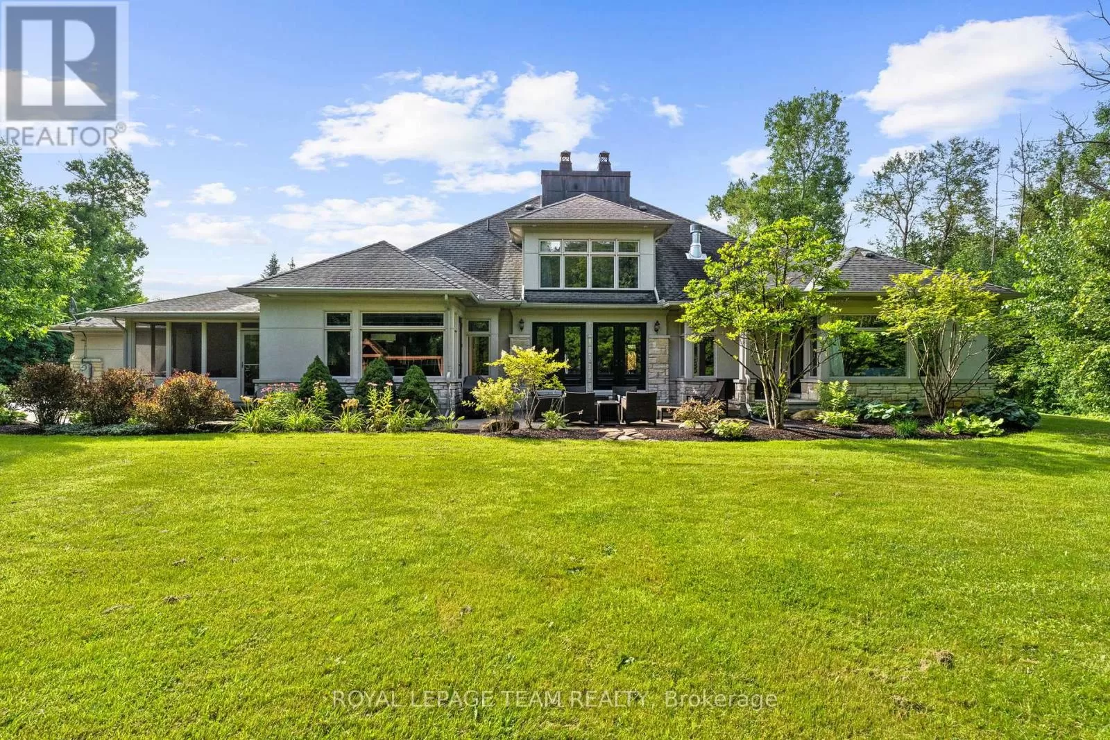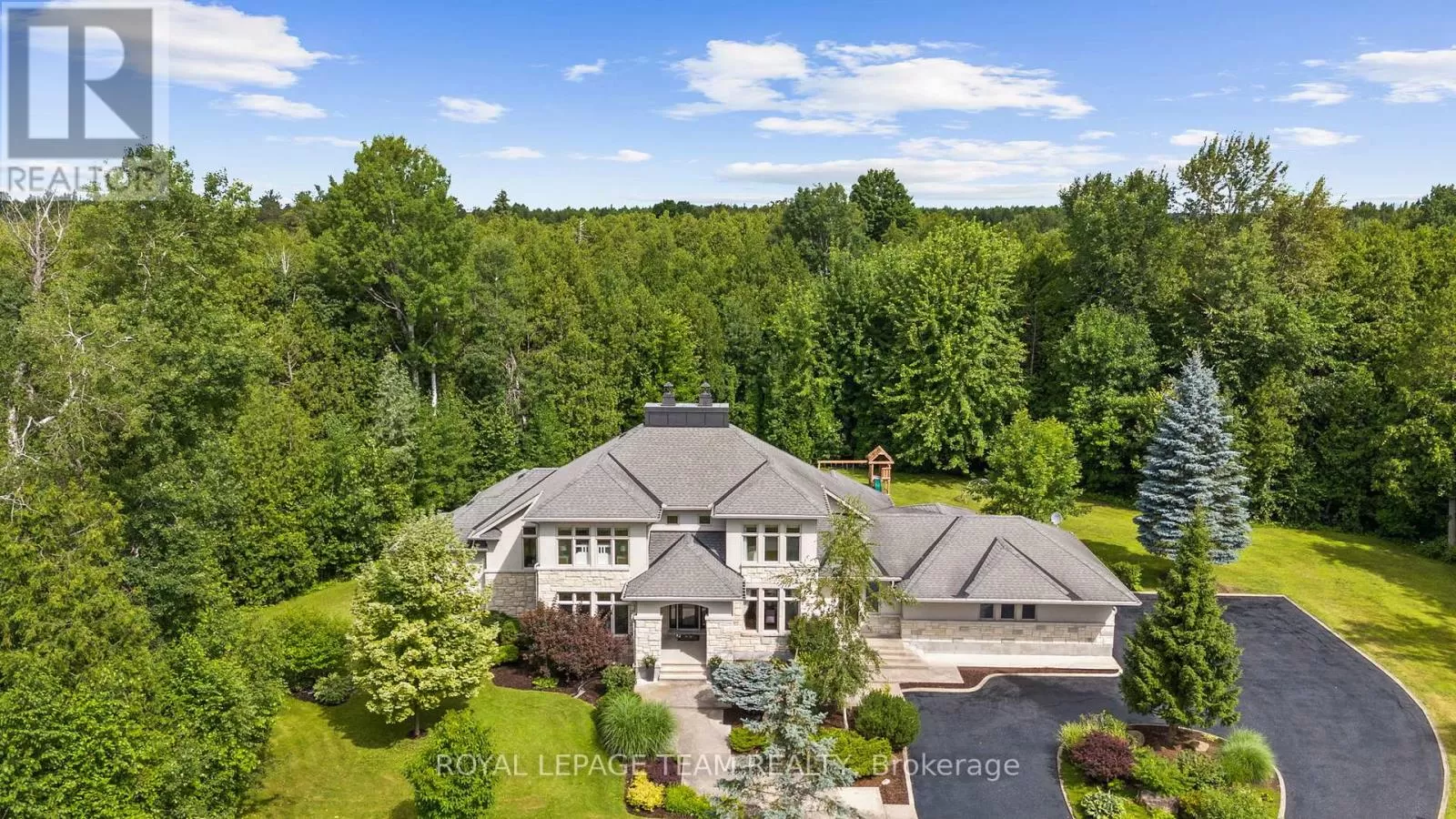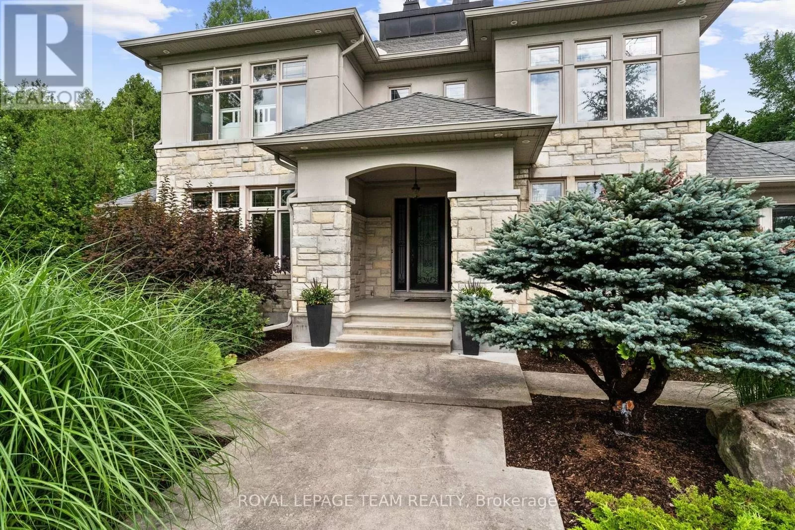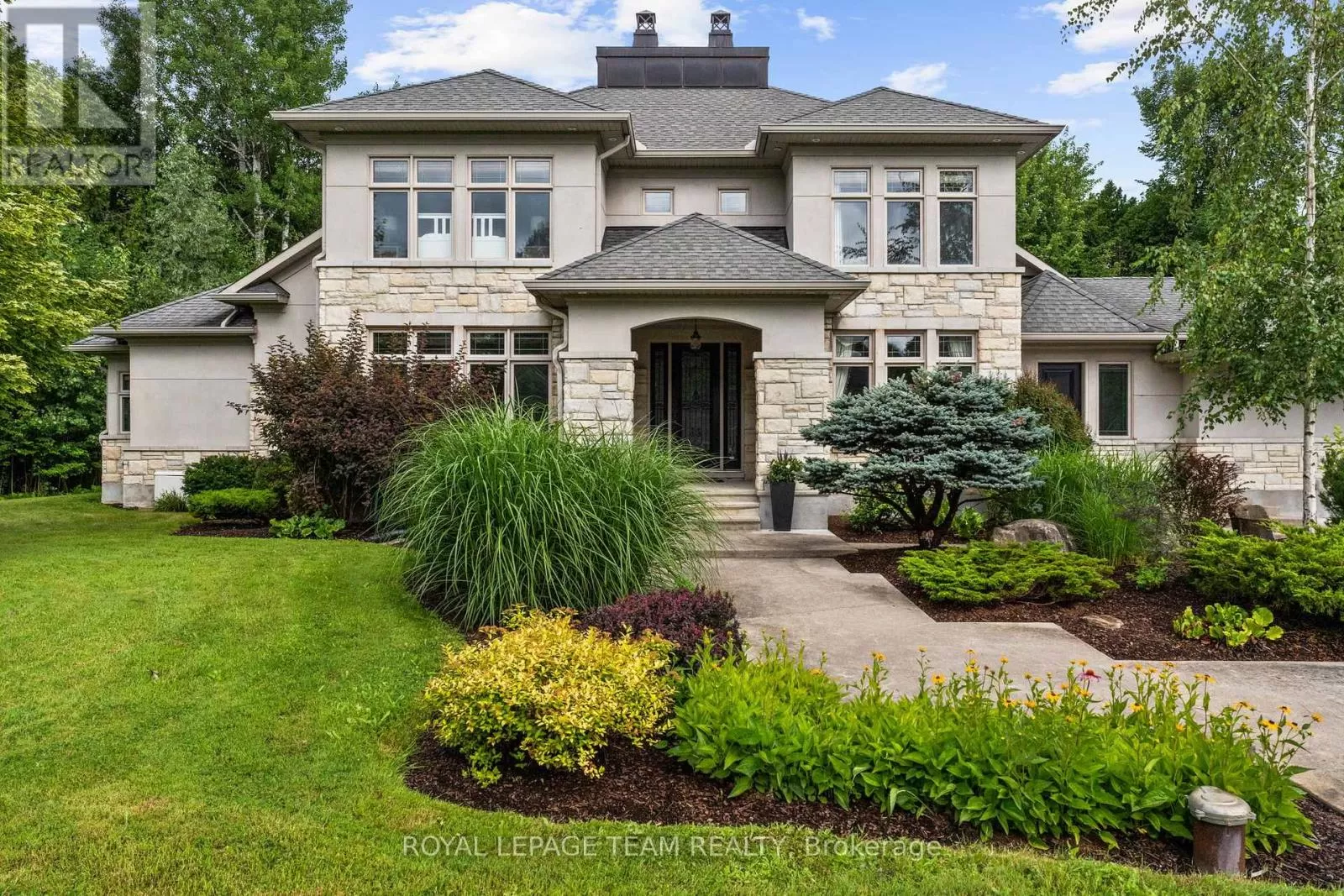 Cross Streets: Dozois Road. ** Directions: From Mitch Owen Road, turn onto Dozois Rd. Turn left onto Longshadow St. Longshadow St turns left and becomes Longhearth Way. Nestled in the South Point community of Manotick, this beautifully designed family home is set on an approximately 1.3-acre lot, offering both privacy and convenient access to boutique shops, restaurants, and cafés in the charming village of Manotick. The spacious layout boasts hardwood floors on the main and second levels, elegant mouldings, a living room enhanced by a coffered ceiling and natural gas fireplace, and a formal dining room well suited to family gatherings. The kitchen opens to the breakfast room and is appointed with custom cabinetry, granite countertops, a centre island, and a Butlers pantry. A wall of windows fills the space with natural light, creating a bright and welcoming atmosphere. A main-level office offers a quiet, dedicated space for working from home. The primary bedroom is privately located on the main floor and includes a walk-in closet and a well-appointed five-piece ensuite. Upstairs, three additional bedrooms and two full bathrooms, including one ensuite, provide comfortable accommodations for family and guests. The lower level expands the living space with a large recreation room, a full bathroom, a bedroom, and a flexible room in the finished design. Completing the property is a serene outdoor living space that includes a screened-in porch, ideal for quiet moments overlooking mature trees and a peaceful backyard. The exterior patio offers a comfortable setting for alfresco dining or gathering with friends, surrounded by landscaped gardens and natural greenery. (id:27476)