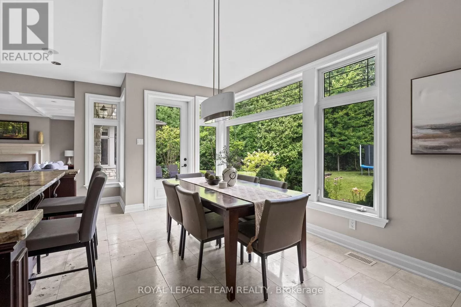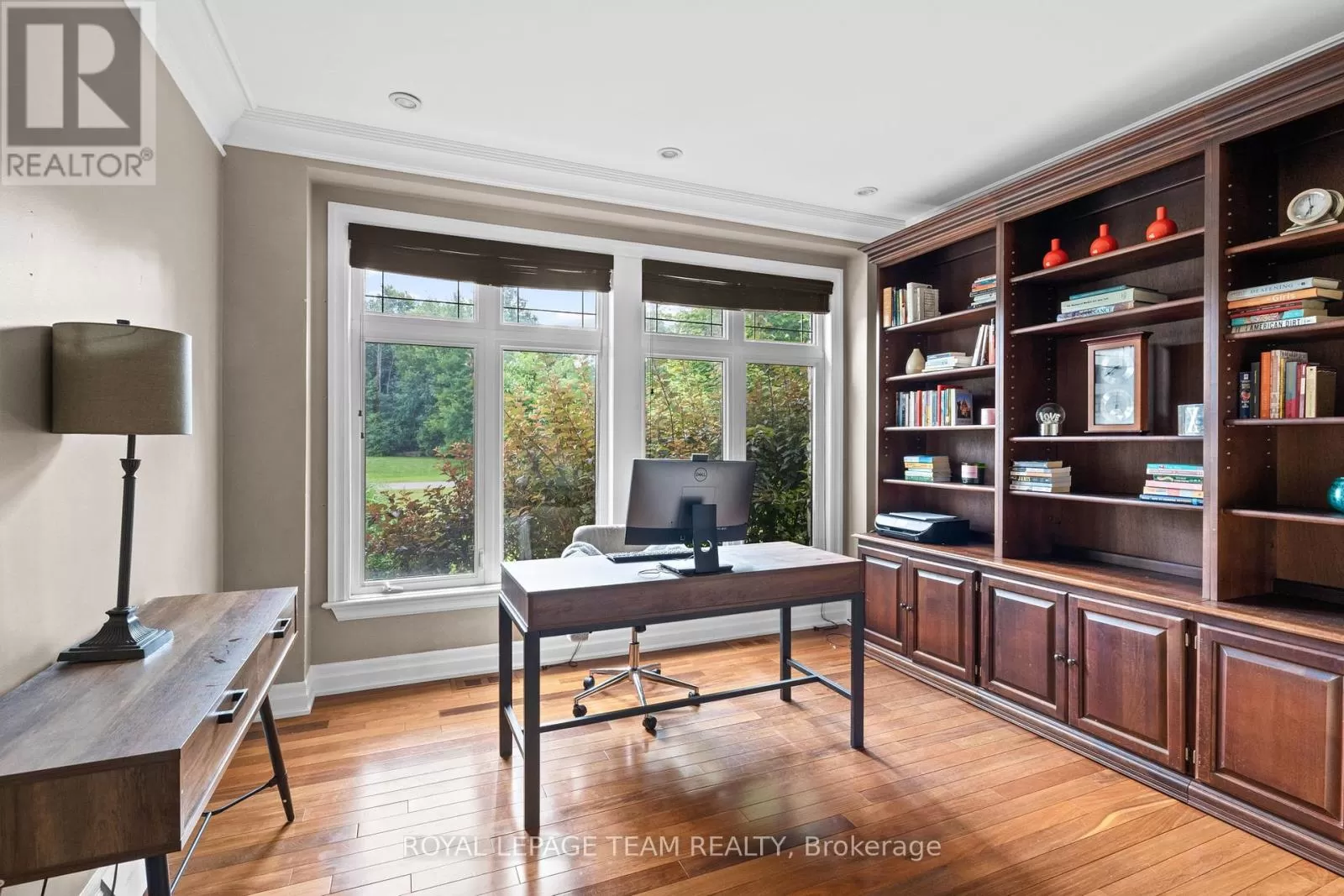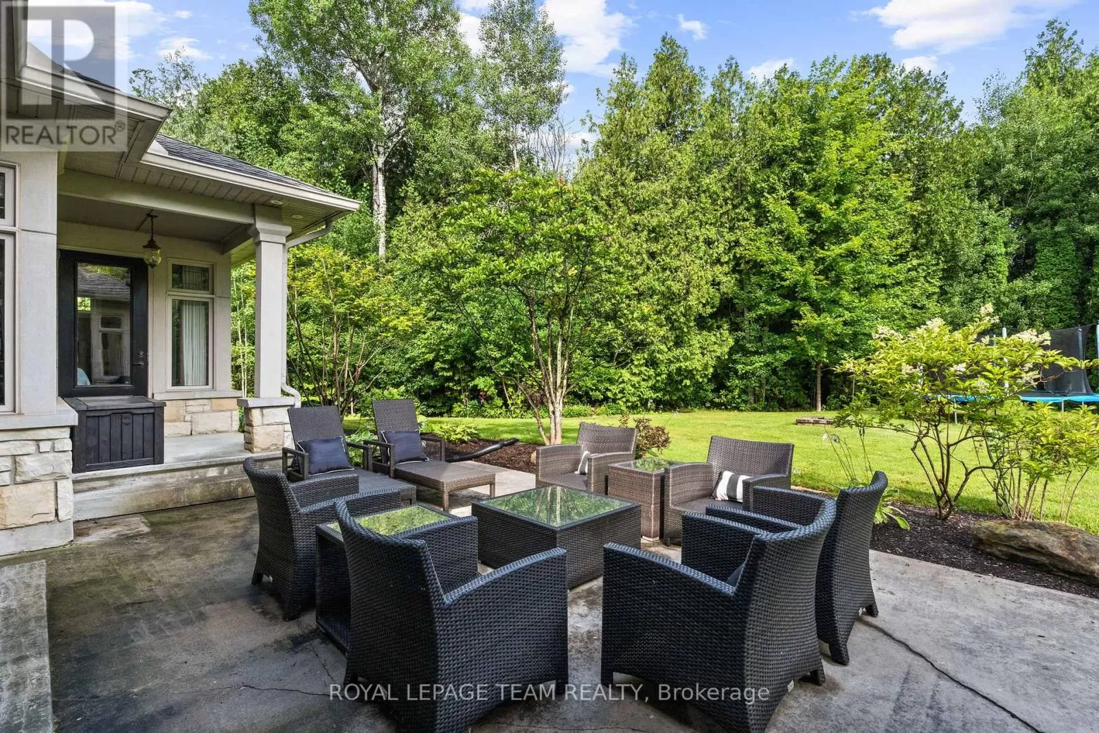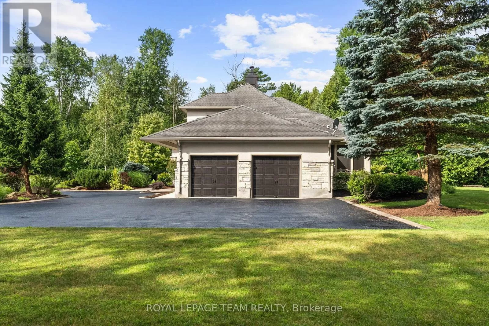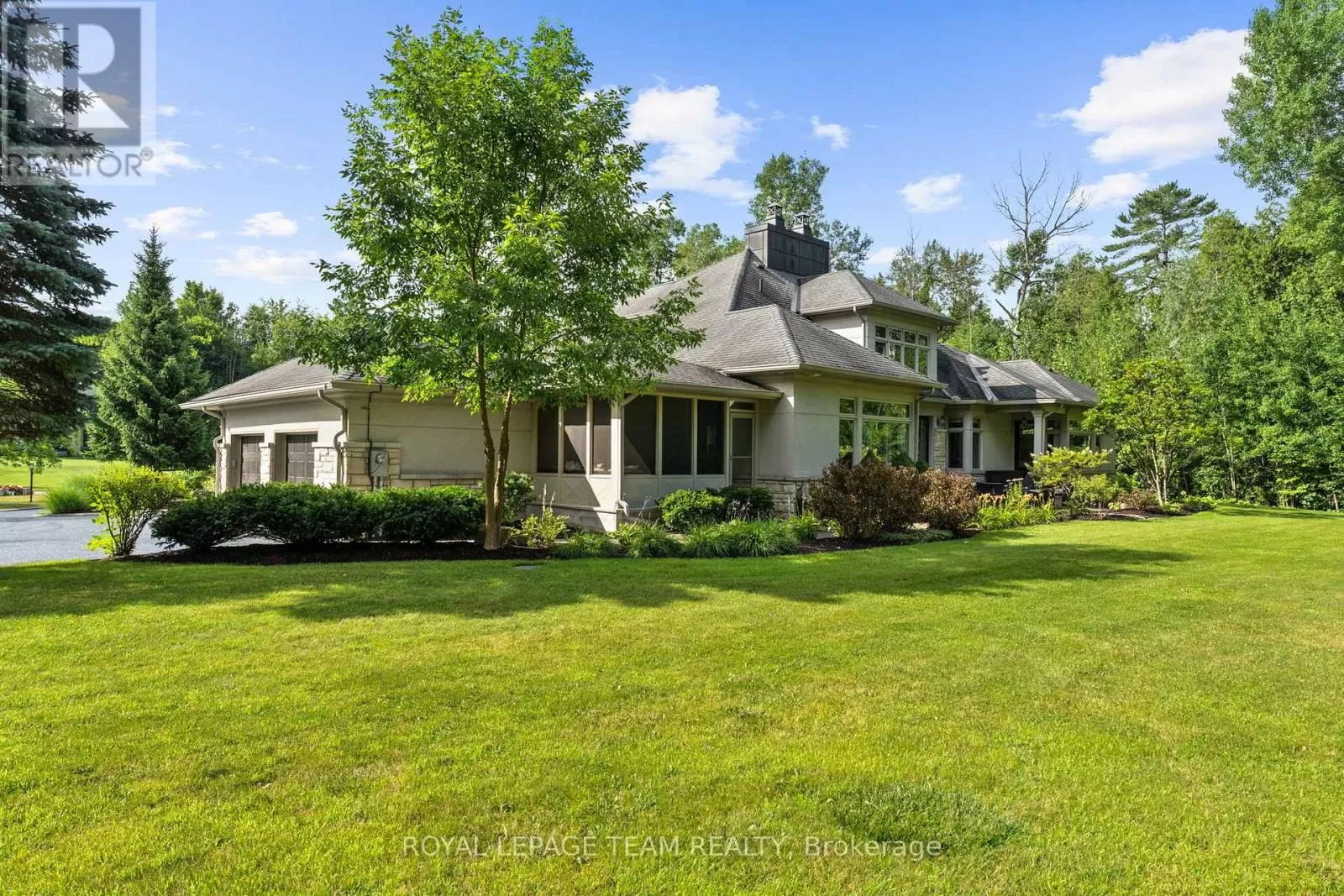Cross Streets: Dozois Road. ** Directions: From Mitch Owen Road, turn onto Dozois Rd. Turn left onto Longshadow St. Longshadow St turns left and becomes Longhearth Way. Nestled in the South Point community of Manotick, this beautifully designed family home is set on an approximately 1.3-acre lot, offering both privacy and convenient access to boutique shops, restaurants, and cafés in the charming village of Manotick. The spacious layout boasts hardwood floors on the main and second levels, elegant mouldings, a living room enhanced by a coffered ceiling and natural gas fireplace, and a formal dining room well suited to family gatherings. The kitchen opens to the breakfast room and is appointed with custom cabinetry, granite countertops, a centre island, and a Butlers pantry. A wall of windows fills the space with natural light, creating a bright and welcoming atmosphere. A main-level office offers a quiet, dedicated space for working from home. The primary bedroom is privately located on the main floor and includes a walk-in closet and a well-appointed five-piece ensuite. Upstairs, three additional bedrooms and two full bathrooms, including one ensuite, provide comfortable accommodations for family and guests. The lower level expands the living space with a large recreation room, a full bathroom, a bedroom, and a flexible room in the finished design. Completing the property is a serene outdoor living space that includes a screened-in porch, ideal for quiet moments overlooking mature trees and a peaceful backyard. The exterior patio offers a comfortable setting for alfresco dining or gathering with friends, surrounded by landscaped gardens and natural greenery. (id:27476)