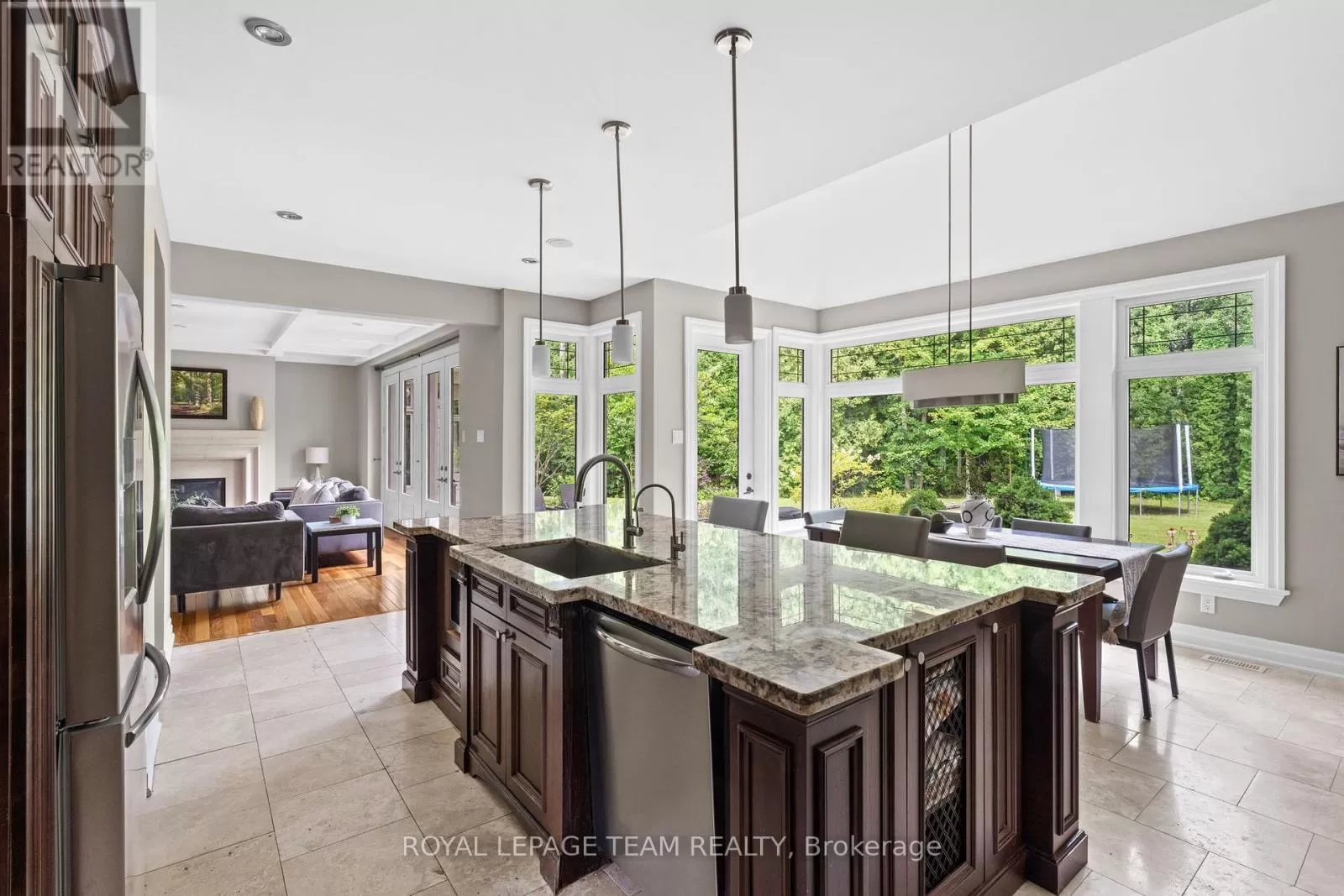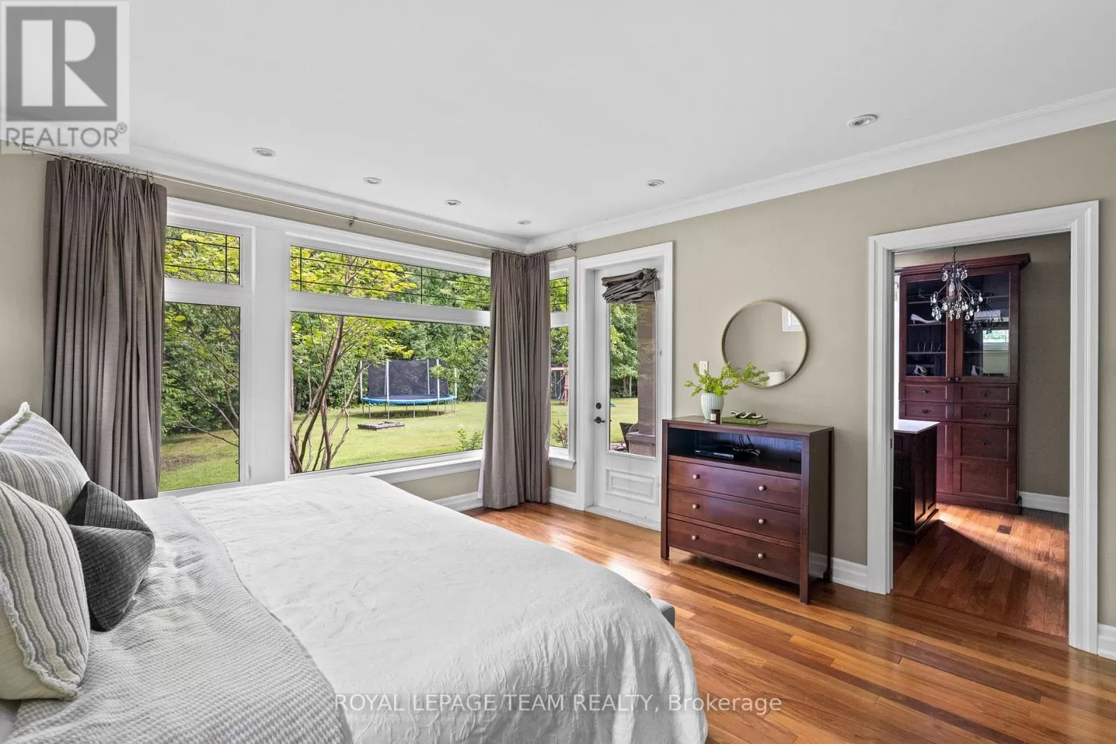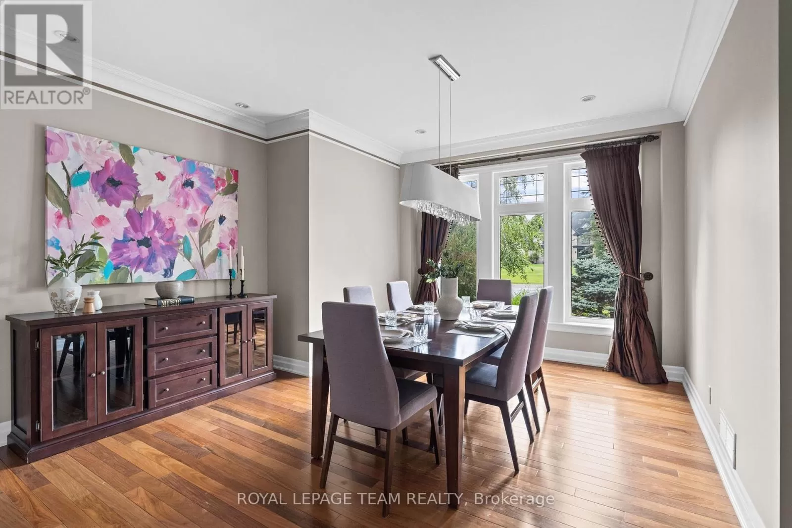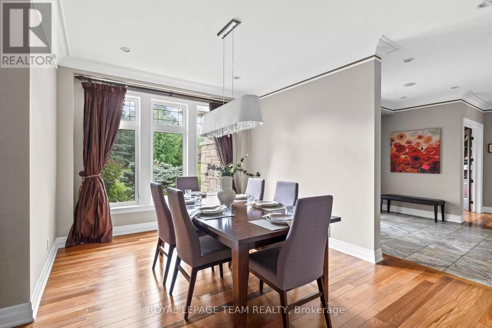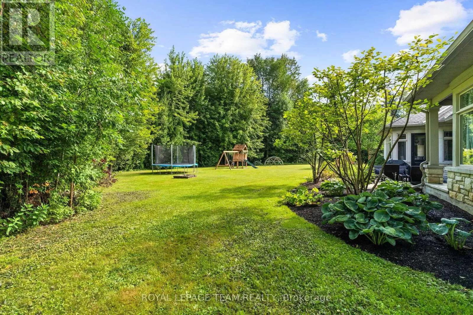 Cross Streets: Dozois Road. ** Directions: From Mitch Owen Road, turn onto Dozois Rd. Turn left onto Longshadow St. Longshadow St turns left and becomes Longhearth Way. Nestled in the South Point community of Manotick, this beautifully designed family home is set on an approximately 1.3-acre lot, offering both privacy and convenient access to boutique shops, restaurants, and cafés in the charming village of Manotick. The spacious layout boasts hardwood floors on the main and second levels, elegant mouldings, a living room enhanced by a coffered ceiling and natural gas fireplace, and a formal dining room well suited to family gatherings. The kitchen opens to the breakfast room and is appointed with custom cabinetry, granite countertops, a centre island, and a Butlers pantry. A wall of windows fills the space with natural light, creating a bright and welcoming atmosphere. A main-level office offers a quiet, dedicated space for working from home. The primary bedroom is privately located on the main floor and includes a walk-in closet and a well-appointed five-piece ensuite. Upstairs, three additional bedrooms and two full bathrooms, including one ensuite, provide comfortable accommodations for family and guests. The lower level expands the living space with a large recreation room, a full bathroom, a bedroom, and a flexible room in the finished design. Completing the property is a serene outdoor living space that includes a screened-in porch, ideal for quiet moments overlooking mature trees and a peaceful backyard. The exterior patio offers a comfortable setting for alfresco dining or gathering with friends, surrounded by landscaped gardens and natural greenery. (id:27476)