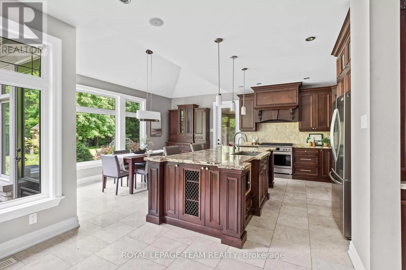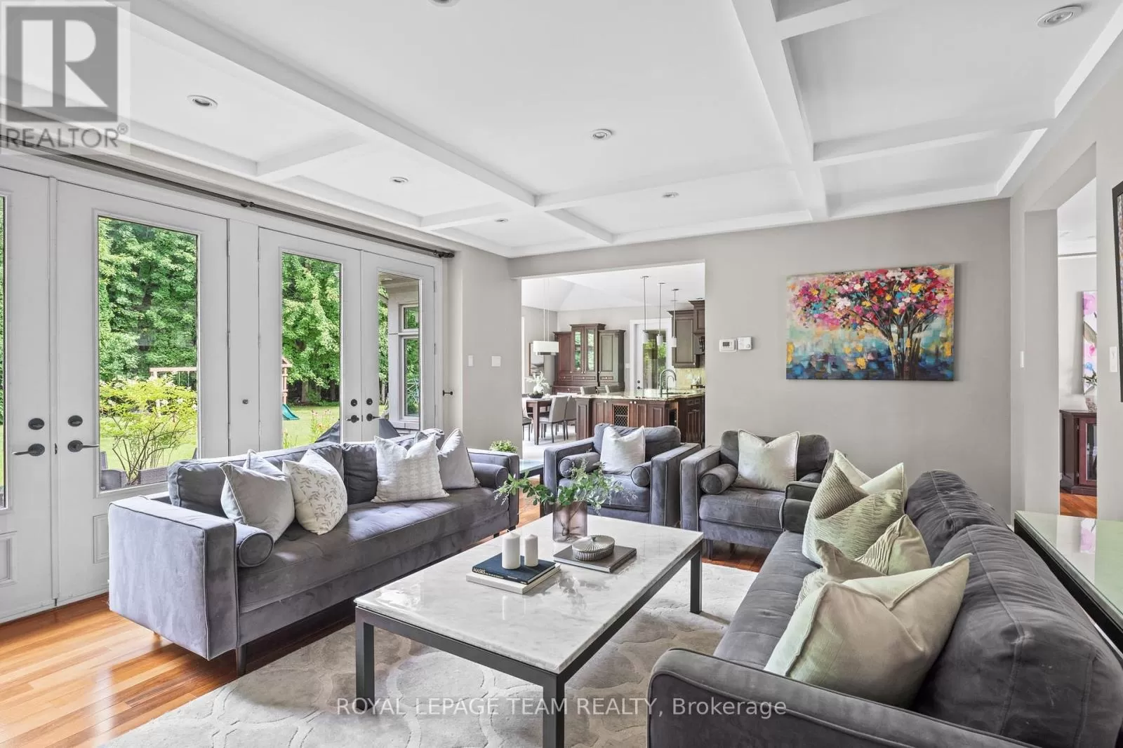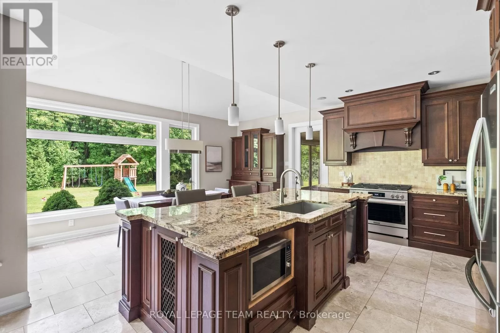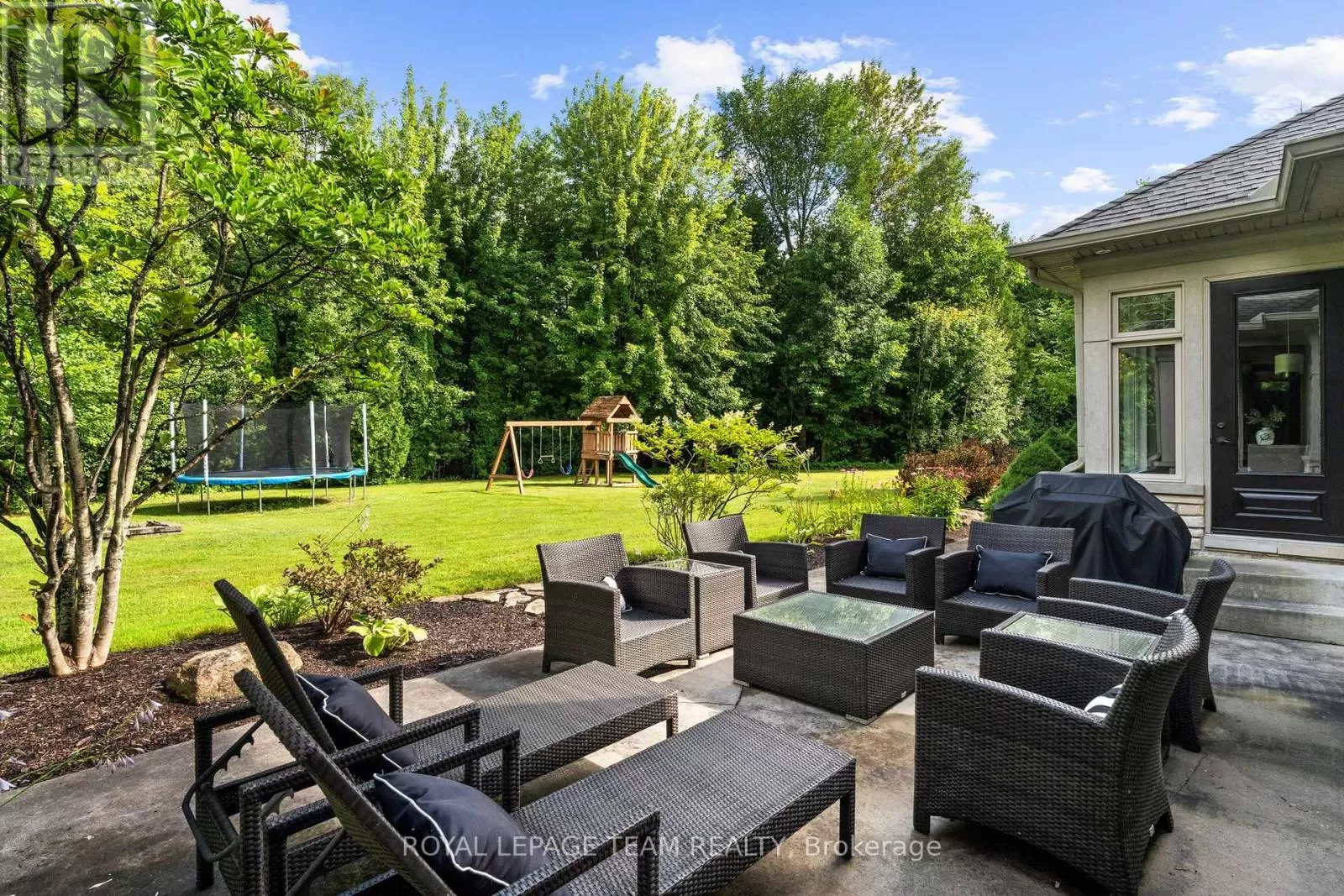 Cross Streets: Dozois Road. ** Directions: From Mitch Owen Road, turn onto Dozois Rd. Turn left onto Longshadow St. Longshadow St turns left and becomes Longhearth Way. Nestled in the South Point community of Manotick, this beautifully designed family home is set on an approximately 1.3-acre lot, offering both privacy and convenient access to boutique shops, restaurants, and cafés in the charming village of Manotick. The spacious layout boasts hardwood floors on the main and second levels, elegant mouldings, a living room enhanced by a coffered ceiling and natural gas fireplace, and a formal dining room well suited to family gatherings. The kitchen opens to the breakfast room and is appointed with custom cabinetry, granite countertops, a centre island, and a Butlers pantry. A wall of windows fills the space with natural light, creating a bright and welcoming atmosphere. A main-level office offers a quiet, dedicated space for working from home. The primary bedroom is privately located on the main floor and includes a walk-in closet and a well-appointed five-piece ensuite. Upstairs, three additional bedrooms and two full bathrooms, including one ensuite, provide comfortable accommodations for family and guests. The lower level expands the living space with a large recreation room, a full bathroom, a bedroom, and a flexible room in the finished design. Completing the property is a serene outdoor living space that includes a screened-in porch, ideal for quiet moments overlooking mature trees and a peaceful backyard. The exterior patio offers a comfortable setting for alfresco dining or gathering with friends, surrounded by landscaped gardens and natural greenery. (id:27476)