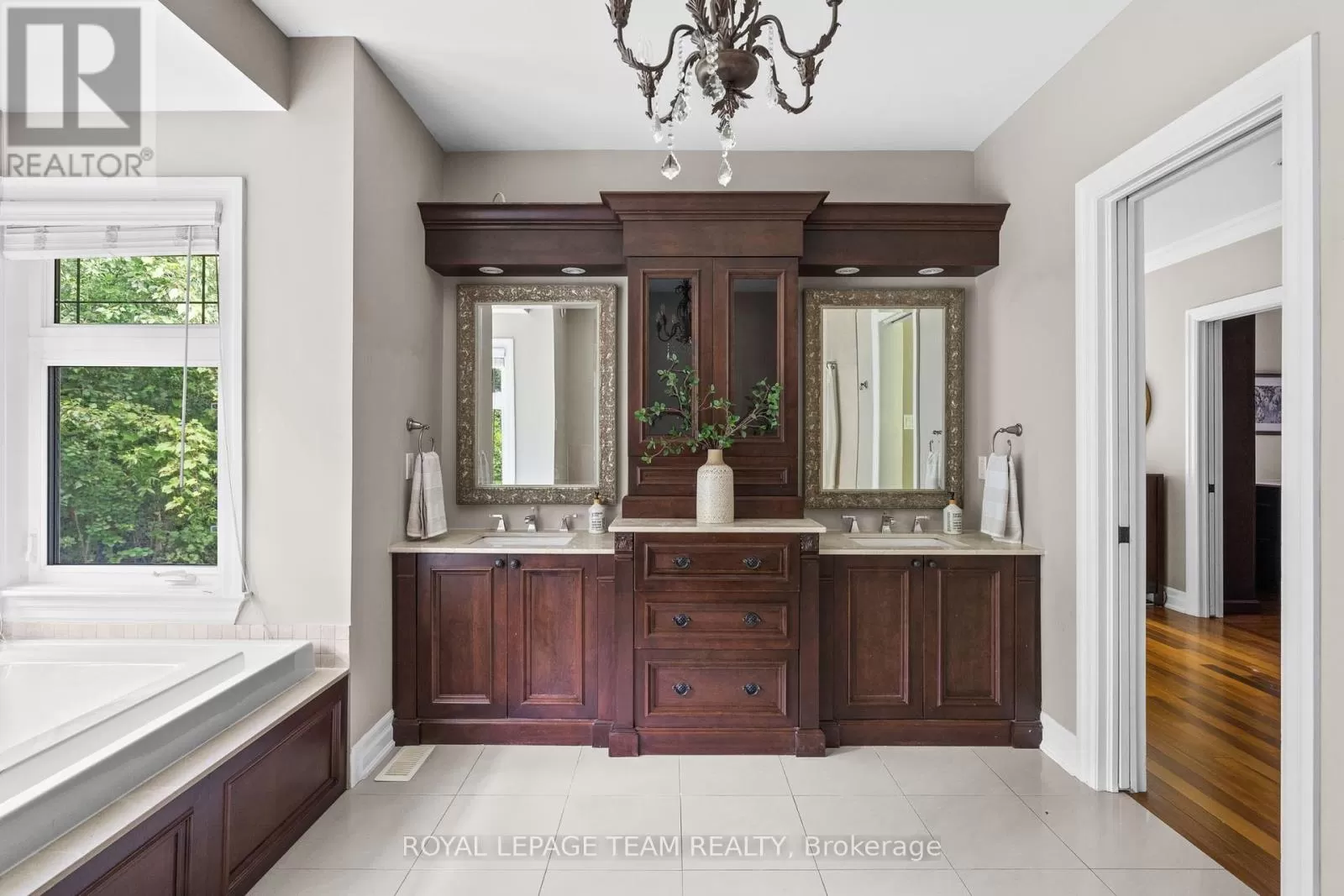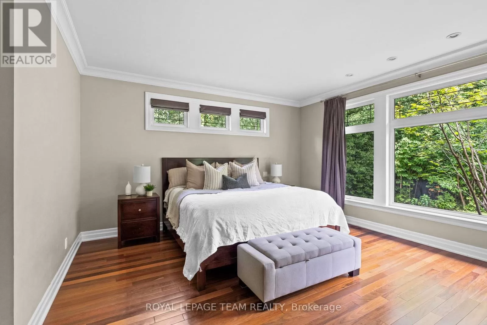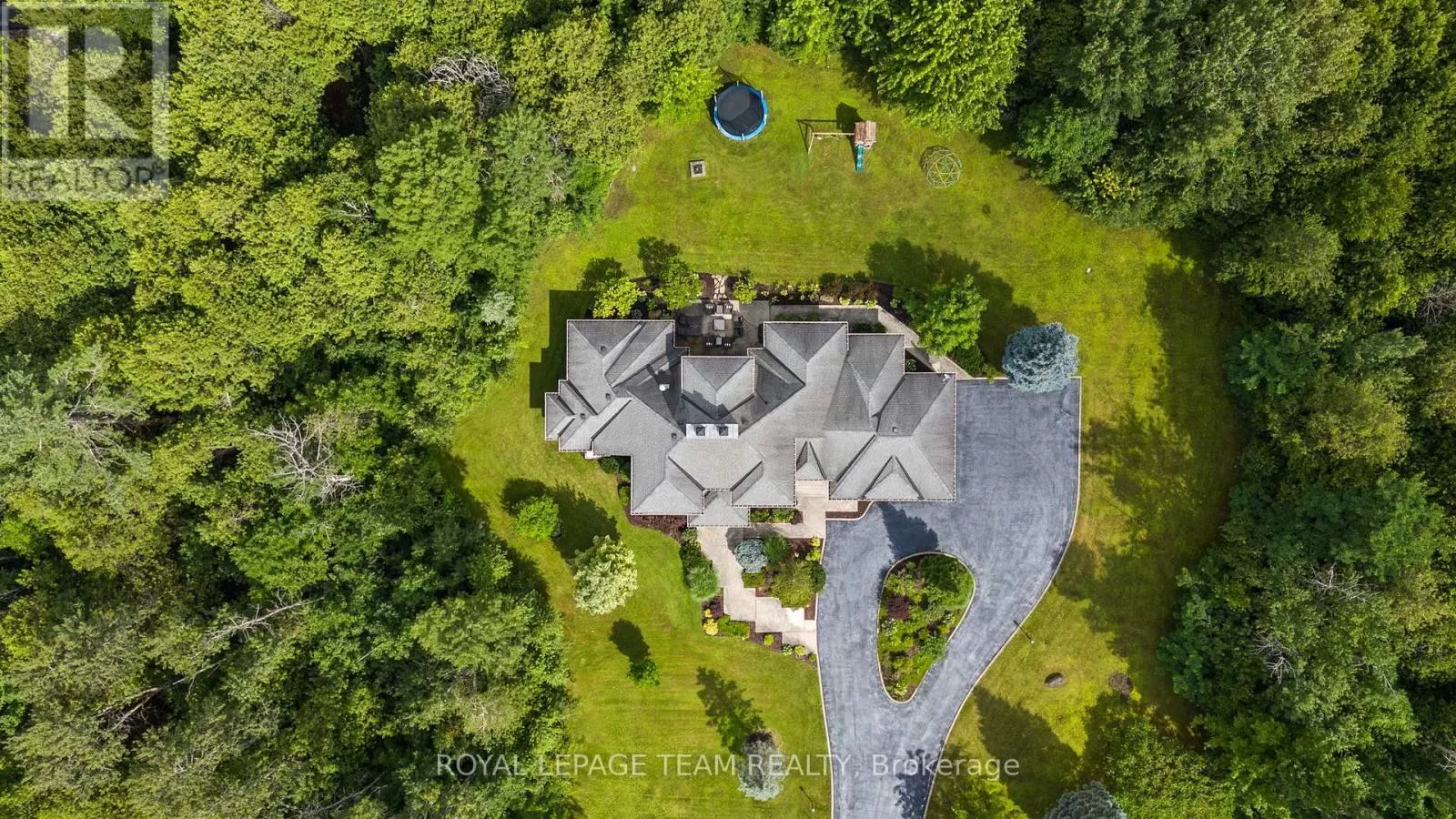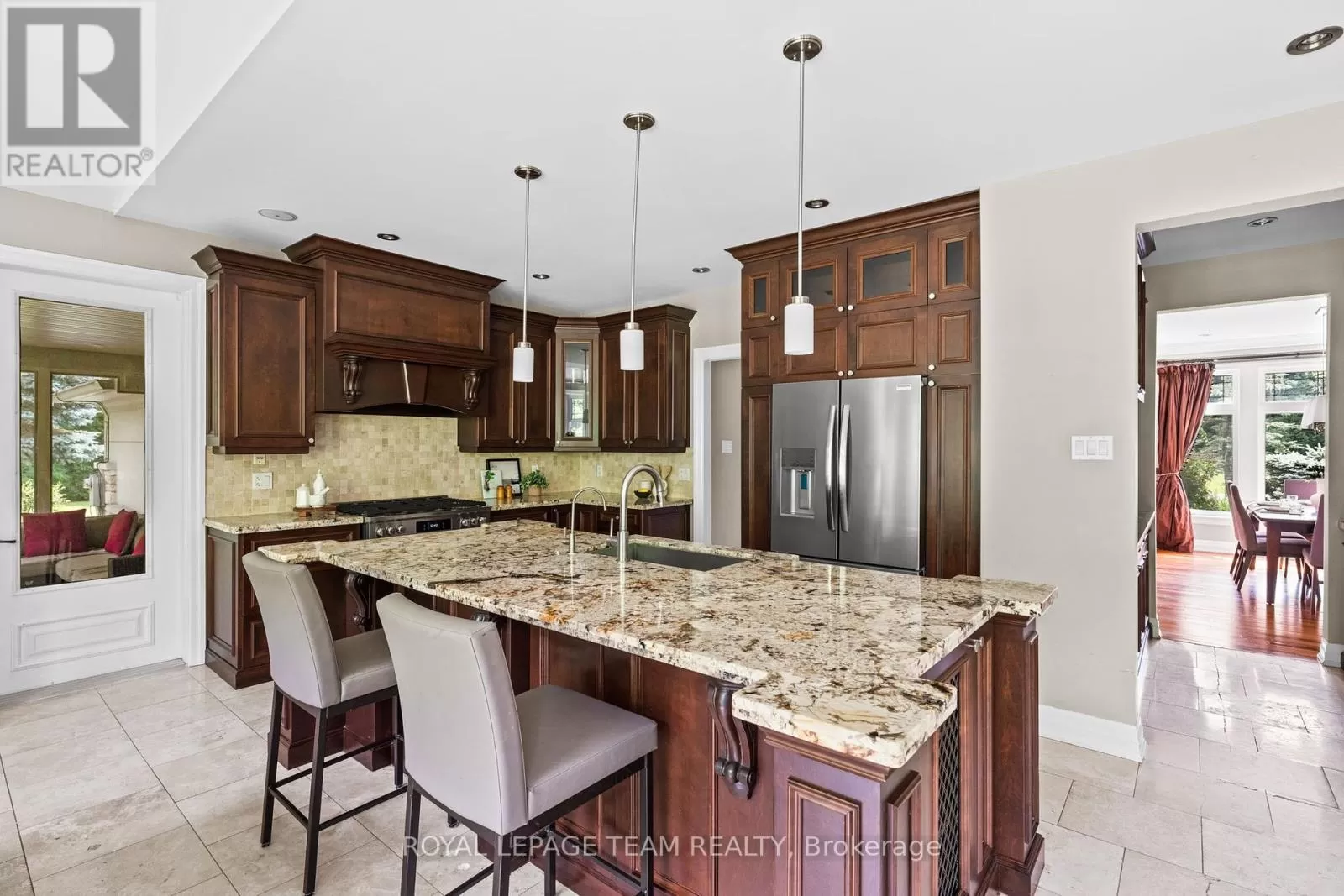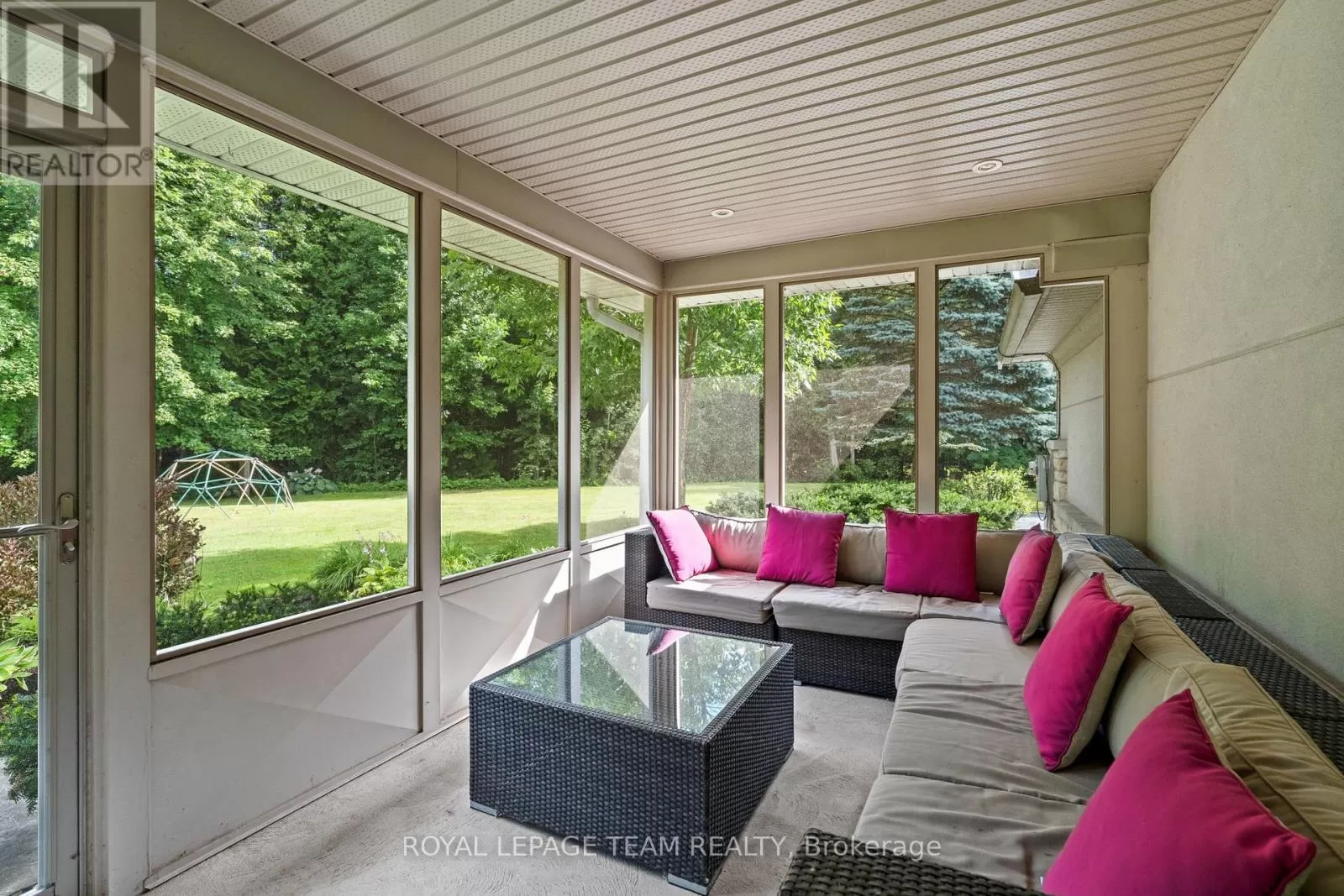 Cross Streets: Dozois Road. ** Directions: From Mitch Owen Road, turn onto Dozois Rd. Turn left onto Longshadow St. Longshadow St turns left and becomes Longhearth Way. Nestled in the South Point community of Manotick, this beautifully designed family home is set on an approximately 1.3-acre lot, offering both privacy and convenient access to boutique shops, restaurants, and cafés in the charming village of Manotick. The spacious layout boasts hardwood floors on the main and second levels, elegant mouldings, a living room enhanced by a coffered ceiling and natural gas fireplace, and a formal dining room well suited to family gatherings. The kitchen opens to the breakfast room and is appointed with custom cabinetry, granite countertops, a centre island, and a Butlers pantry. A wall of windows fills the space with natural light, creating a bright and welcoming atmosphere. A main-level office offers a quiet, dedicated space for working from home. The primary bedroom is privately located on the main floor and includes a walk-in closet and a well-appointed five-piece ensuite. Upstairs, three additional bedrooms and two full bathrooms, including one ensuite, provide comfortable accommodations for family and guests. The lower level expands the living space with a large recreation room, a full bathroom, a bedroom, and a flexible room in the finished design. Completing the property is a serene outdoor living space that includes a screened-in porch, ideal for quiet moments overlooking mature trees and a peaceful backyard. The exterior patio offers a comfortable setting for alfresco dining or gathering with friends, surrounded by landscaped gardens and natural greenery. (id:27476)