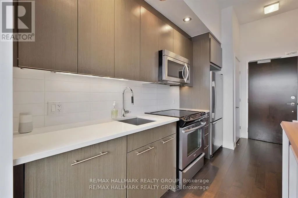 Cross Streets: Richmond Road. ** Directions: From Island Park west on Richmond Road, building is at the northwest corner of Richmond Road and Patricia Avenue. Modern 1-Bedroom Condo in the Heart of Westboro "Q-West" This contemporary 1 bedroom + 1 bathroom unit is in true move-in condition! With underground parking and a storage locker is perfectly situated in the vibrant heart of Westboro. Enjoy urban convenience with public transit, highway access, shopping, acclaimed restaurants, and the revitalized Westboro Beach all just steps away. The open-concept layout features a stylish kitchen complete with stainless steel appliances, quartz countertops, and high ceilings (main floor is 11") that flow seamlessly into the sun-filled living area. Oversized windows bathe the space in natural light, while in-suite laundry adds everyday convenience. Set on the main Floor raised above street level for added privacy and security this unit offers easy access without needing to use the elevator. With flexible possession available, its move-in ready. Q-West offers resort-style amenities including: * Rooftop terrace with stunning views of the Gatineau Hills *Outdoor dining & lounge area *Home theatre, party room, and a private courtyard *Fitness centre, yoga room, sauna & steam room *Pet grooming station, ski tuning area, and ample bike storage *Full-time superintendent for added peace of mind *Bonus: No rear Neighbours (Bank Note Company parking lot is typically empty evenings & weekends). Live your best life in one of Ottawa's most sought-after neighbourhoods. Whether you're walking to your favourite cafe, dining al fresco, or taking a dip in the Ottawa River (at Westboro Beach), this unit is condo. living at its finest. (id:27476)