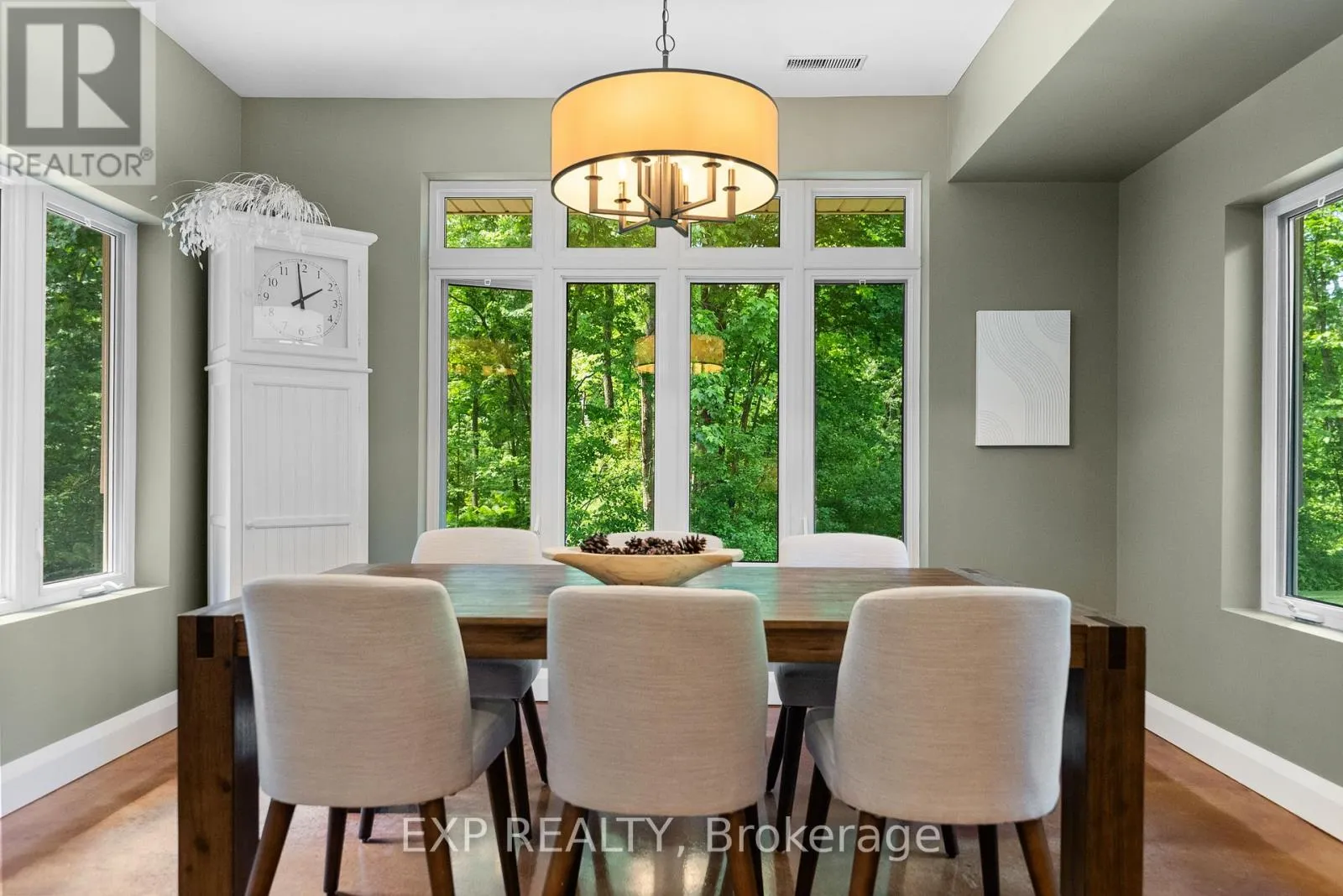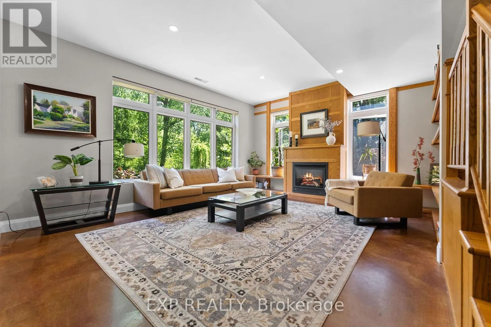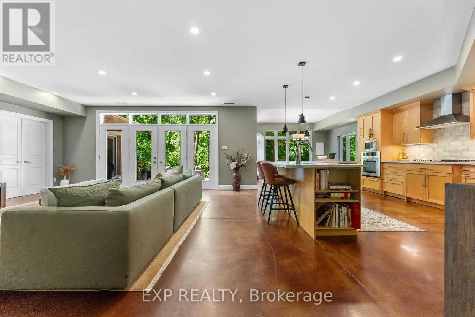 Cross Streets: Dozios & Gough. ** Directions: From Mitch Owens Drive turn onto Dozois. Then left onto Queenscourt Cres. #5758 will be on the left. Prestige. Privacy. Perfection. Welcome to 5759 Queenscourt Crescent in the exclusive Rideau Forest of Manotick, where timeless design meets modern comfort on a breathtaking 4.4-acre estate. This custom-built 2006 Prairie-style residence offers over 4,600 sq. ft. of beautifully crafted living space, complete with 5 bedrooms, 4 bathrooms, and a 3-car attached garage. The homes energy-efficient ICF construction and heated polished concrete floors ensure year-round comfort and efficiency. The heart of the home is the spectacular open-concept kitchen showcasing custom cabinetry, an oversized island, and gleaming quartz countertops flowing seamlessly into the sun-filled great room. Just steps away, the spacious main-level in-law suite is a rare find, offering its own private entrance, living area, bedroom, and bathroom. Ideal for multi-generational living, visiting family, or even a private home office, it blends independence with connection under one roof.Floor-to-ceiling windows throughout bring the outdoors in, flooding every room with natural light and framing serene views of the surrounding forest. Upstairs, the luxurious primary suite is your personal sanctuary featuring a generous sitting area, natural gas fireplace, spa-inspired ensuite, and a large walk-in closet. A spacious office, an additional bedroom, and a full bath complete the second level.All of this in one of Ottawas most prestigious neighborhoods just minutes to Manotick Village, golf, the Rideau River, and a quick commute to downtown. (id:27476)