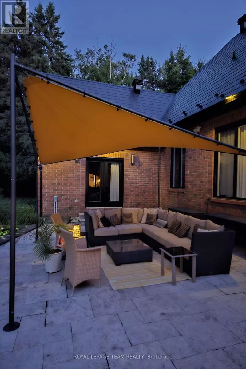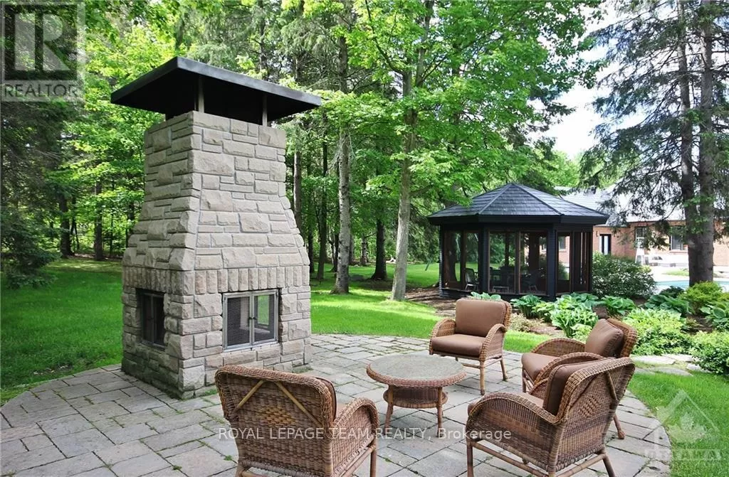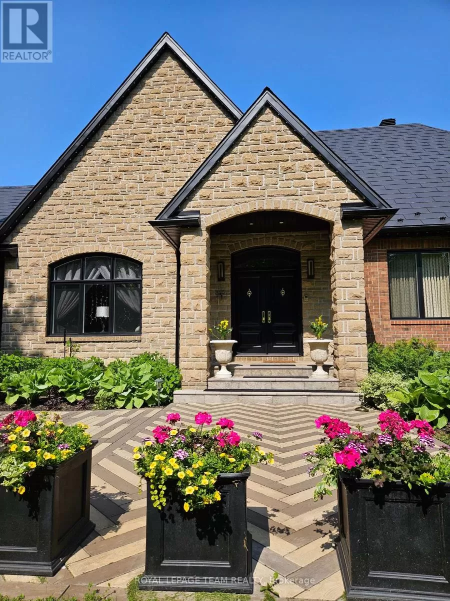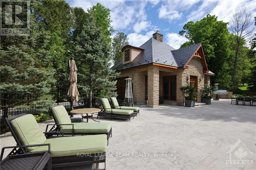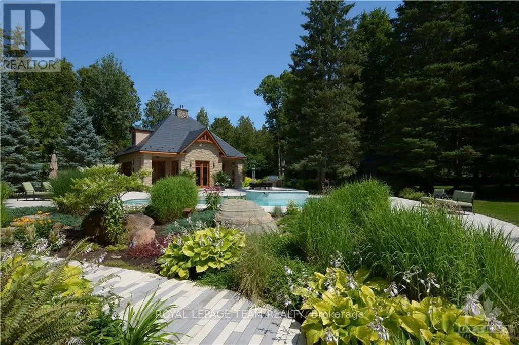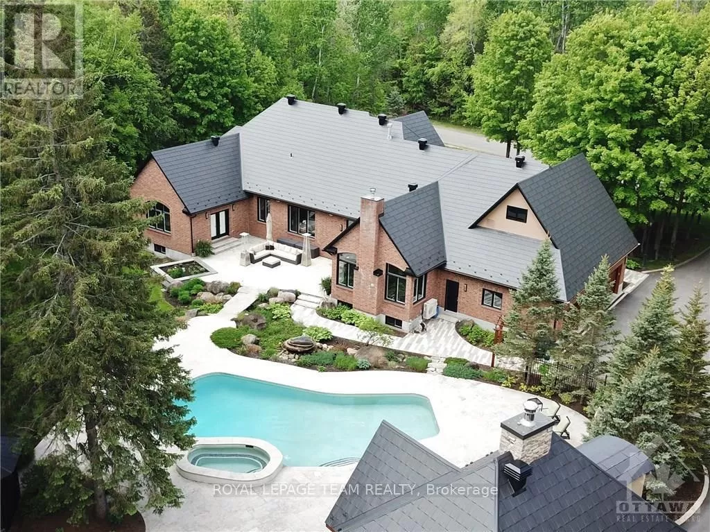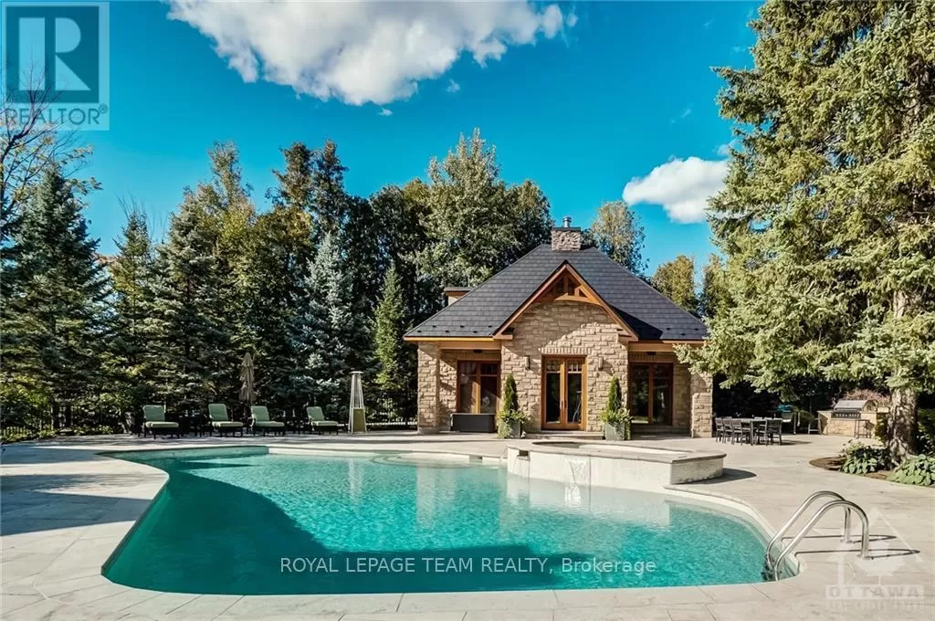 Cross Streets: Limebank Rd. South from Hunt Club and Riverside, cross over Mitch Owens at St. Marks High School it becomes Dozois, to Gough Rd. LEFT, then first LEFT onto Queenscourt Cres. #5849 on LEFT side of Queenscourt. No Sign on the Property. ** Directions: Mitch Owens Rd. South on Dozois at St. Mark's HS, left on Gough Rd. Left on Queenscourt Cres. House is near the end on the left #5489. Experience the epitome of luxury living in this stunning Bungalow nestled on a private, treed & landscaped 2+ Acre lot, in prestigious Rideau Forest. Meticulously crafted, its sweeping floor plan and 10 ft ceilings are sure to impress. A state of the art kitchen with all Miele appliances including; side by side fridge/freezer, 8 burner gas stove, steamer oven, microwave/convection ovens. A raised granite hearth with gas burning fireplace in the attached family room provides the perfect ambience. Eat in area + breakfast bar. Livingroom gas fireplace with marble facade, leather look tile flooring. Family room with heated floors, formal dining room to easily accommodate seating for 12. Primary suite with custom closets plus a walk in & luxurious ensuite w/double shower and make up vanity. Exquisitely finished lower level features radiant floor heating & gas fireplace with marble facade. Spectacular entertainment area w/wet bar, fridge, dishwasher, wine cellar, extra bedroom with full ensuite bath and custom cabinetry, plus another 3-piece bath, cedar lined closet for outerwear, massive storage room w/metal shelving, home gym, & billiards area. From the kitchen/family room walk out to the professionally landscaped gardens, featuring a bubbling rock, an inground heated pool with spa, surrounded with white limestone. Enjoy the custom cedar gazebo w/ceiling fan, wired with outdoor speakers, a dining pergola, next to the outdoor bar and outdoor kitchen. Enjoy campfires at the outdoor fireplace, a commercial swing set for adults and children alike, a tree house and still a massive yard fully fenced for the kids and pets to run free. Enjoy the 3 car garage with inside access to the laundry/mud room. Metal roofs on all buildings. Bluetooth enabled permanent soffit lighting is installed. As a bonus, a 2-level finished Guest House includes a living room, kitchenette, 1.5 baths, a bedroom upstairs, plus extra storage. It's like living in your own resort. (id:27476)
