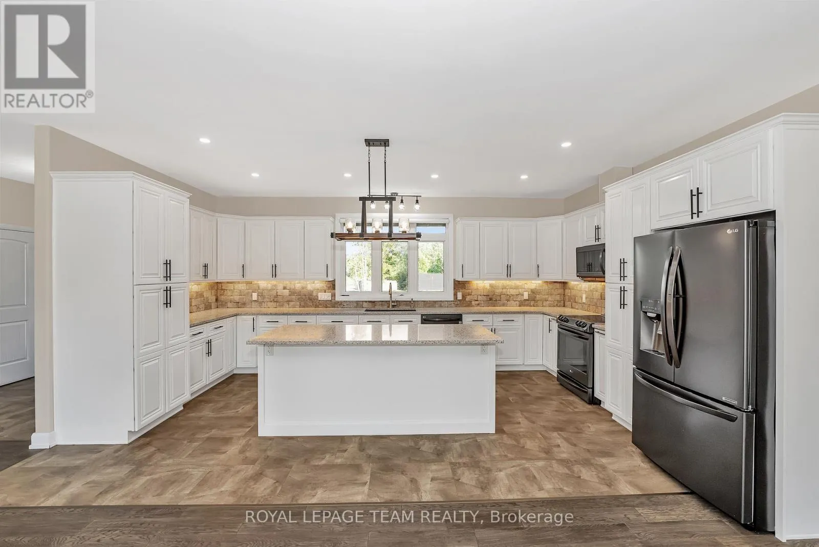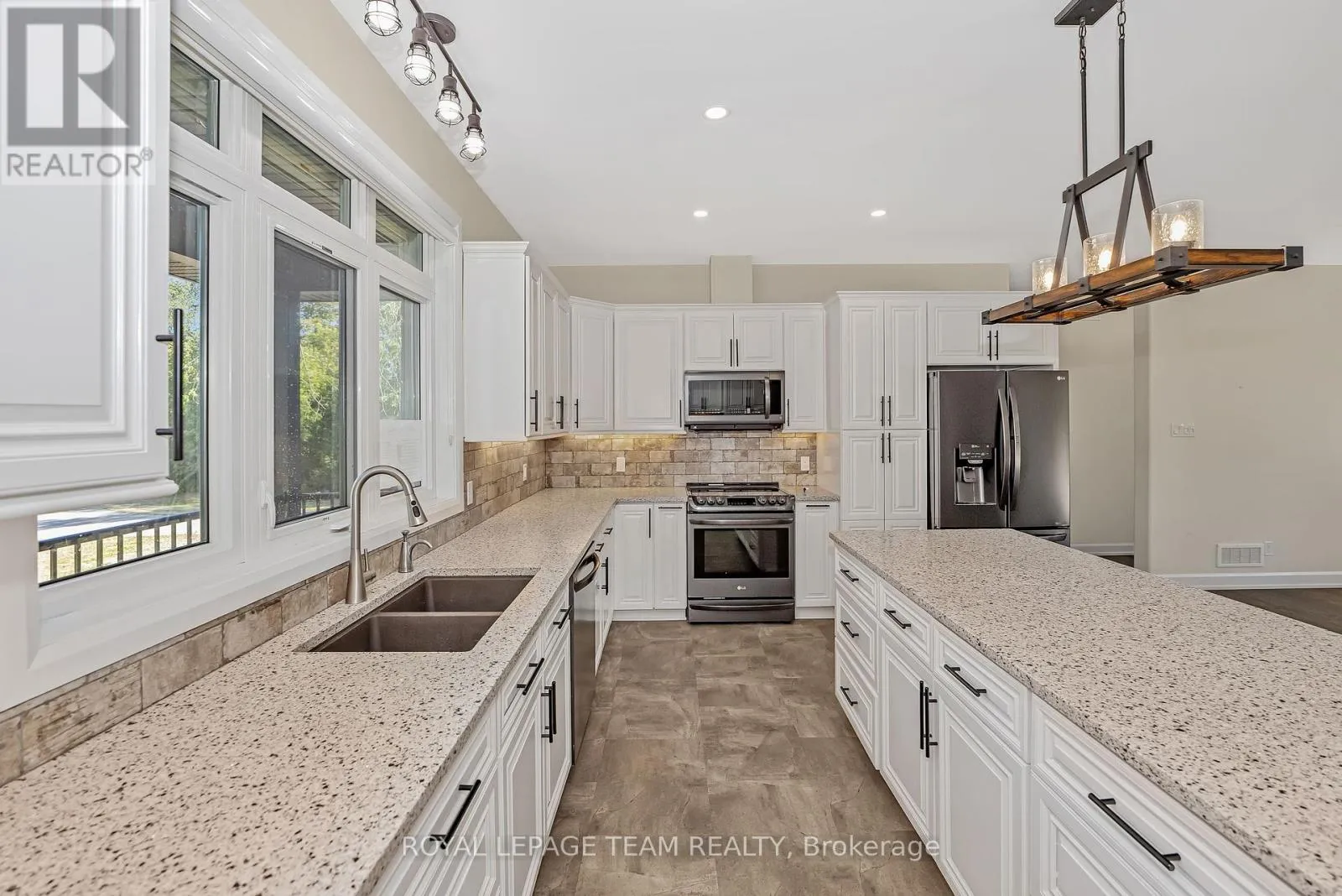Cross Streets: Snake Island/Stagecoach. ** Directions: Snake Island Road to Kearns Way. Elegant Estate Bungalow on Quiet Cul-de-Sac - Welcome to this beautifully appointed 3+2 bedroom estate-style bungalow, nestled on a peaceful cul-de-sac perfect for families seeking comfort, space, and sophistication. Main Level Highlights. Step into an open-concept living area anchored by a dramatic floor-to-ceiling fireplace, ideal for cozy evenings or hosting memorable gatherings. Rich hardwood and tile flooring flow throughout, leading to a covered porch that overlooks the serene backyard. The chef-inspired kitchen features gleaming quartz countertops, a striking island with breakfast bar, under-cabinet lighting, and abundant cabinetry for effortless organization. The spacious primary suite offers sliding doors to the porch, a luxurious 5-piece ensuite, and a generous walk-in closet. Two additional bedrooms share a stylish Jack-and-Jill 5-piece bathroom, perfect for kids or guests. A thoughtfully designed main-floor laundry room includes a sink, counters, and cabinetry for added convenience. Lower Level Comfort - The finished basement expands your living space with two more bedrooms, a full 4-piece bath, and a sprawling recreation/family room, ideal for extended family, guests, or a home theatre setup. Garage Goals - Car enthusiasts and hobbyists will love the oversized 4-car garage, complete with a loft and ample storage space. This listing consists of two separate parcels of land, PIN 043151258 and PIN 043151268, being sold together as one offering, with a combined total of 2.593 acres. Some photos virtually staged. (id:27476)