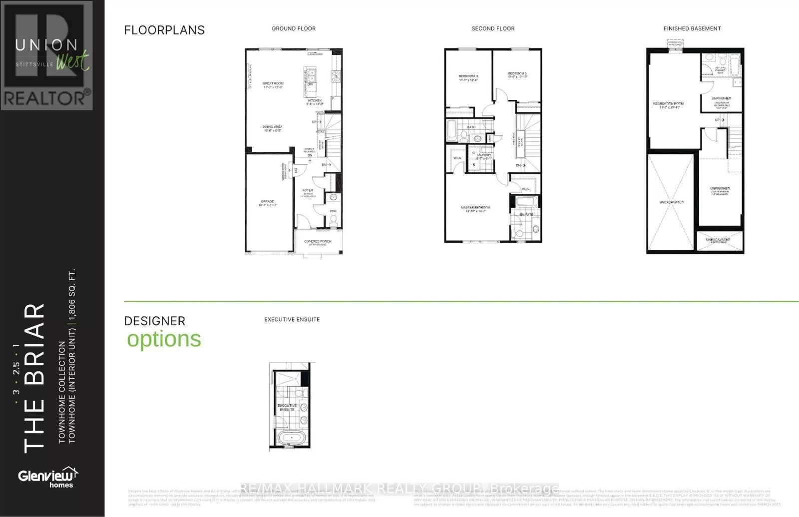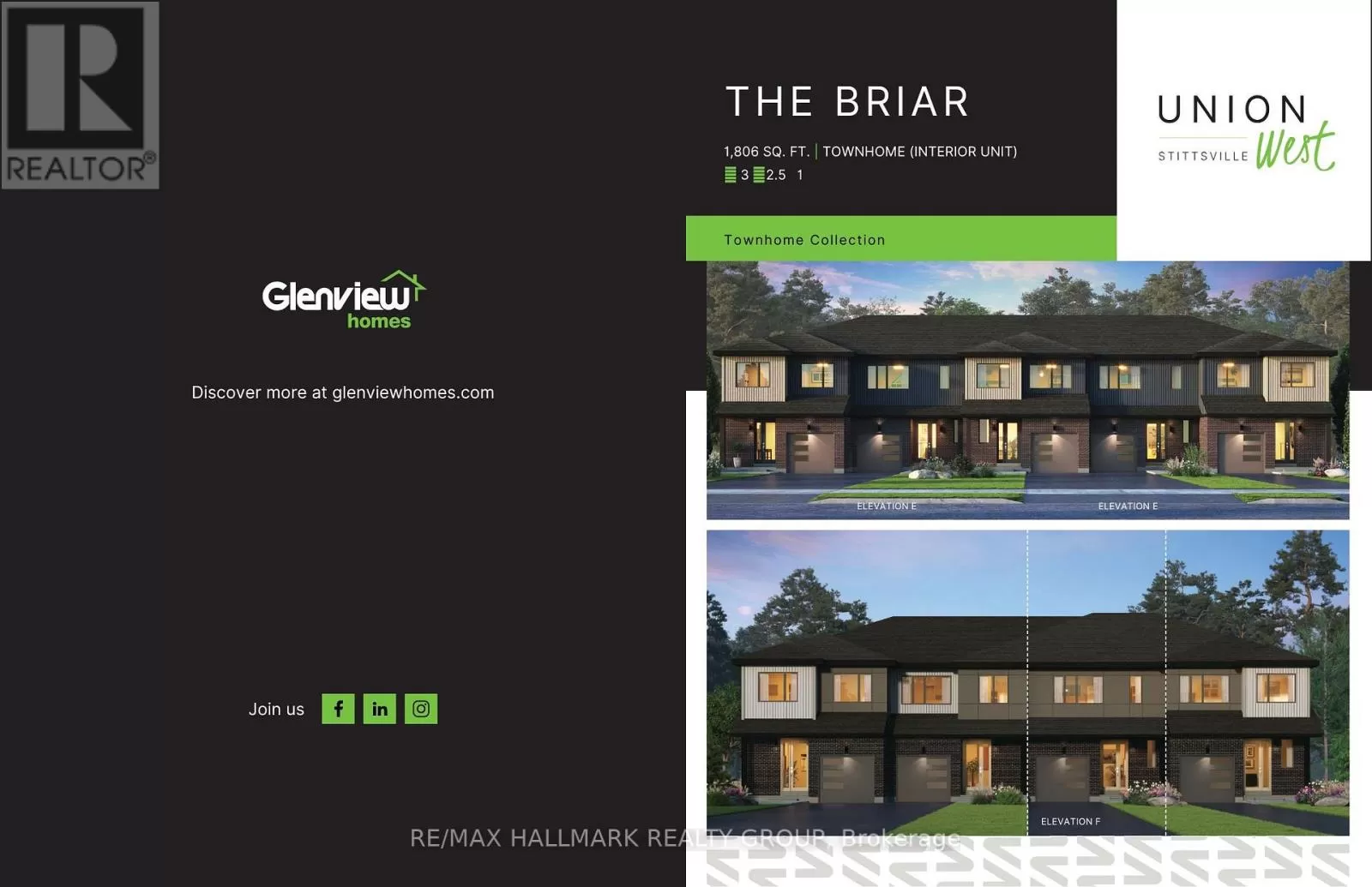 Please visit the Union West Sales Center located at 6147 Fernbank Road Stittsville, ON K2S 1K4 Property location as per Site Plan attachment, Block 54.3 Welcome to Union West - A Move in the Right Direction!Discover the Briar (E) model by Glenview Homes, offering 1,806 sq ft of thoughtfully designed living space, including a 232 sq ft finished basement. This stunning townhome perfectly blends modern style with everyday functionality.Step into the open-concept main floor, elevated by 9-foot smooth ceilings and 7-1/2" wood composite core flooring, flowing seamlessly into the upgraded kitchen. The kitchen boasts quartz countertops in both the kitchen and bathrooms, an enhanced kitchen design featuring pots and pan drawers, 39-inch uppers, and soft-close cabinets. Additional conveniences include a microwave/hood fan combo option, a water line for the refrigerator, and a pot light package illuminating the kitchen and great room.Upstairs, retreat to the luxurious primary bedroom with dual walk-in closets and a bright ensuite complete with a deluxe glass walk-in shower. Two large secondary bedrooms, a spacious full bathroom, and the convenience of second-floor laundry complete the second level.The finished basement offers a versatile rec room featuring an oversized window that brings in abundant natural light, creating a perfect space for family fun, entertaining, or a quiet retreat.Here's the extra something you'll love: this home includes central A/C for comfort year-round.At Union West, you'll thrive in a vibrant, family-friendly community where local shops, restaurants, schools, and recreation centres are seamlessly intertwined with parks, trails, and green spaces. With easy access to transit and just minutes from Ottawa's world-class entertainment venues, this is more than just a home - it's the perfect place to plant your roots. (id:27476)