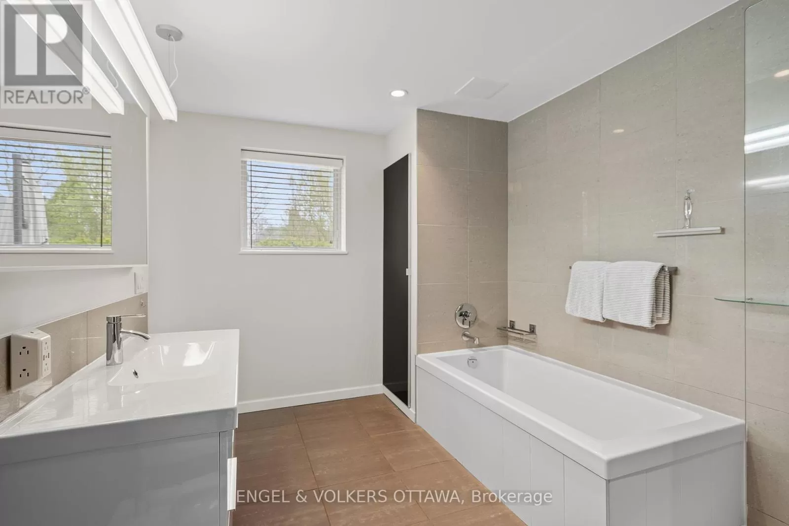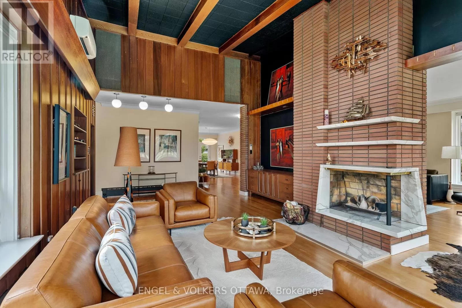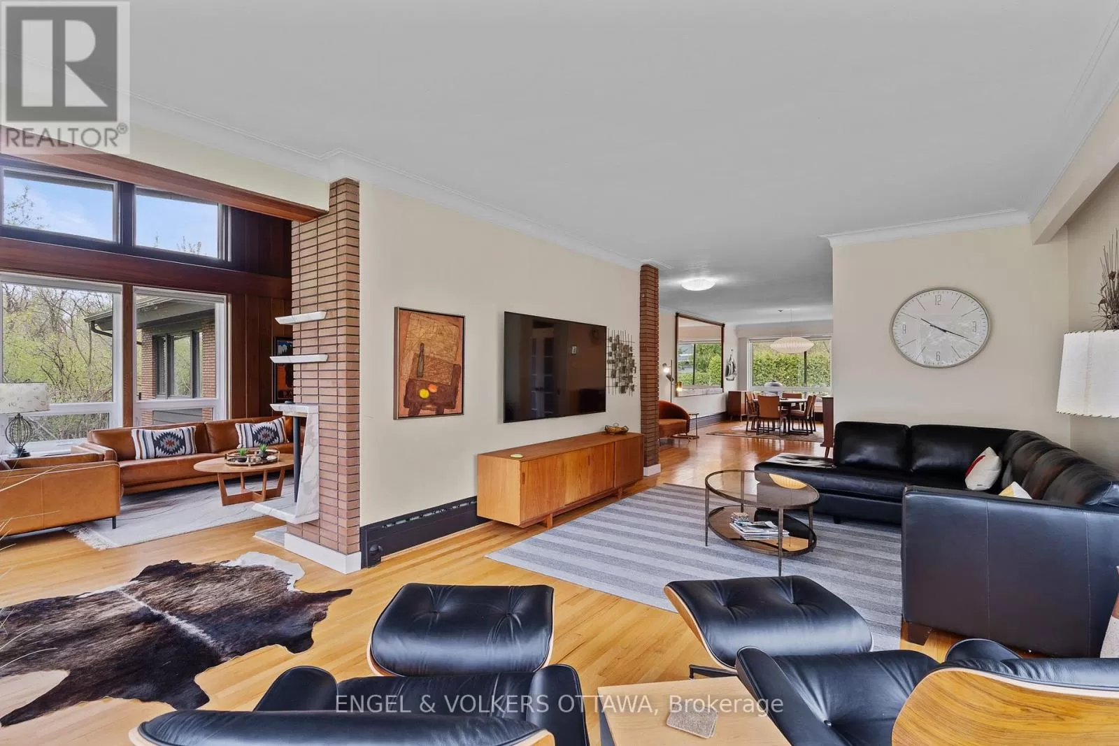 Cross Streets: From Kichi Zibi Mikan & Island Park Dr. ** Directions: From Kichi Zibi Mikan turn onto Island Park Dr. A mid-century modern piece of art that you can live in! Positioned on an expansive lot bordered on three sides by NCC-protected Crown land, this bungalow blends iconic design with modern updates, set in one of Ottawa's most prestigious locations along Island Park Dr. The home's bold curb appeal features clean rooflines, a classic red brick facade, and a statement yellow front door. The professionally landscaped front yard offers manicured gardens, irrigation, and landscape lighting. Inside, the home opens to light-filled living spaces w/ hardwood floors, oversized windows, & clean architectural lines. The two living spaces, anchored by a gas fireplace with a stone surround, flow seamlessly to the dining area & private backyard. The kitchen impresses w/ glossy blue cabinetry, granite counters, stainless steel appliances, & a bright breakfast nook overlooking the front yard. The primary suite features garden doors to the rear deck, a feature wall in navy tones, & an ensuite with a soaker tub, glass shower, & heated floors. Two additional bedrooms, one with an updated ensuite, offer privacy & comfort for family or guests. The finished lower level extends the living space w/ a large recreation area, media zone, home office nook, & an additional bedroom w/ a full bathroom & direct exterior access. An additional room off the main rec area provides the perfect space for a gym or workshop, while multiple large storage areas provide all the space you'll need. Step outside to your private backyard w/ a maintenance-free deck, covered dining & lounging zones, tiered planters, interlock, & landscape lighting, which create an ideal setting for entertaining or relaxing. Located in the heart of Champlain Park, this home offers quick access to recreational trails, the Ottawa River, & community amenities including an outdoor rink, pool, and social events while being a short walk to Westboro, Wellington Village, or Hintonburg for cafés, dining, & boutique shopping. (id:27476)