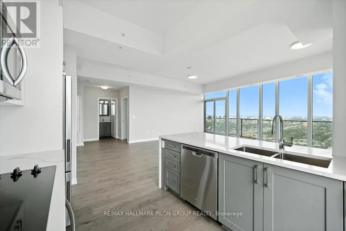 Cross Streets: Preston / Carling. ** Directions: Preston to Carling. Torn between the joys of lakeside living and the vibrance of city life? At The Claridge Icon, Ottawa's tallest landmark, you are invited to indulge in both, without compromise. This 1290 square foot BABY PENTHOUSE is a statement of modern elegance. Framed by sweeping floor-to-ceiling windows and soaring 9ft ceilings, the residence is immersed in natural light, offering an ever-changing panorama, from the rolling Gatineau Hills and fireworks over Parliament Hill to the glittering city skyline and sparkling view of Dow's Lake. The expansive wraparound balcony, with SOUTHERN AND EASTERN EXPOSURES, becomes your private front-row seat to it all. Hardwood floors carry throughout the open and airy plan, anchored by a crisp white kitchen with a striking WATERFALL ISLAND. The primary suite easily ACCOMODATES A KING BED and enjoys calming views of Dow's Lake with a private balcony, a walk-in closet, and a spa-inspired ensuite with totally upgraded finishes. A second bedroom and full bath echo the same attention to quality. Modern convenience is woven into the space with in-suite laundry and the inclusion of a locker and coveted parking spot. Residents of the icon enjoy WORLD CLASS AMENITIES including 24/7 concierge service, private guest suites, a state-of-the-art fitness and yoga studio, an indoor pool, theatre room, bike room, sauna, BBQ area and terrace along with a curated collection of social and entertaining spaces. Just outside your door, discover some of OTTAWA'S FINEST DINING in Little Italy, stroll or bike along the gardens of Commissioner's Park, kayak on Dow's Lake, and enjoy effortless access to transit and entertainment. Here, life at the top isn't just about the view, it's about a vibrant and full lifestyle. Some photos virtually staged. (id:27476)