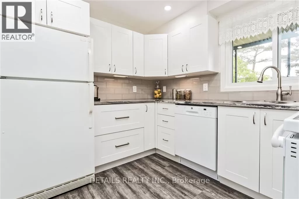 Cross Streets: Orleans BLVD. ** Directions: Jeanne D'Arc to North on Bilberry, building on the left hand side at the end of Bilberry. 2 bedroom 2 bathroom one level END UNIT condo located steps from wilderness, Ottawa River, shopping, buses and quick access to HWY 417. Combined dining room and living room with custom made roller shade, laminate floors and access to patio doors that lead to a covered and screened in balcony with stunning view of woods and nature. Renovated custom kitchen 2019 with loads of countertops and cabinetry, convection oven and dishwasher 2019, ceramic back splash and luxury vinyl floors. Oversized walk-in pantry/storage closet. Master has laminate floors, wall of closets and 4pc ensuite. This is a very well run condo and a very clean and quiet building. Comes with storage unit. Access to bike storage room. 1 parking spot. Flooring: Laminate (id:27476)