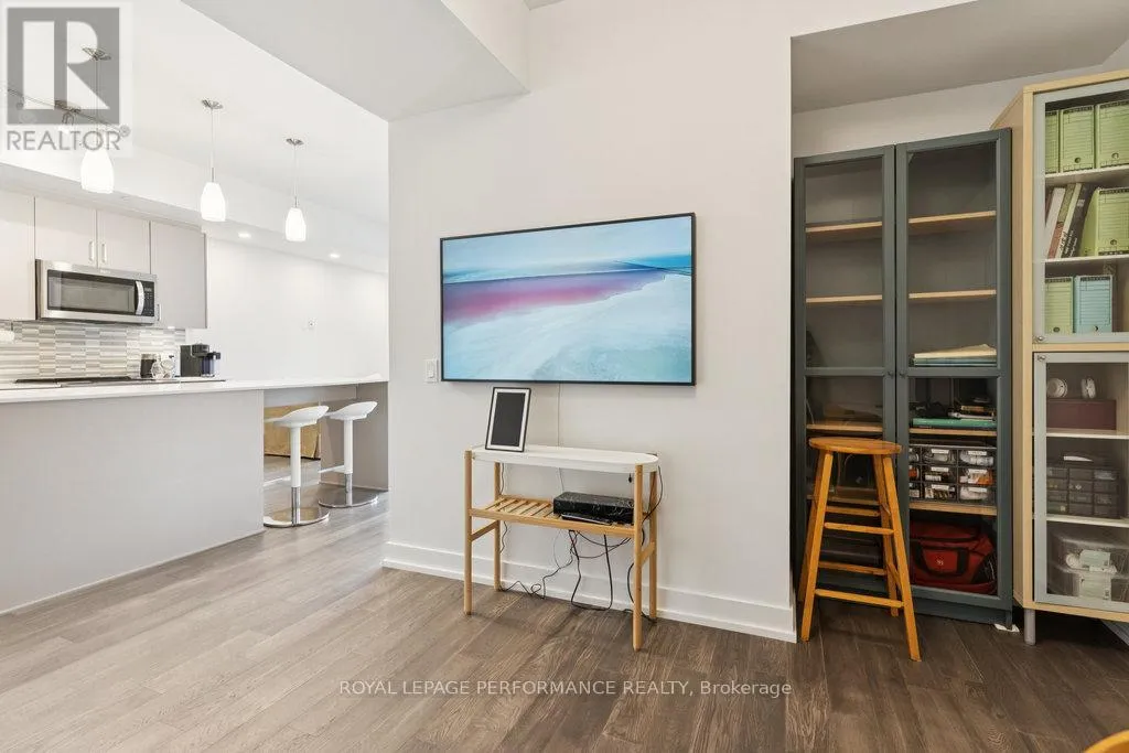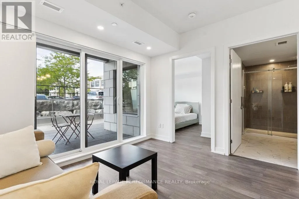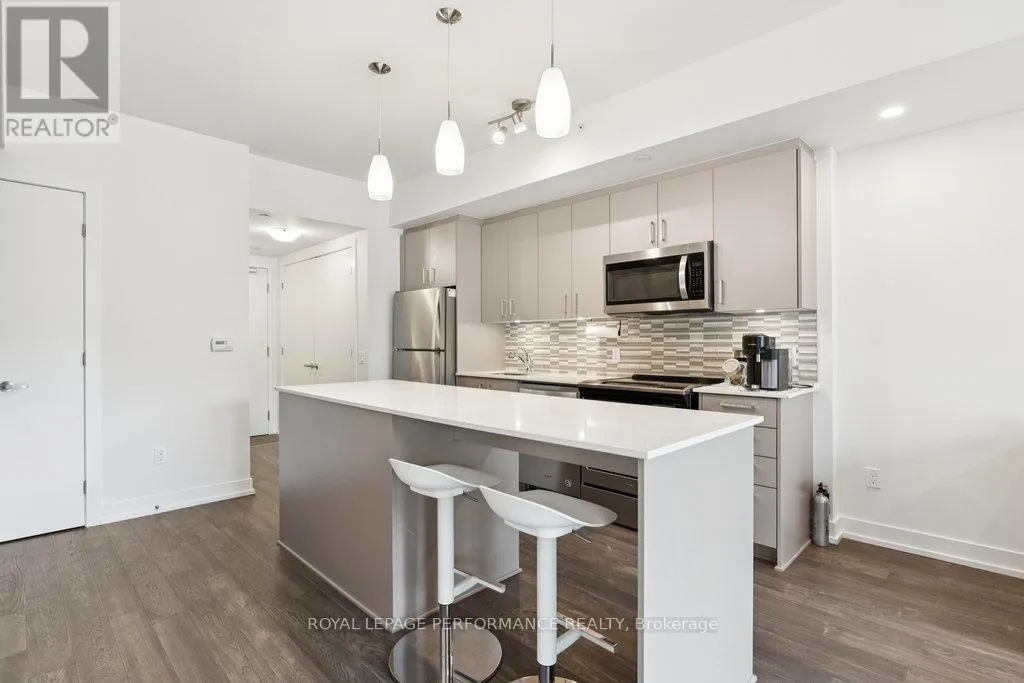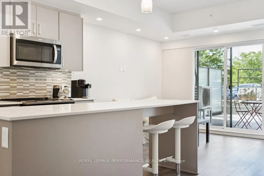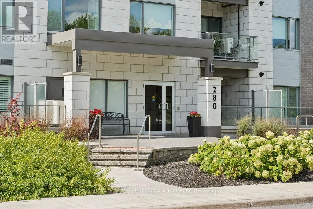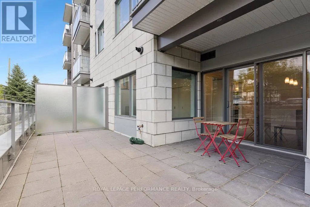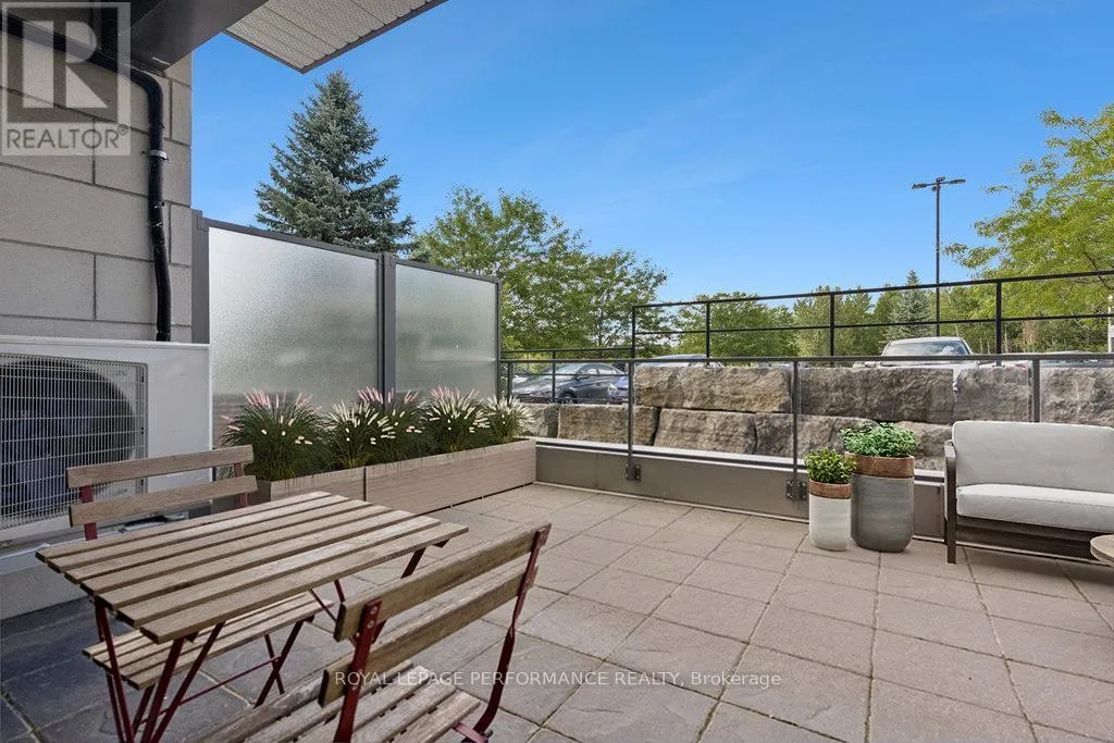 Cross Streets: Terry Fox Dr and Herzberg Rd. ** Directions: From March Rd to Herzberg Road. Welcome to 104-280 Herzberg! This stylish ground-level 1-bedroom plus den condo in The Serenity offers 729 sq. ft. of thoughtfully designed living space with premium finishes throughout. Step inside to discover 9' ceilings, wide-plank hardwood flooring, and a modern neutral palette that creates an airy, inviting atmosphere. The open-concept kitchen boasts sleek grey cabinetry, quartz countertops, stainless steel appliances, and a large island with seating that also serves as extra prep space. The versatile den is perfect for a home office or additional living area, while the spa-inspired bathroom features a glass shower with rain head, porcelain tile, and a quartz vanity. A true highlight is the spacious private terrace, ideal for entertaining, outdoor dining, or simply relaxing in a tranquil setting backing onto NCC green space. Additional conveniences include in-unit laundry, heated underground parking, and a storage locker. Residents of Serenity Condos also enjoy access to a rooftop terrace with forest views, a fitness centre, bike storage, and more. Perfectly located near golf at The Marshes, scenic trails (including a 4 km trail just steps from your door), as well as shopping and dining, this home offers the ideal blend of comfort, style, and convenience. Find floor plans, the status certificate, and more details at nickfundytus.ca. (id:27476)