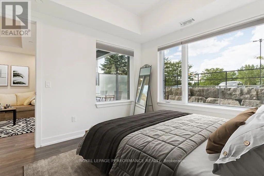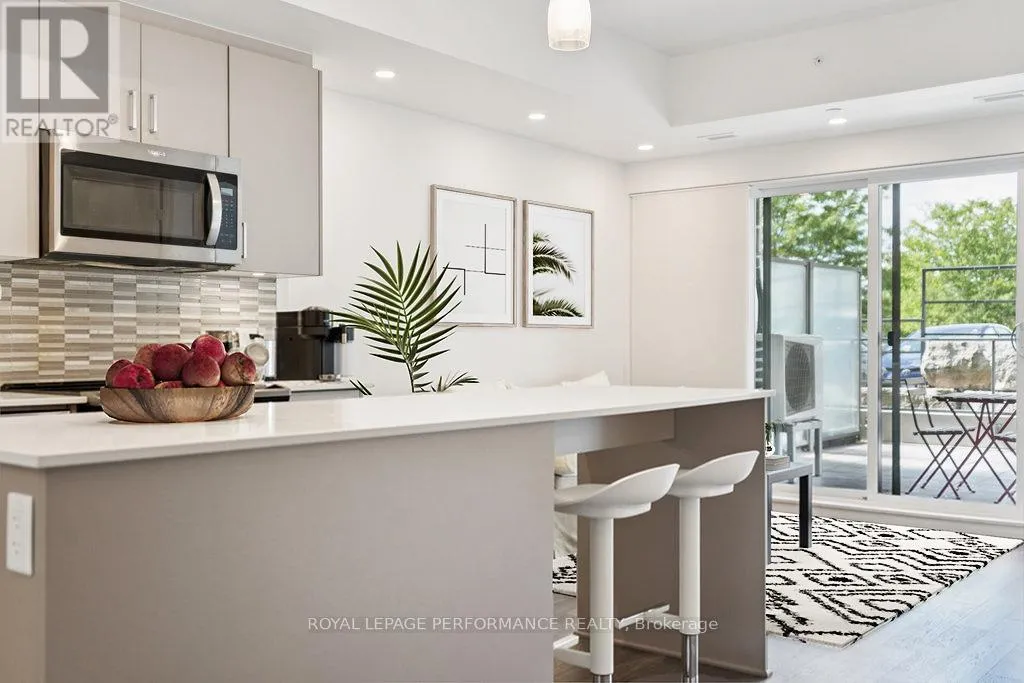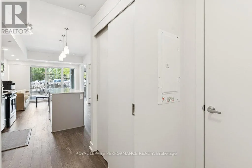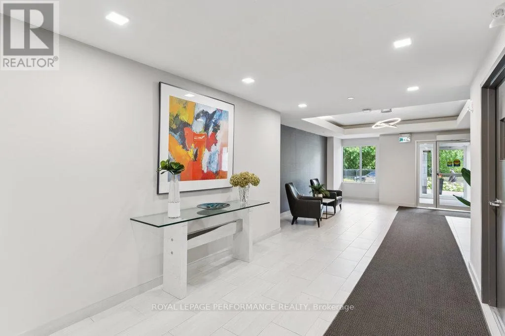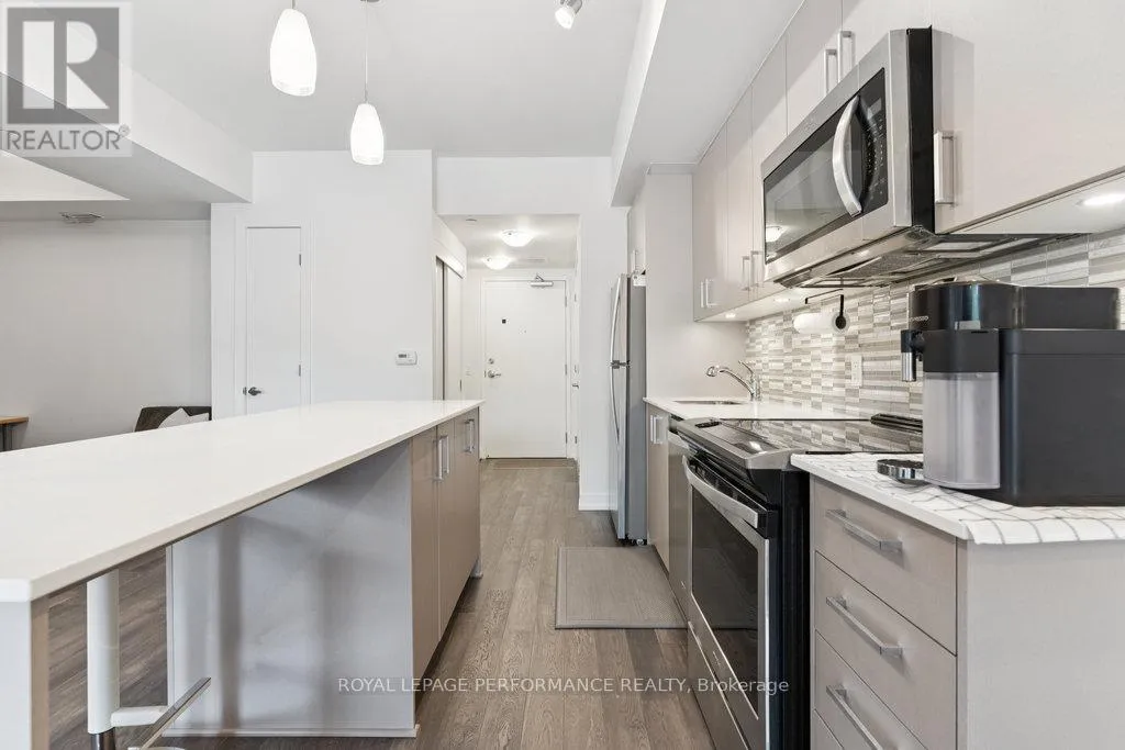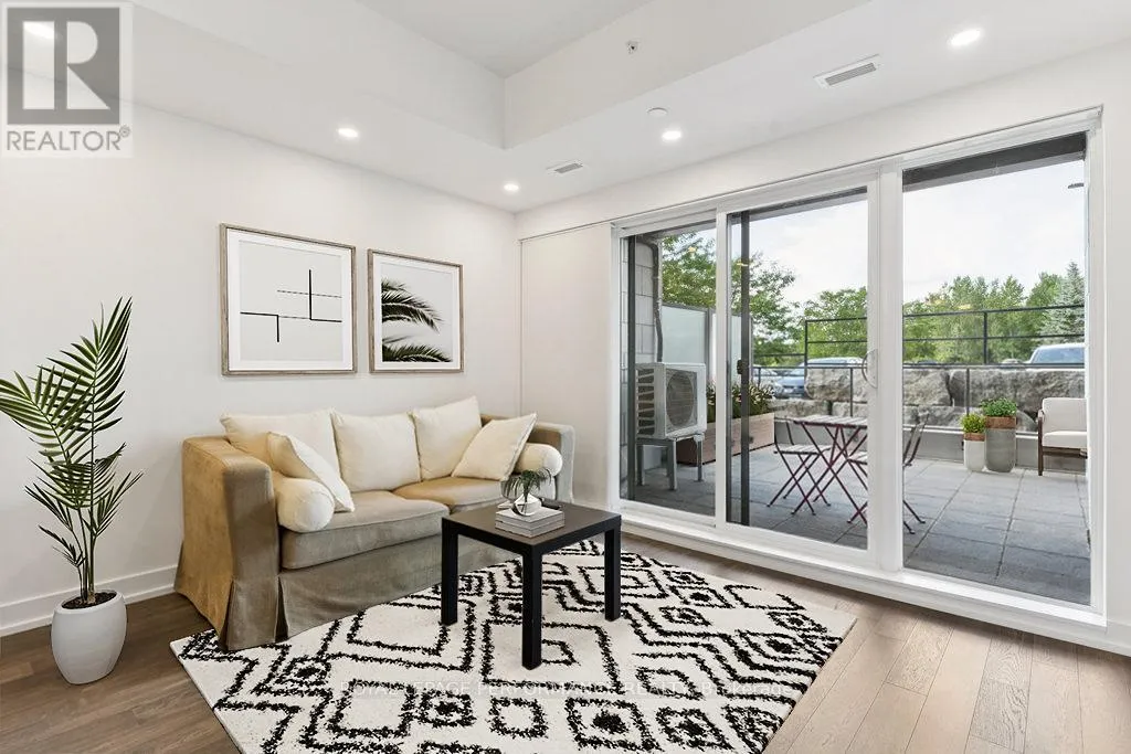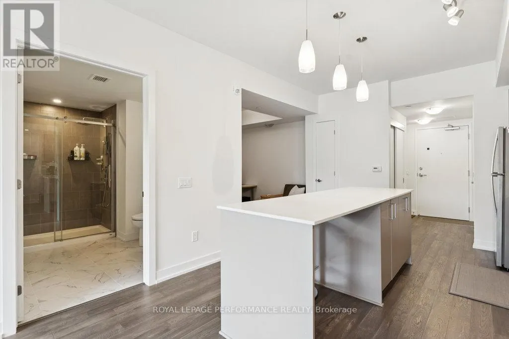 Cross Streets: Terry Fox Dr and Herzberg Rd. ** Directions: From March Rd to Herzberg Road. Welcome to 104-280 Herzberg! This stylish ground-level 1-bedroom plus den condo in The Serenity offers 729 sq. ft. of thoughtfully designed living space with premium finishes throughout. Step inside to discover 9' ceilings, wide-plank hardwood flooring, and a modern neutral palette that creates an airy, inviting atmosphere. The open-concept kitchen boasts sleek grey cabinetry, quartz countertops, stainless steel appliances, and a large island with seating that also serves as extra prep space. The versatile den is perfect for a home office or additional living area, while the spa-inspired bathroom features a glass shower with rain head, porcelain tile, and a quartz vanity. A true highlight is the spacious private terrace, ideal for entertaining, outdoor dining, or simply relaxing in a tranquil setting backing onto NCC green space. Additional conveniences include in-unit laundry, heated underground parking, and a storage locker. Residents of Serenity Condos also enjoy access to a rooftop terrace with forest views, a fitness centre, bike storage, and more. Perfectly located near golf at The Marshes, scenic trails (including a 4 km trail just steps from your door), as well as shopping and dining, this home offers the ideal blend of comfort, style, and convenience. Find floor plans, the status certificate, and more details at nickfundytus.ca. (id:27476)
