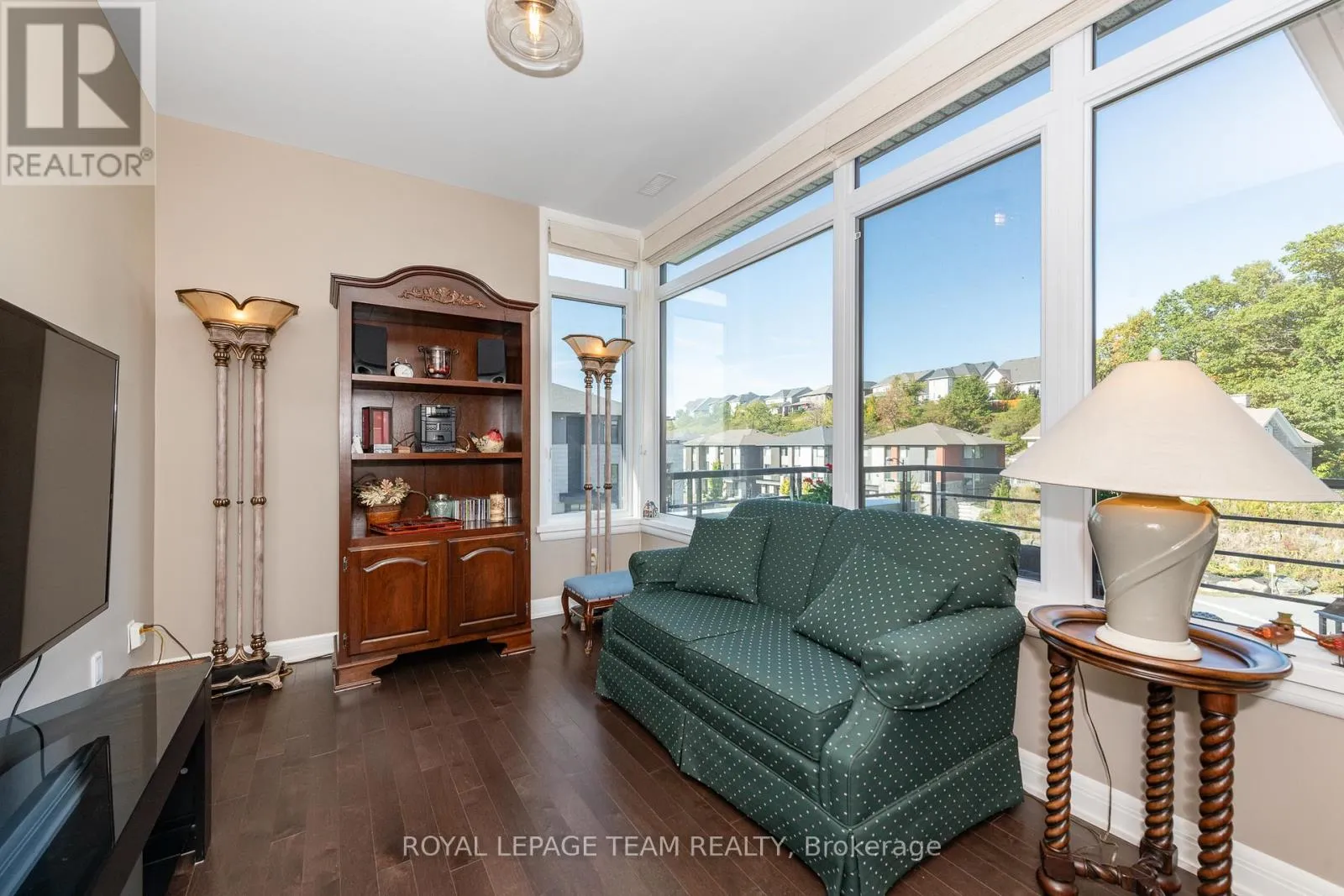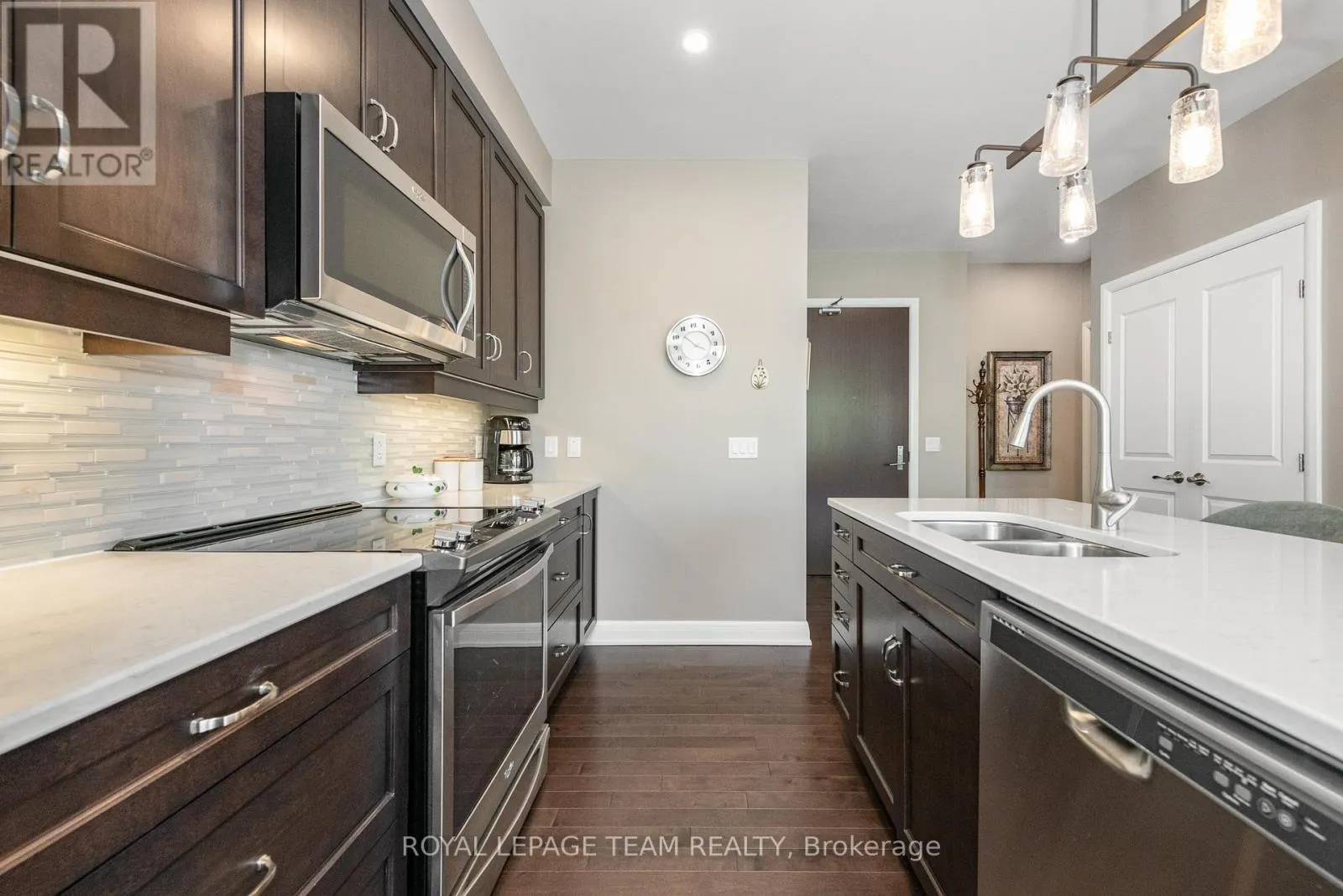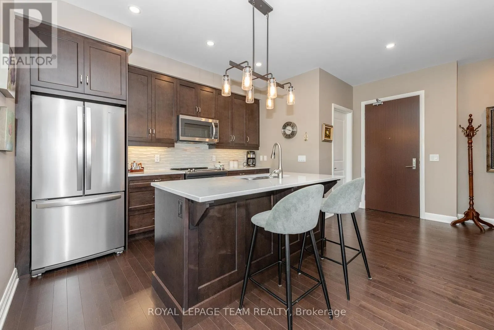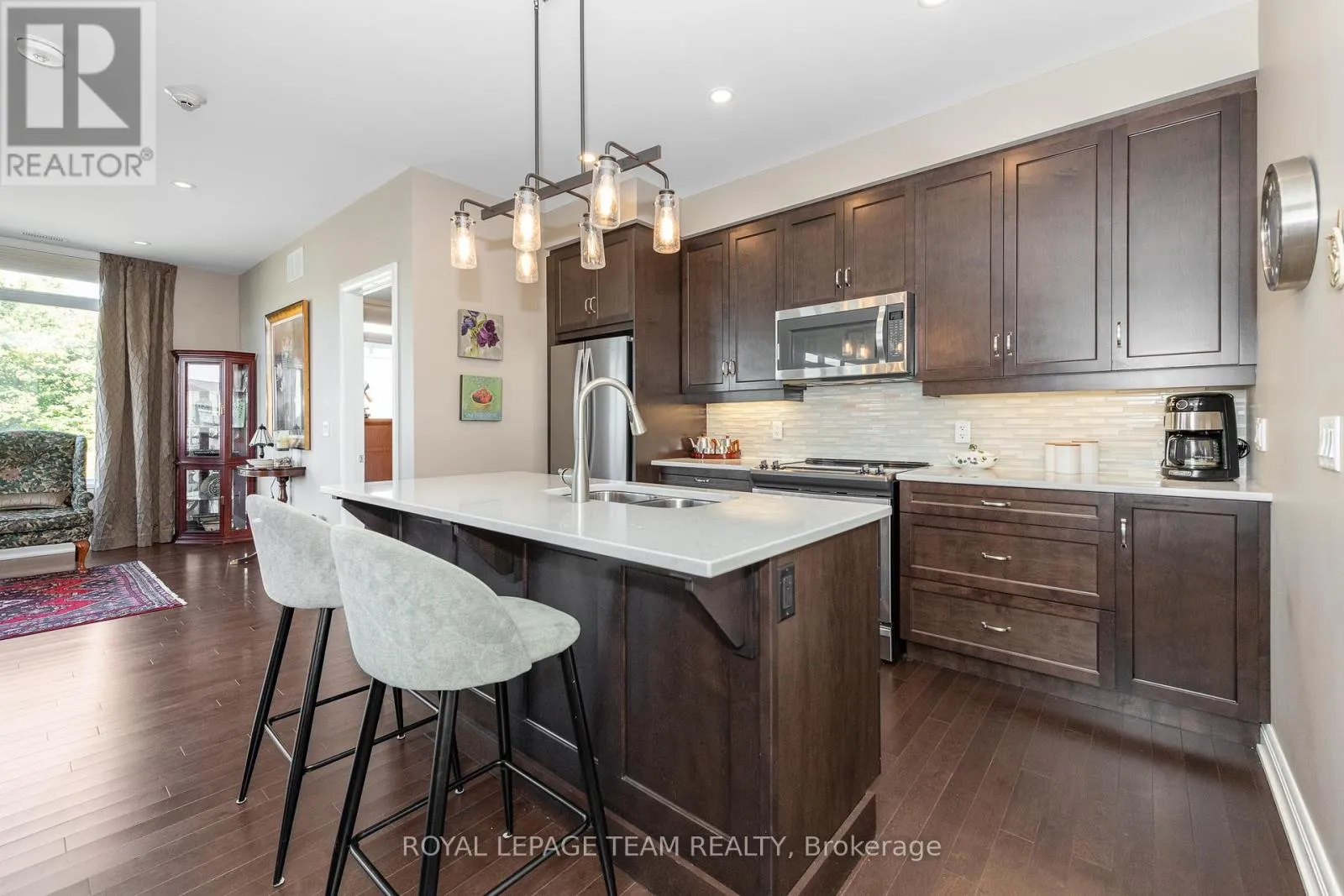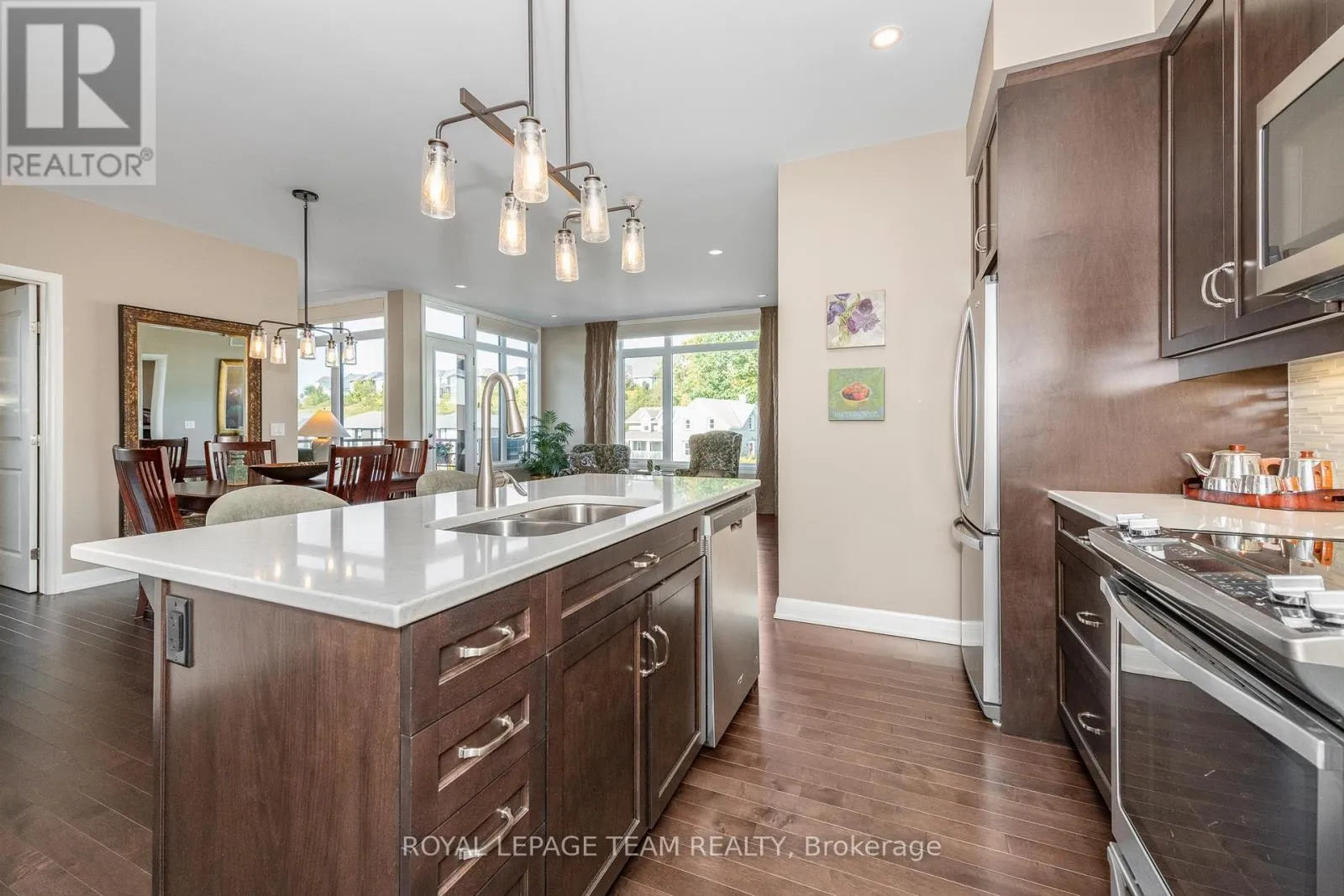Cross Streets: Terry Fox Dr. & Huntsville Dr. ** Directions: North on Terry Fox Dr. Rt on Huntsville Dr. Rt on Arkose St. Left on Boundstone Way. Condo is located at end of cul-de-sac. Welcome to "The Elements at Richardson Ridge" -- an exquisite residence in the sought-after Kanata Lakes community. This luxurious top-floor unit offers 2 spacious bedrooms, 2 full bathrooms plus a den, all bathed in natural light from oversized windows and enhanced by 9-foot ceilings and hardwood floors throughout. The stylish open-concept kitchen features a breakfast bar, stainless steel appliances, quartz countertops, tile backsplash, and modern cabinetry. Primary suite boasts a spa-like 4-piece ensuite with double sinks, quartz countertops, and a generously sized shower. The primary custom closet is designed for optimal organization. The second bedroom also has custom shelving in the closet. Enjoy breathtaking views of the Heritage Richardson House, the private clubhouse for residents. This unit also includes a dedicated storage locker and an underground heated parking spot for added convenience. The building is fully accessible, with a large elevator and sloped ramps leading to the front entrance. Within walking distance, you'll find the Signature Centre and Kanata Centrum for all your shopping needs, as well as the beautiful 4 km Carp River Conservation area perfect for walks or bike rides, just steps from your front door. Also close to Kanata's North hi-tech district. This is a non-smoking condominium including in all units and common areas. 24 hrs irrevocable on offers. (id:27476)