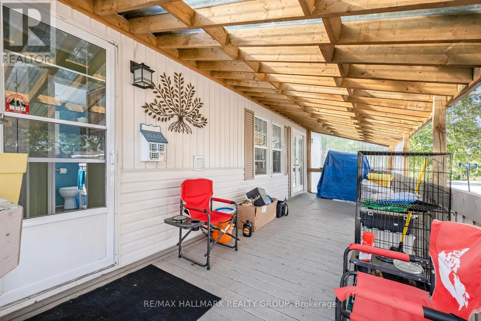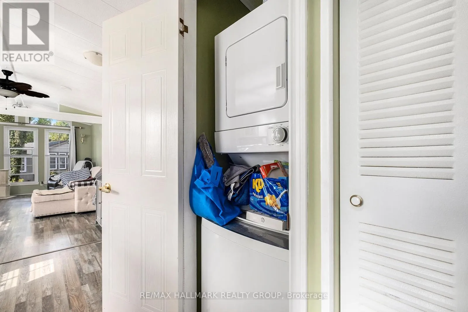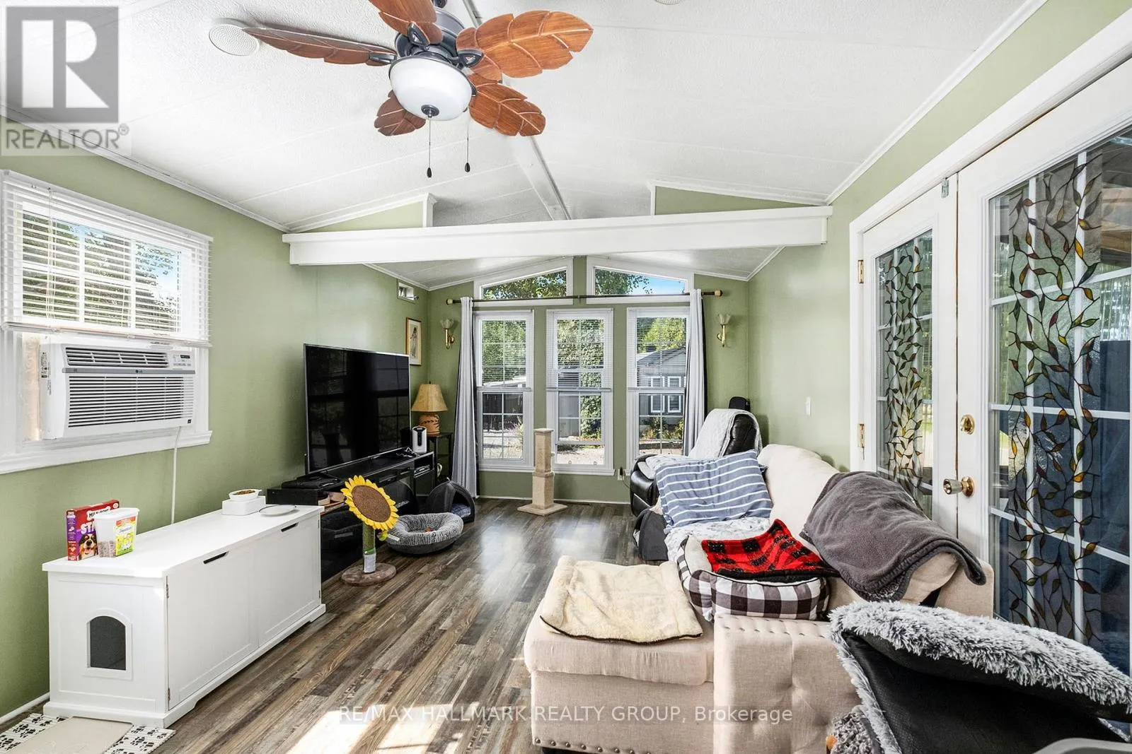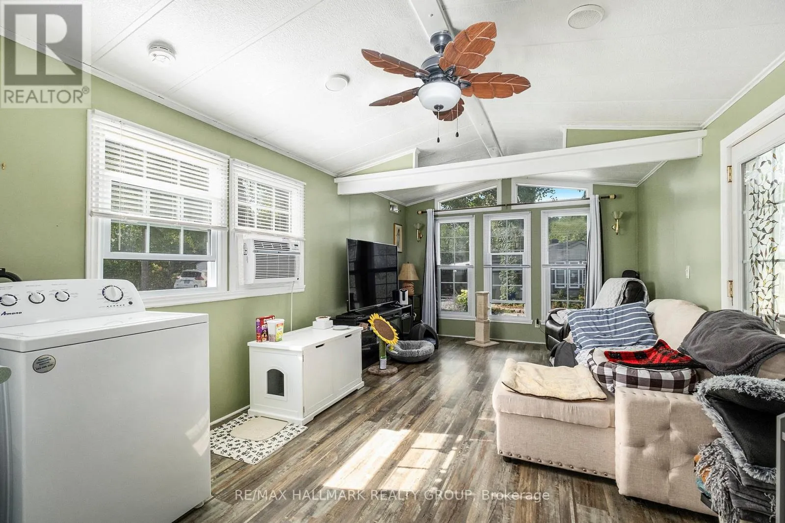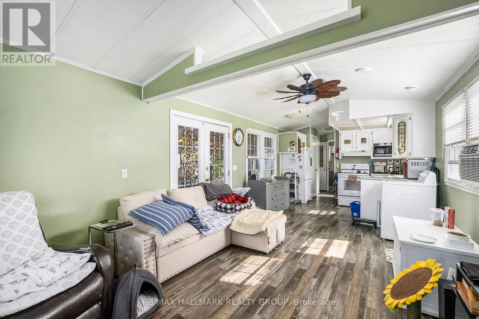 Cross Streets: Corner of Highway 7 and Dwyer Hill Road. ** Directions: Highway 7, South on Dwyer Hill Road, East on Seaborne Private, North on Resort Park Private, East on Kelly Sand Private. Experience serene country living in the desirable 55+ adult community of Ashton Pines, just an 8-minute drive from both Stittsville and Carleton Place. This well-maintained, move-in ready mobile home offers the perfect balance of comfort and simplicity for a relaxed retirement lifestyle. The inviting living room features double doors opening onto a large covered deck - an ideal spot to enjoy your morning coffee or entertain guests. Adjacent to the living room, the bright eat-in kitchen comes fully equipped with ample cabinetry, a double sink, and plenty of space for dining. The bedroom offers mirrored closet doors and lots of storage, while the full bathroom includes a convenient walk-in shower. Sunlight flows throughout the home, creating a warm and cheerful atmosphere. Outside, enjoy your own private yard with mature trees, beautiful landscaping, a lawn space, and a storage shed for all your extras. Residents also have access to an in-ground pool, and the pet-friendly community provides a peaceful setting in a quiet, welcoming neighbourhood. Key Details: Monthly Lot Fee Approx. $675; Water Testing & Sewer Approx. $41/Month; Annual Property Taxes Approx. $798. Park management approval required. Don't miss your chance to enjoy affordable, peaceful living in a friendly community - schedule your viewing today! (id:27476)