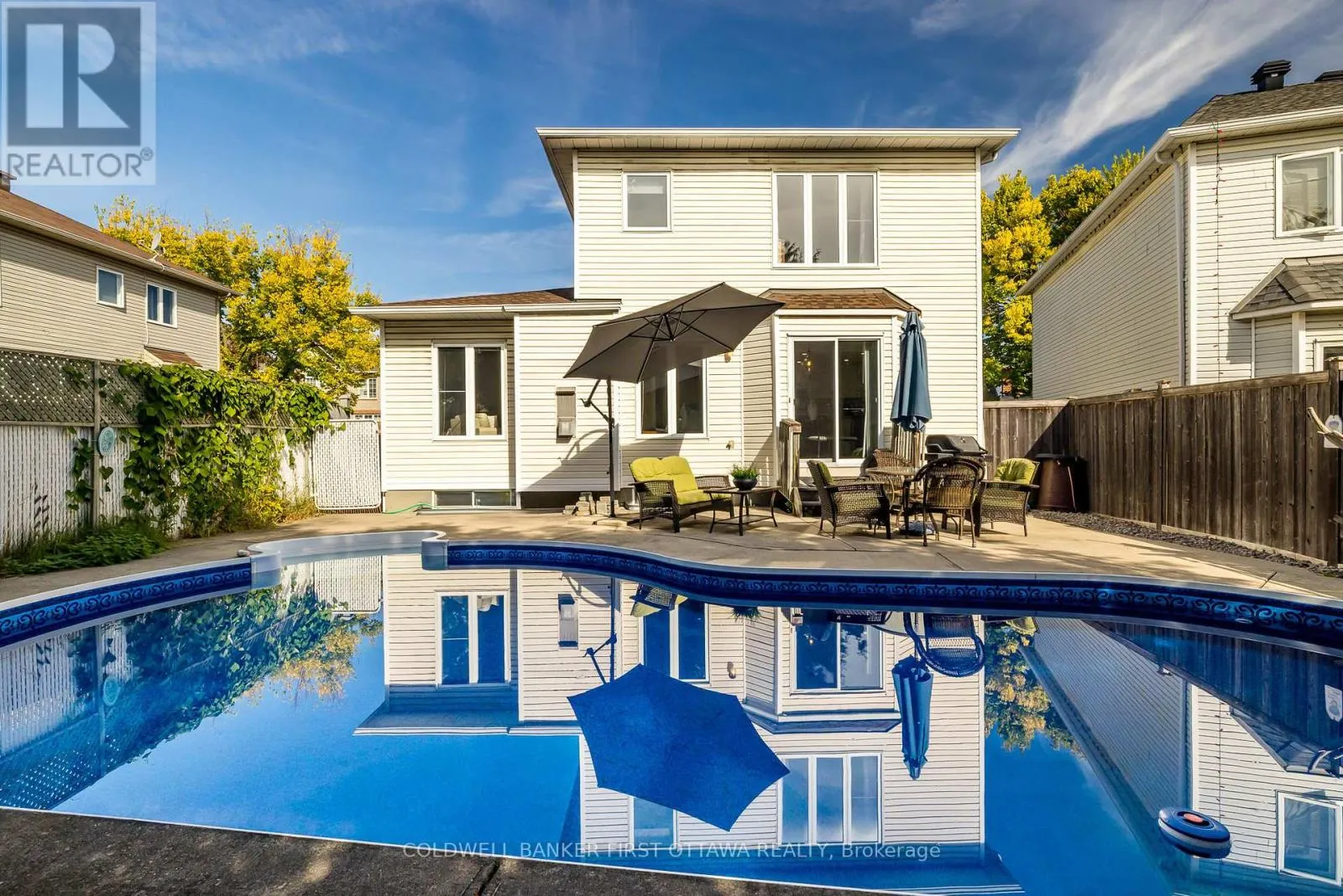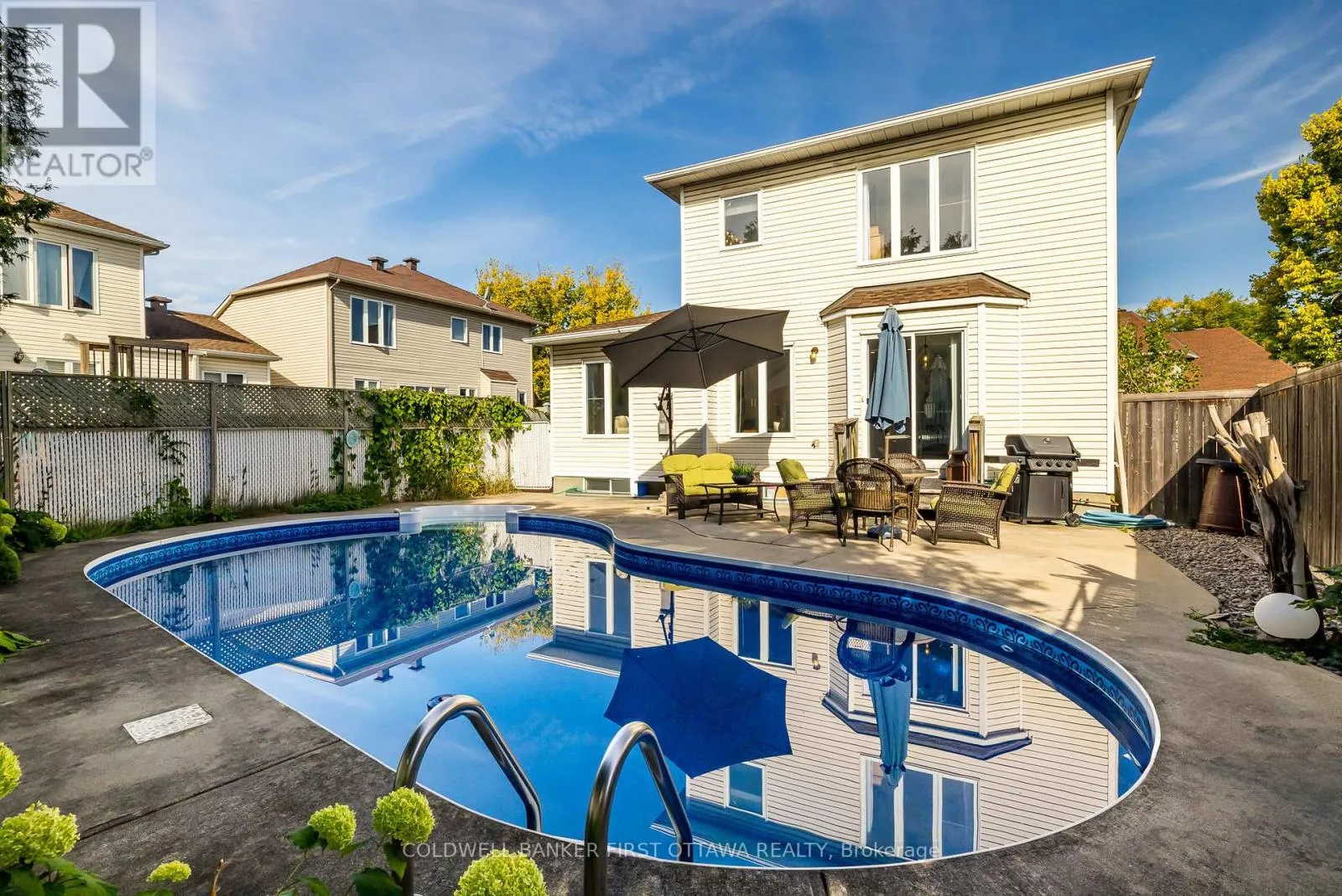 Cross Streets: Vistapointe Dr & Winterberry Wy. ** Directions: Take Woodroffe Ave south to Stoneway Dr. Turn onto Windhurst Dr. Turn onto Winterberry Way. Turn right onto Vistapointe Dr. Nestled on a quiet, sought-after street in Barrhaven, this updated 3-bed, 2.5-bath single-family home offers space, style, and convenience. A bright and functional layout includes both a family room and a living/dining area perfect for entertaining or everyday living. Recent updates showcase neutral paint, new carpeting upstairs, stylish light fixtures, kitchen upgrades with stone counters. The main floor is finished with tile and hardwood flooring. The spacious primary bedroom features its own ensuite, creating a private retreat. 2 additional bedrooms and a full bath complete the upper level. The unfinished basement provides potential for future customization.Step outside to a fully fenced backyard with an inground pool, complete with new liner, heater, pump & filter (2020). Major systems have also been updated for peace of mind, including A/C & furnace (2021) and roof (2020).This prime location is within walking distance to Movati Athletic, major retail, restaurants, parks, and top-rated schools, with easy access to public transit and major roadways. Dont miss your opportunity to own this fantastic Barrhaven property! (id:27476)