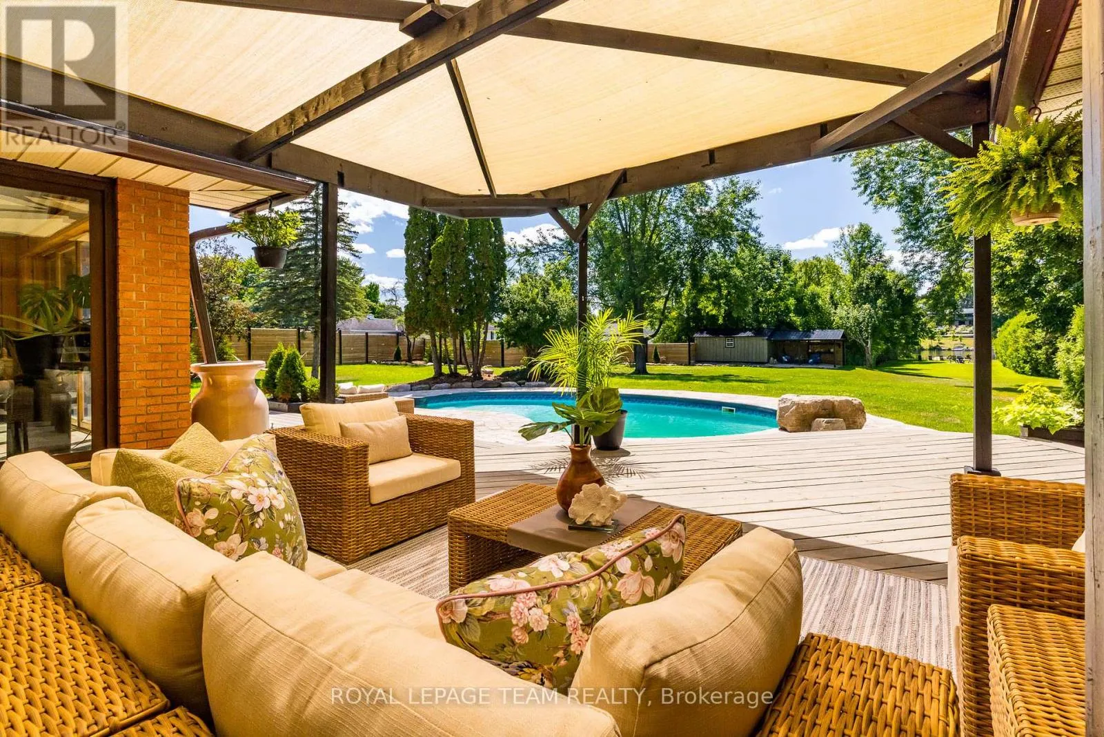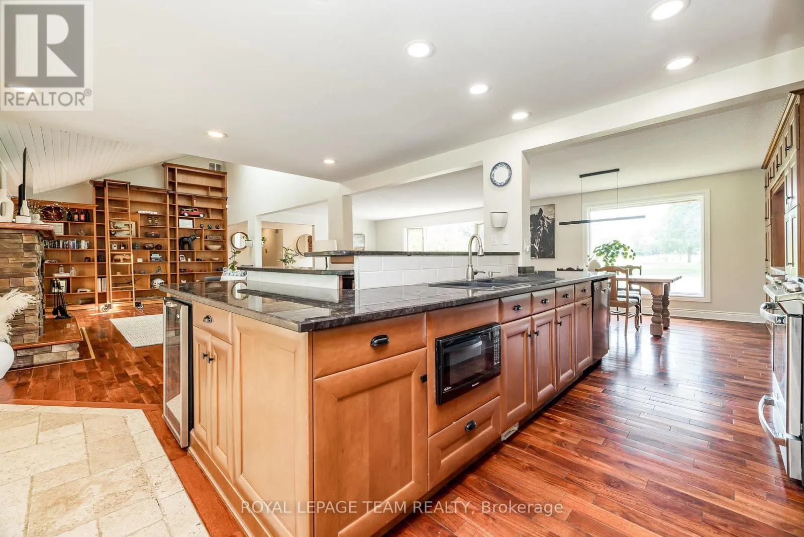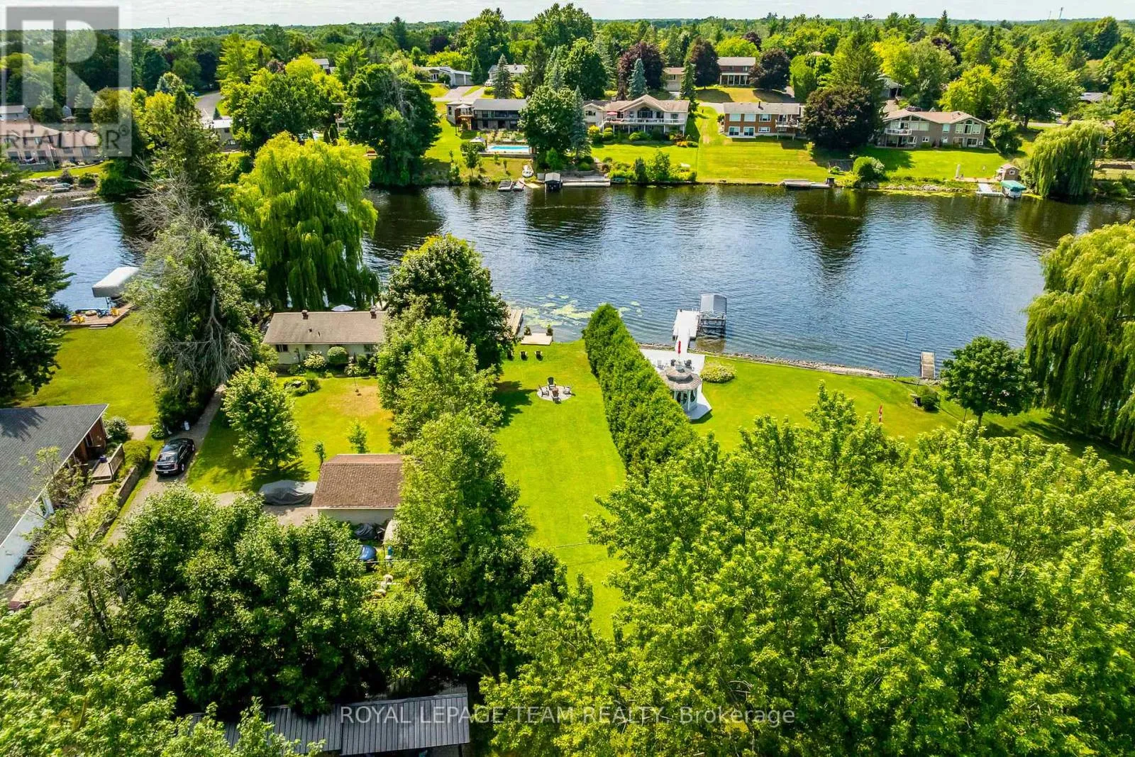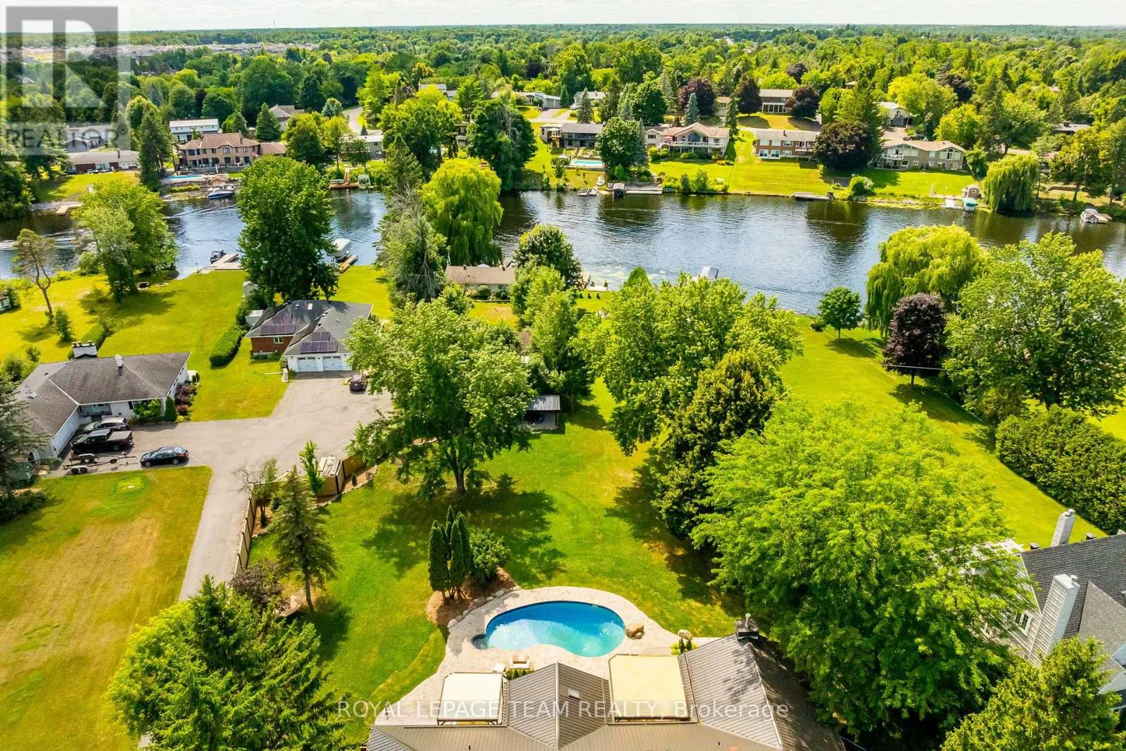 Cross Streets: River Rd/Bridge Street. ** Directions: 417 to Bankfield Rd to Manotick Main St to Bridge Street to River Road. A rare offering along a serene stretch of the Rideau River just moments from the heart of Manotick, this exceptional 3-bedroom, 2.5-bathroom estate bungalow is set on a beautifully landscaped 2.25-acre lot with 60 feet of pristine waterfront. A private paradise, the property features a resort-style backyard with a gorgeous salt water in-ground pool, mature trees, and sweeping views of the river. Step inside to discover a grand entry adorned with travertine marble flooring, leading to a spectacular library crowned by a vaulted cedar-plank ceiling. Floor-to-ceiling bookshelves, complete with a rolling ladder, create an atmosphere of refined charm, while a dramatic double-sided fireplace connects this space to the expansive sunken living room and rear deck beyond. The chef's kitchen is a showpiece, seamlessly open to the main living areas; designed for both entertaining and daily luxury. Rich granite countertops, an abundance of custom cabinetry, and a high-end gas range are paired with a unique breakfast nook offering warmth and style. Bathed in natural light, the four-season sunroom is a seamless extension of the living space, with multiple sliding glass doors opening to the tranquil grounds. The primary suite is a true retreat, with direct access to the deck, a cozy gas fireplace, custom walk-in closet, and an opulent 5-piece ensuite complete with double vanities, soaking tub, and glass-enclosed shower. The partially finished lower level with new flooring & 9ft ceilings offers flexibility for additional living or recreation space. Recently updated landscaping and a lush canopy of mature trees provide privacy and timeless beauty. Nestled in one of Ottawa's most coveted communities, this home is just minutes from boutique shops, fine dining, excellent schools, and the village charm that makes Manotick so desirable. (id:27476)