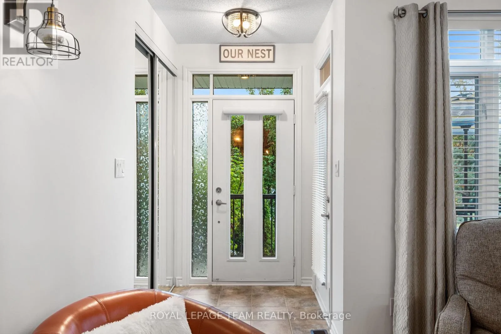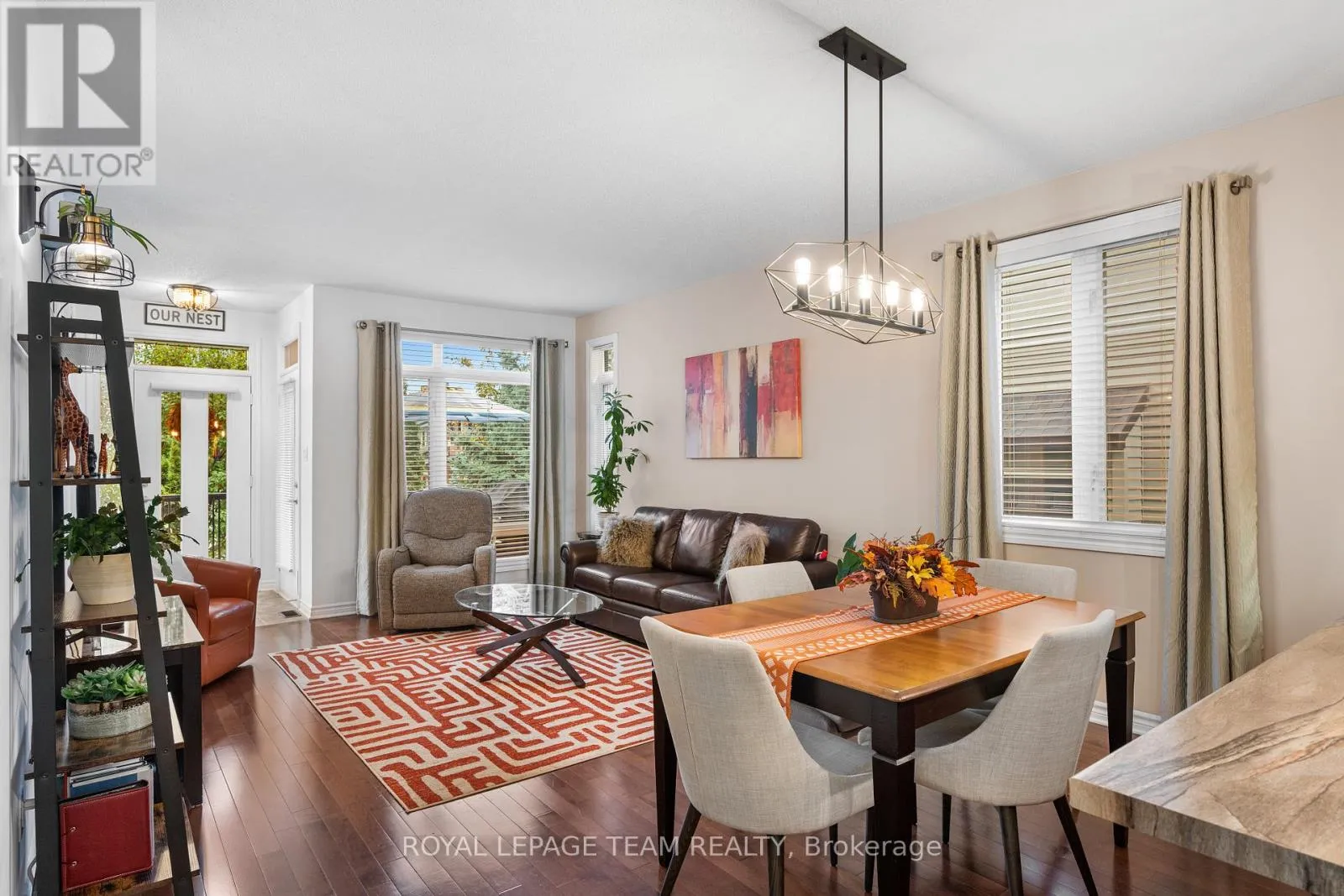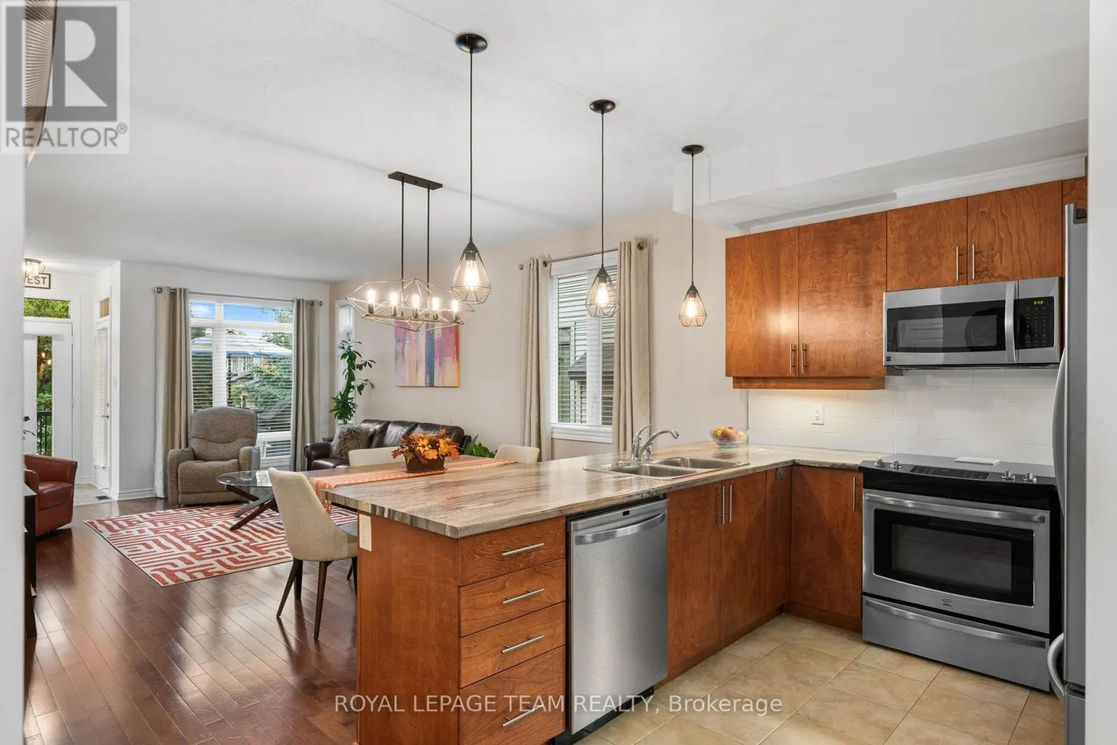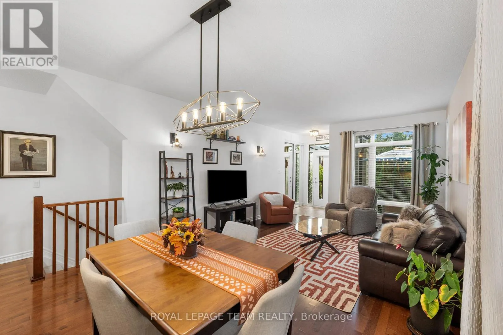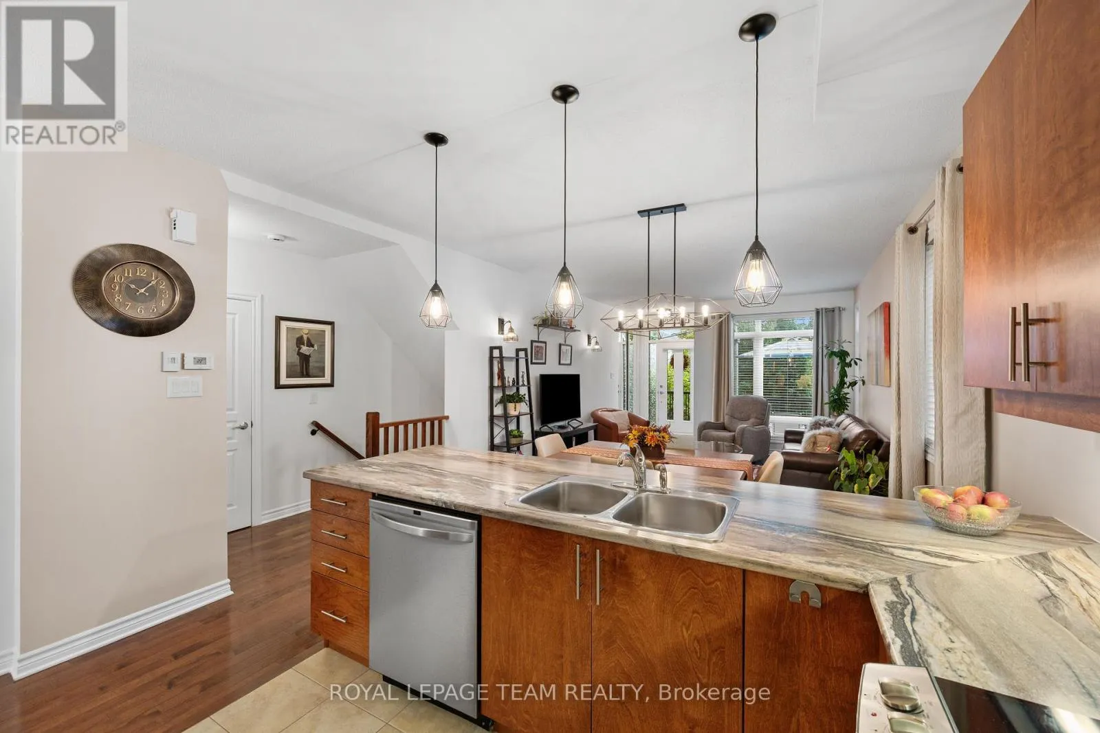 Cross Streets: Brian Good Ave & Poplin St. ** Directions: Earl Armstrong Rd, turn onto Brian Good Ave, left onto Poplin St - available street parking in front of the unit. This bright and spacious end unit features an open-concept layout, with the living, dining, and kitchen areas seamlessly connected, making it perfect for entertaining or everyday comfort. Step out onto your private balcony, ideal for grilling or simply relaxing outdoors. Enjoy hardwood flooring throughout the main level, with cozy carpet in the primary bedroom on the main floor for added warmth. The kitchen includes a peninsula with an overhang for seating and a walk-in pantry for ample storage. The main-floor bedroom serves as a spacious primary suite, complete with a walk-in closet. It is conveniently located near a luxurious full bathroom featuring a soaker tub and separate shower. An inside entry from the garage leads to the fully finished basement, which includes a second bedroom (or ideal home office), a utility closet, a deep storage closet, and a dedicated laundry area with a new washer & dryer. The basement features new laminate flooring, adding both style and durability. Additional Features: NO pet restrictions, perfect for animal lovers! Above & below grade approx. 1412.41 sq.ft., Garage 2.90m x 5.79m. Tandem parking space for 2 cars, Condo-managed snow removal & lawn maintenance, Window coverings included, Utilities: Water: approx. $672.49/year (2024), Hydro: approx. $84/month, Gas: approx. $68/month, Tankless water heater rental: $50/month. Located near the Rideau River, beautiful parks, and local shops, this home offers both comfort and convenience in a highly sought-after neighborhood. Don't miss the 360 iGuide tour. See attachment for additional information. 24 hrs irrev on all offers. (id:27476)