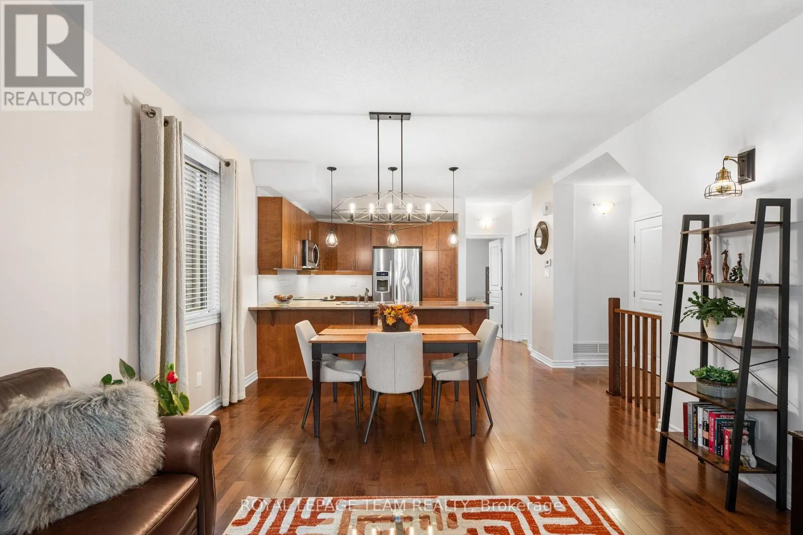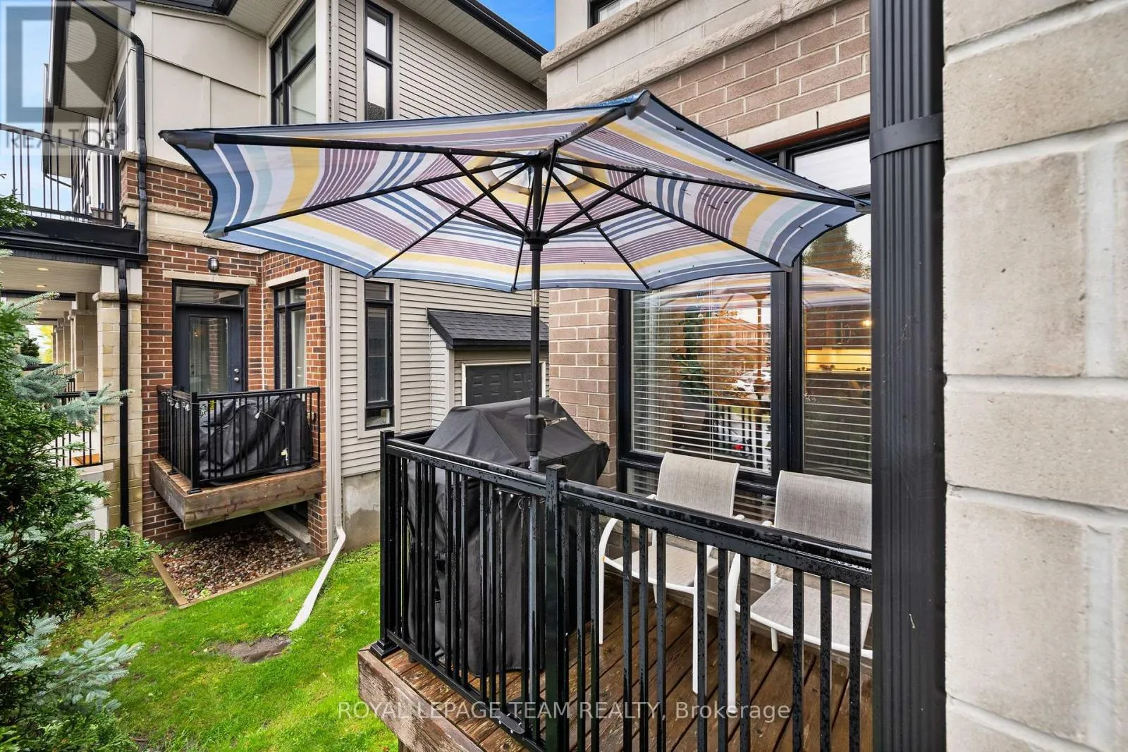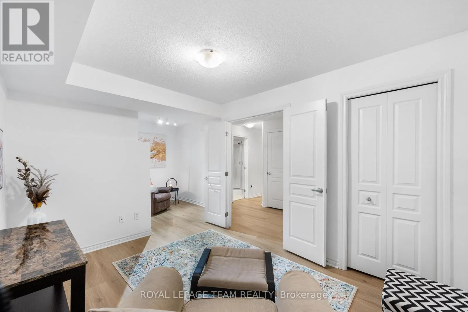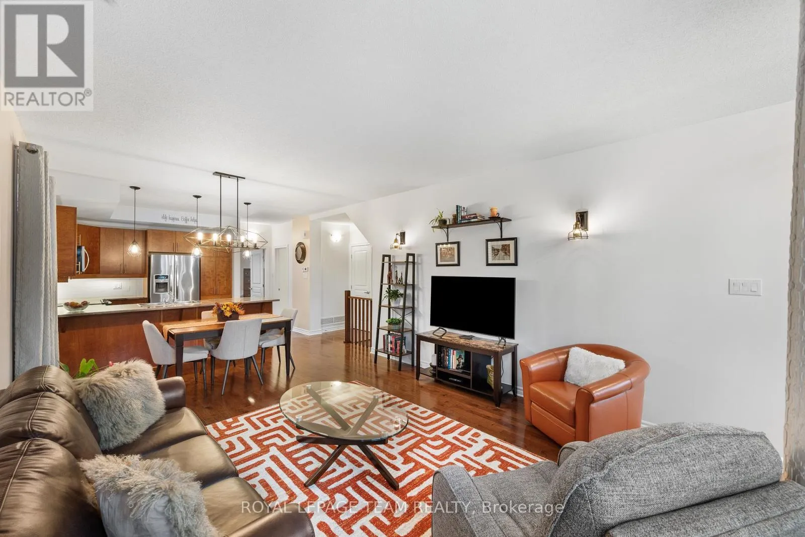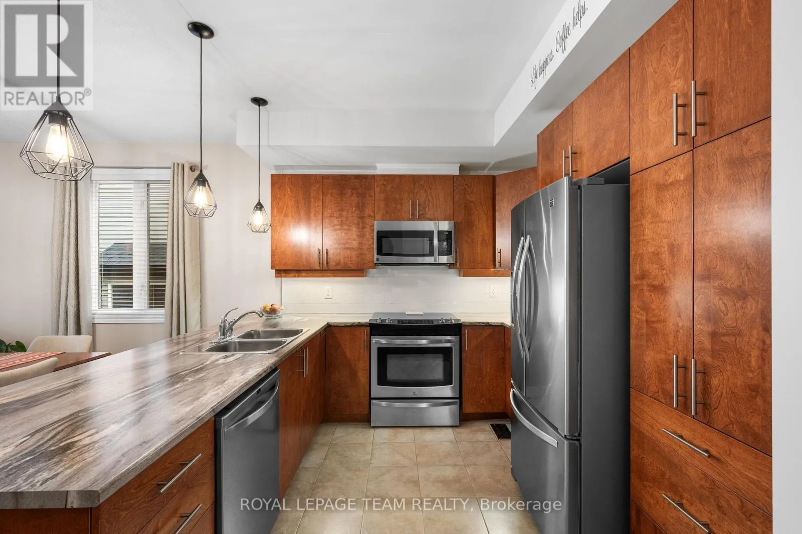 Cross Streets: Brian Good Ave & Poplin St. ** Directions: Earl Armstrong Rd, turn onto Brian Good Ave, left onto Poplin St - available street parking in front of the unit. This bright and spacious end unit features an open-concept layout, with the living, dining, and kitchen areas seamlessly connected, making it perfect for entertaining or everyday comfort. Step out onto your private balcony, ideal for grilling or simply relaxing outdoors. Enjoy hardwood flooring throughout the main level, with cozy carpet in the primary bedroom on the main floor for added warmth. The kitchen includes a peninsula with an overhang for seating and a walk-in pantry for ample storage. The main-floor bedroom serves as a spacious primary suite, complete with a walk-in closet. It is conveniently located near a luxurious full bathroom featuring a soaker tub and separate shower. An inside entry from the garage leads to the fully finished basement, which includes a second bedroom (or ideal home office), a utility closet, a deep storage closet, and a dedicated laundry area with a new washer & dryer. The basement features new laminate flooring, adding both style and durability. Additional Features: NO pet restrictions, perfect for animal lovers! Above & below grade approx. 1412.41 sq.ft., Garage 2.90m x 5.79m. Tandem parking space for 2 cars, Condo-managed snow removal & lawn maintenance, Window coverings included, Utilities: Water: approx. $672.49/year (2024), Hydro: approx. $84/month, Gas: approx. $68/month, Tankless water heater rental: $50/month. Located near the Rideau River, beautiful parks, and local shops, this home offers both comfort and convenience in a highly sought-after neighborhood. Don't miss the 360 iGuide tour. See attachment for additional information. 24 hrs irrev on all offers. (id:27476)