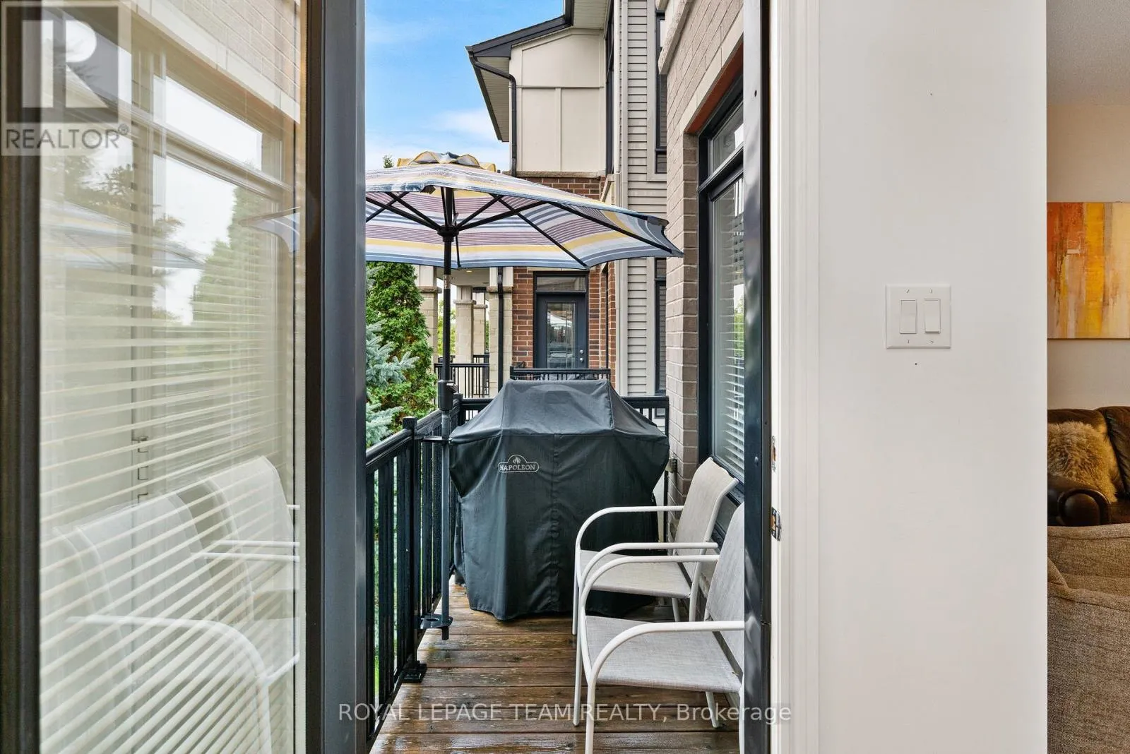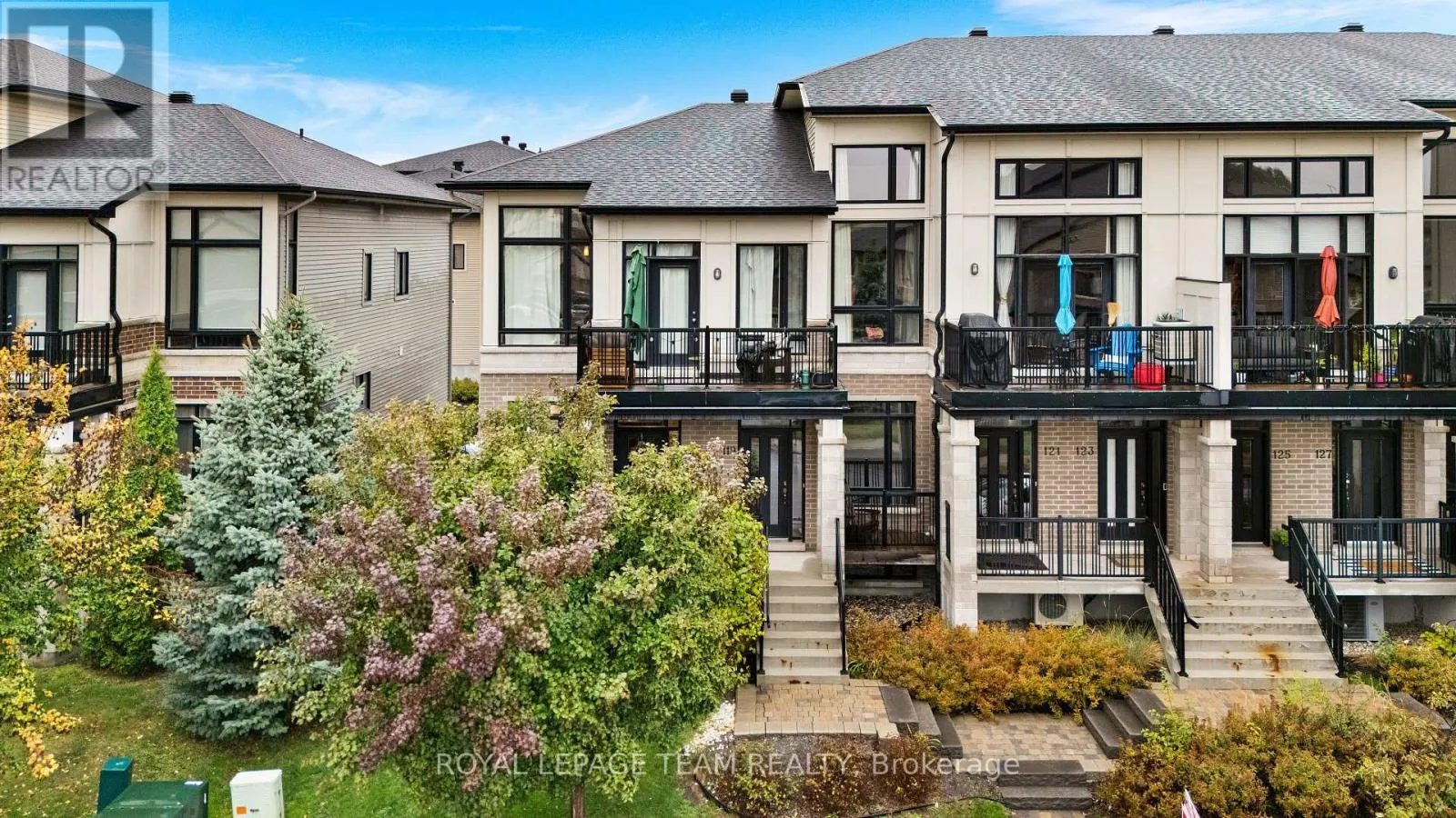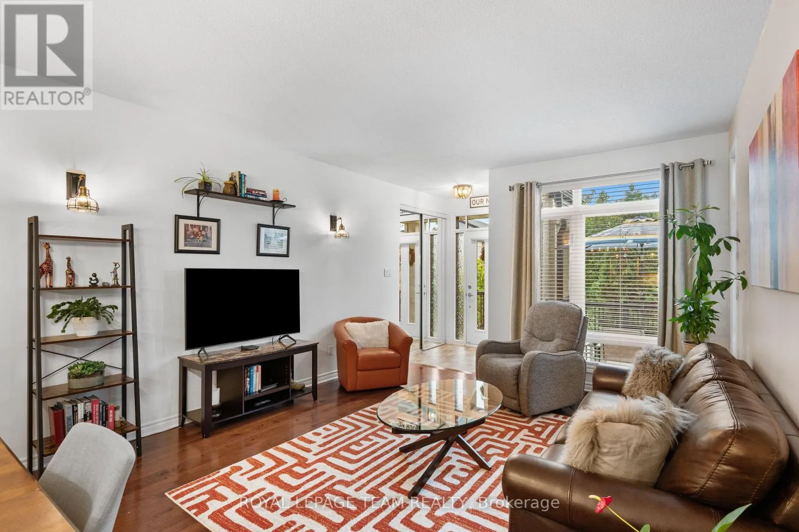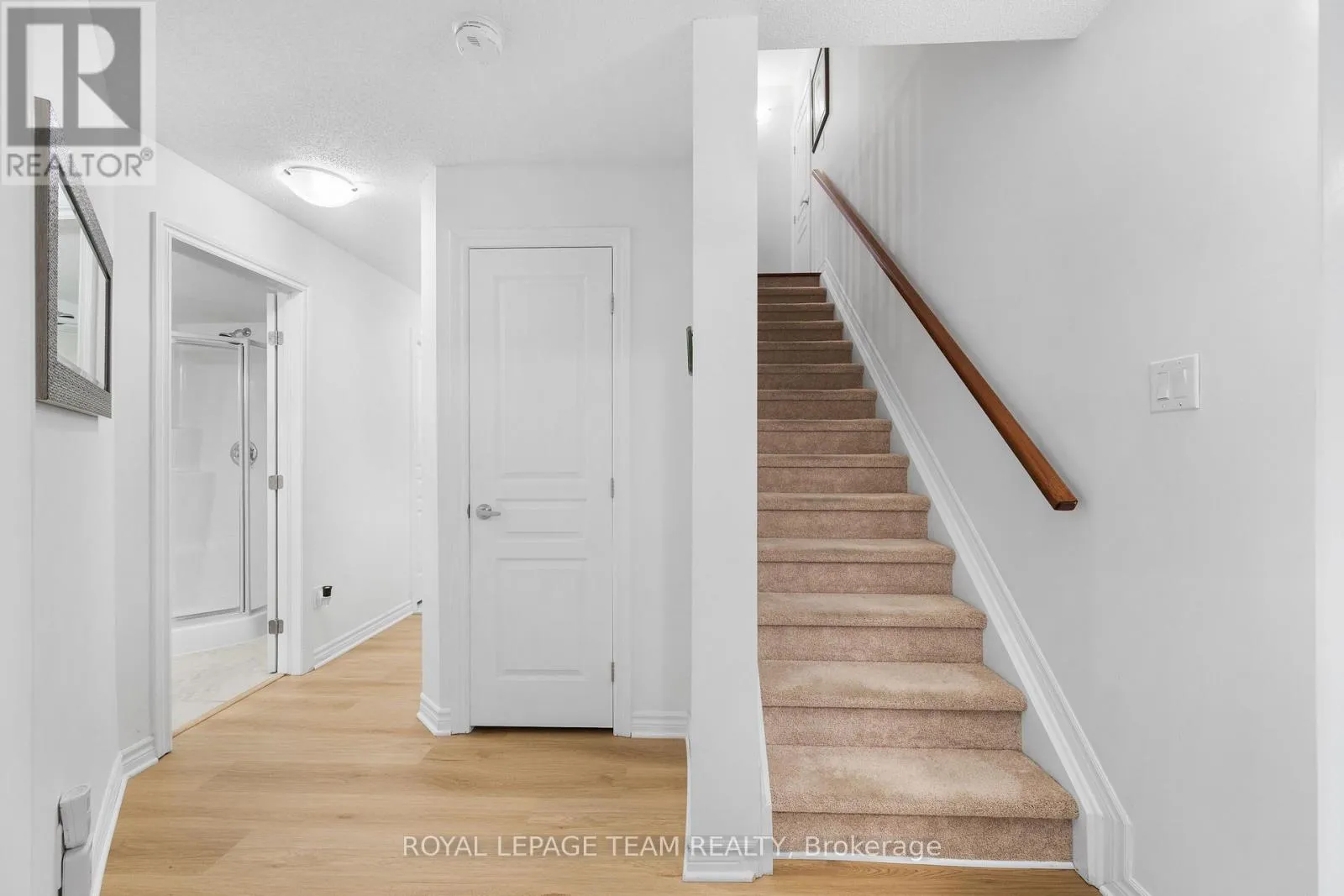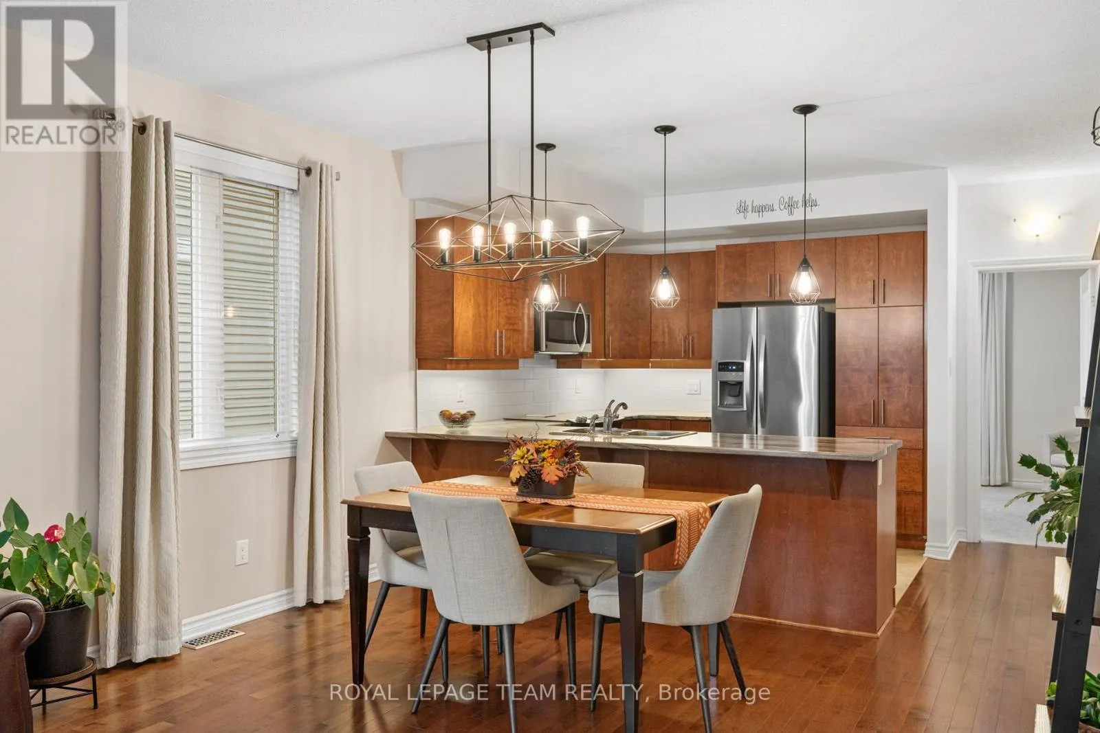 Cross Streets: Brian Good Ave & Poplin St. ** Directions: Earl Armstrong Rd, turn onto Brian Good Ave, left onto Poplin St - available street parking in front of the unit. This bright and spacious end unit features an open-concept layout, with the living, dining, and kitchen areas seamlessly connected, making it perfect for entertaining or everyday comfort. Step out onto your private balcony, ideal for grilling or simply relaxing outdoors. Enjoy hardwood flooring throughout the main level, with cozy carpet in the primary bedroom on the main floor for added warmth. The kitchen includes a peninsula with an overhang for seating and a walk-in pantry for ample storage. The main-floor bedroom serves as a spacious primary suite, complete with a walk-in closet. It is conveniently located near a luxurious full bathroom featuring a soaker tub and separate shower. An inside entry from the garage leads to the fully finished basement, which includes a second bedroom (or ideal home office), a utility closet, a deep storage closet, and a dedicated laundry area with a new washer & dryer. The basement features new laminate flooring, adding both style and durability. Additional Features: NO pet restrictions, perfect for animal lovers! Above & below grade approx. 1412.41 sq.ft., Garage 2.90m x 5.79m. Tandem parking space for 2 cars, Condo-managed snow removal & lawn maintenance, Window coverings included, Utilities: Water: approx. $672.49/year (2024), Hydro: approx. $84/month, Gas: approx. $68/month, Tankless water heater rental: $50/month. Located near the Rideau River, beautiful parks, and local shops, this home offers both comfort and convenience in a highly sought-after neighborhood. Don't miss the 360 iGuide tour. See attachment for additional information. 24 hrs irrev on all offers. (id:27476)