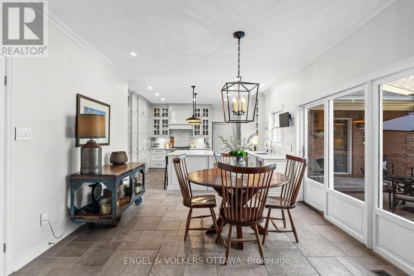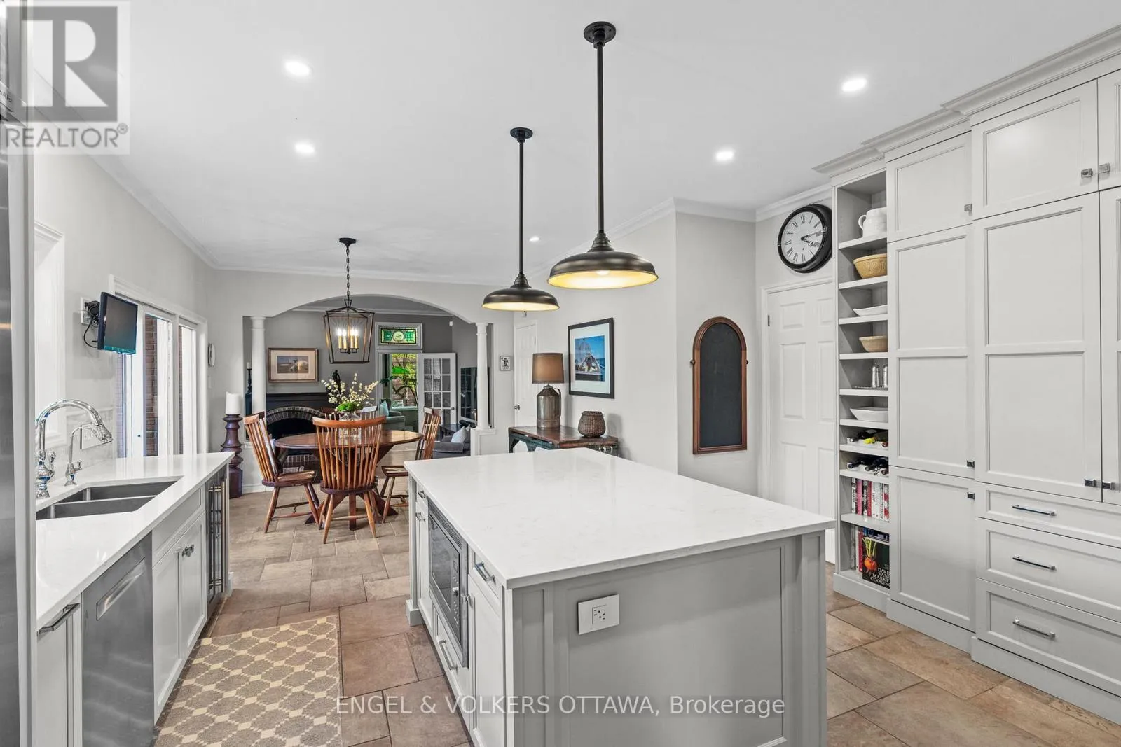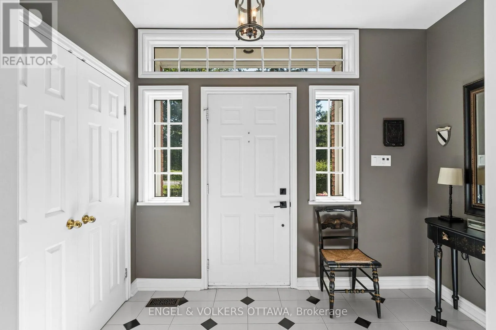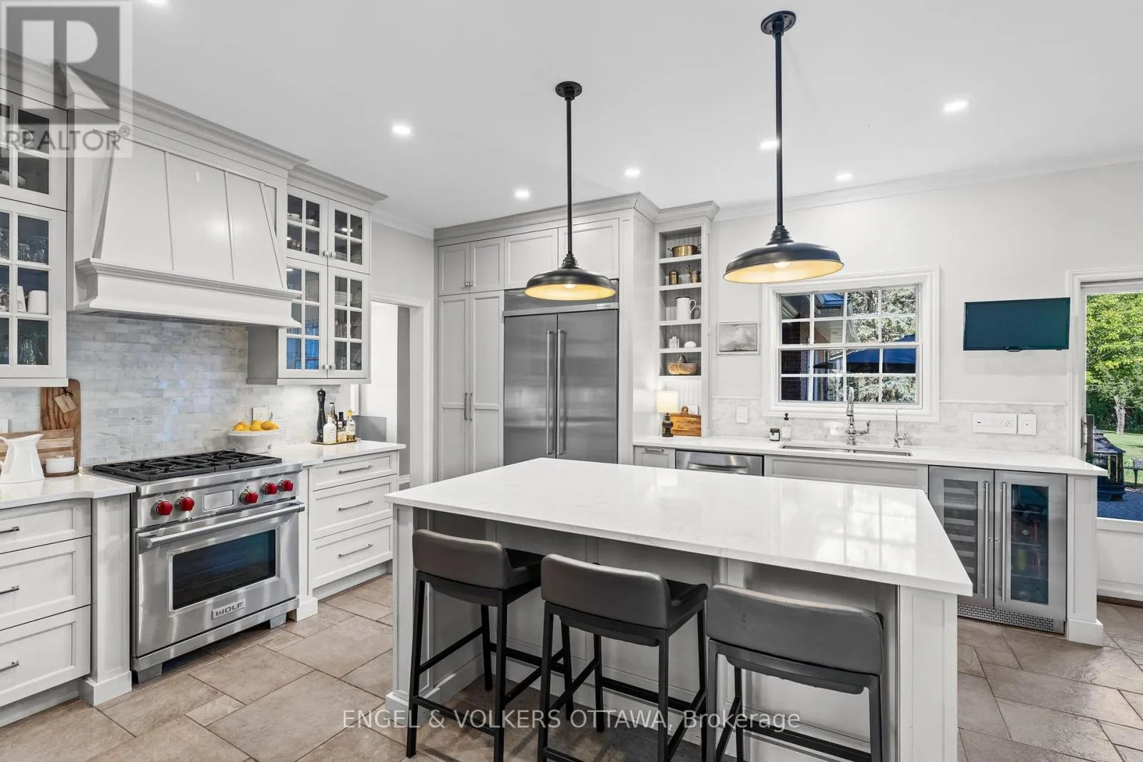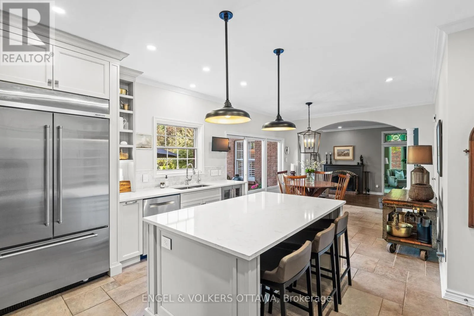 Cross Streets: Bankfield/Potter Drive. ** Directions: Bankfield to Potter, left on Pettapiece, the property will be on your left side. Poised on a serene ravine lot within the prestigious enclave of Manotick Estates, this beautiful Georgian-inspired all-brick residence embodies distinguished architectural character and timeless elegance. Upon entry, elevated ceiling heights, custom millwork, and a gracefully crafted hardwood staircase create an immediate sense of sophistication. The traditional cross-hall plan reveals a formal living room with soaring windows and an elegant gas fireplace, complemented by a grand dining room ideal for entertaining. At the heart of the home, the open-concept kitchen showcases bespoke Cabico cabinetry, quartz countertops, and premium stainless steel appliances. The adjoining breakfast area flows seamlessly into a warm and inviting family room, anchored by a handcrafted brick wood-burning fireplace of exceptional character. Extending from this space, a spectacular sunroom wrapped in floor-to-ceiling windows offers panoramic views of the landscaped grounds and private ravine setting. Thoughtfully designed, the layout also includes a charming side entrance with a covered porch, leading into a well-appointed mudroom and laundry area, along with a versatile office that could easily serve as a main floor bedroom. The home's upper storey is graced with an elegant and spacious primary suite, featuring a stunning ensuite with dual custom walnut vanities, a travertine glass shower, deep soaker tub, and heated flooring. Three additional bedrooms, each generously scaled and filled with natural light, share access to a beautifully appointed bathroom. The meticulously finished lower level presents a cozy family room with a striking feature brick wall, versatile flex rooms ideal for a gym or recreation space, abundant storage, and convenient direct access to the garage. Outdoors, the enchanting backyard evokes the charm of an English garden, with a serene courtyard, water features, and sweeping views of the private ravine lot, a perfect setting for future poolside living. (id:27476)