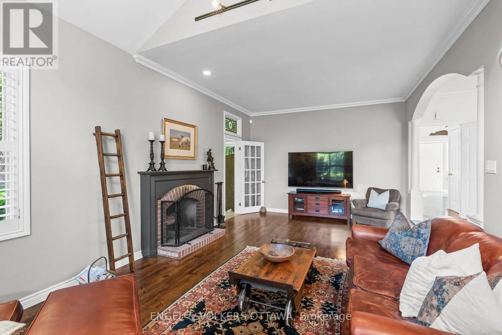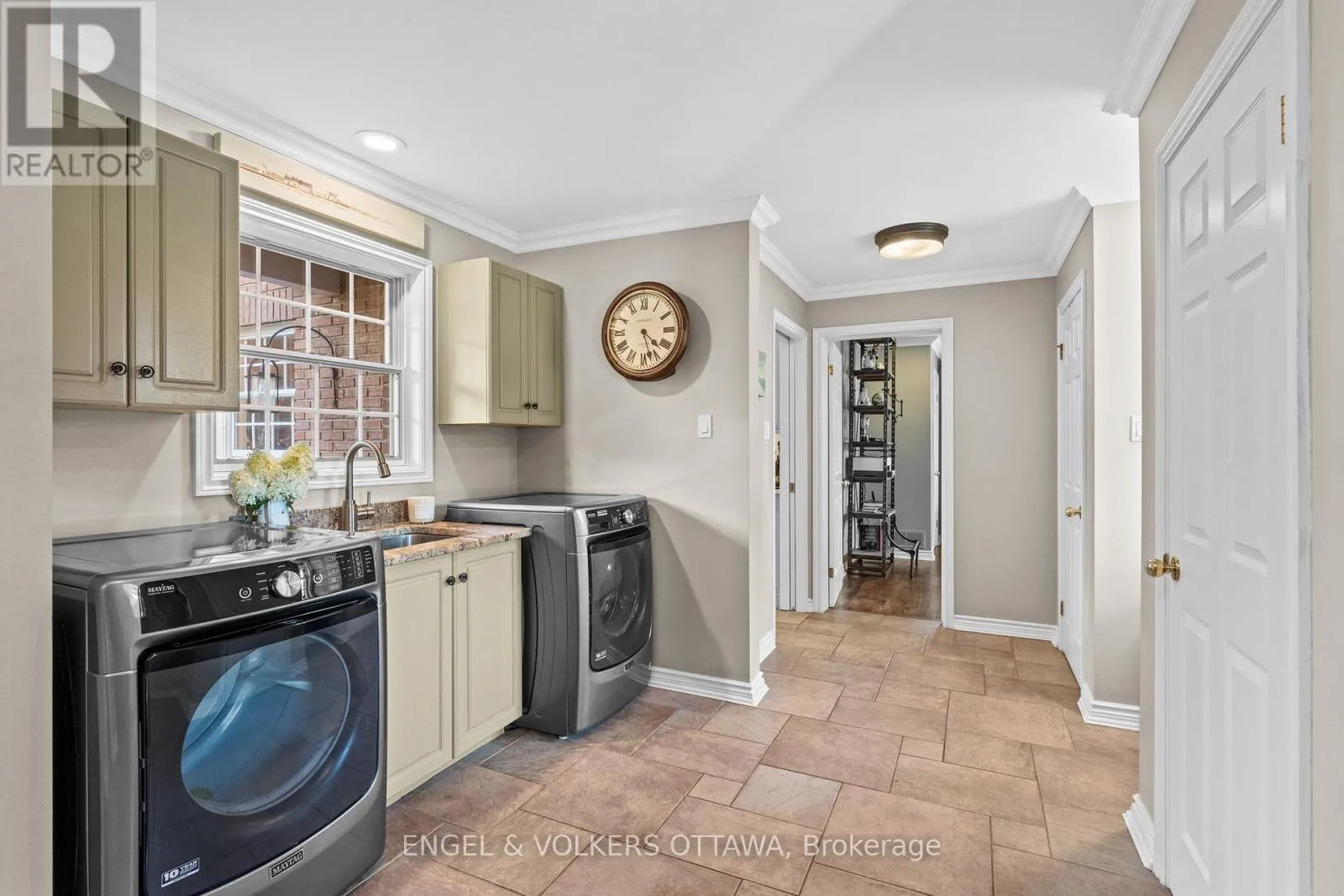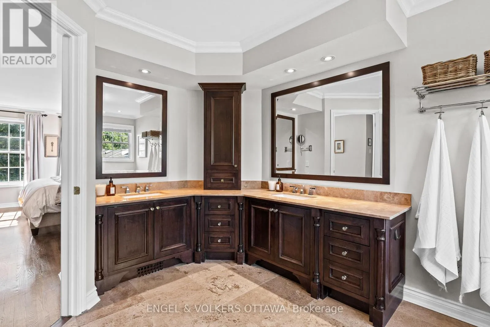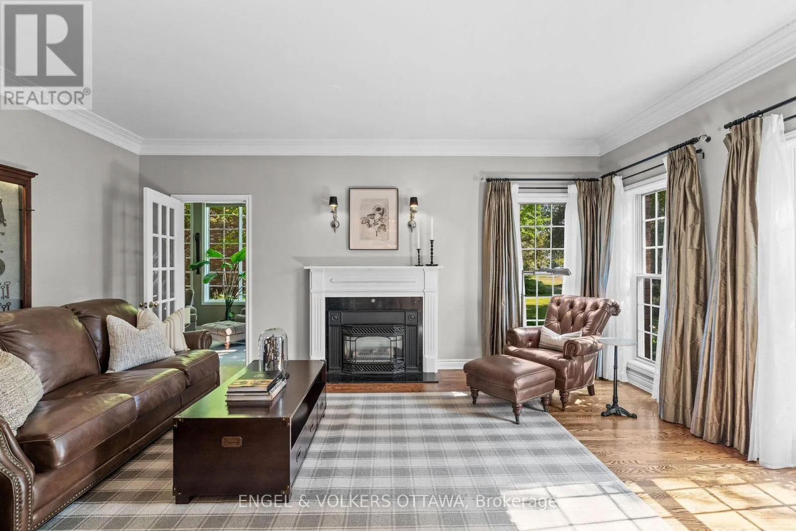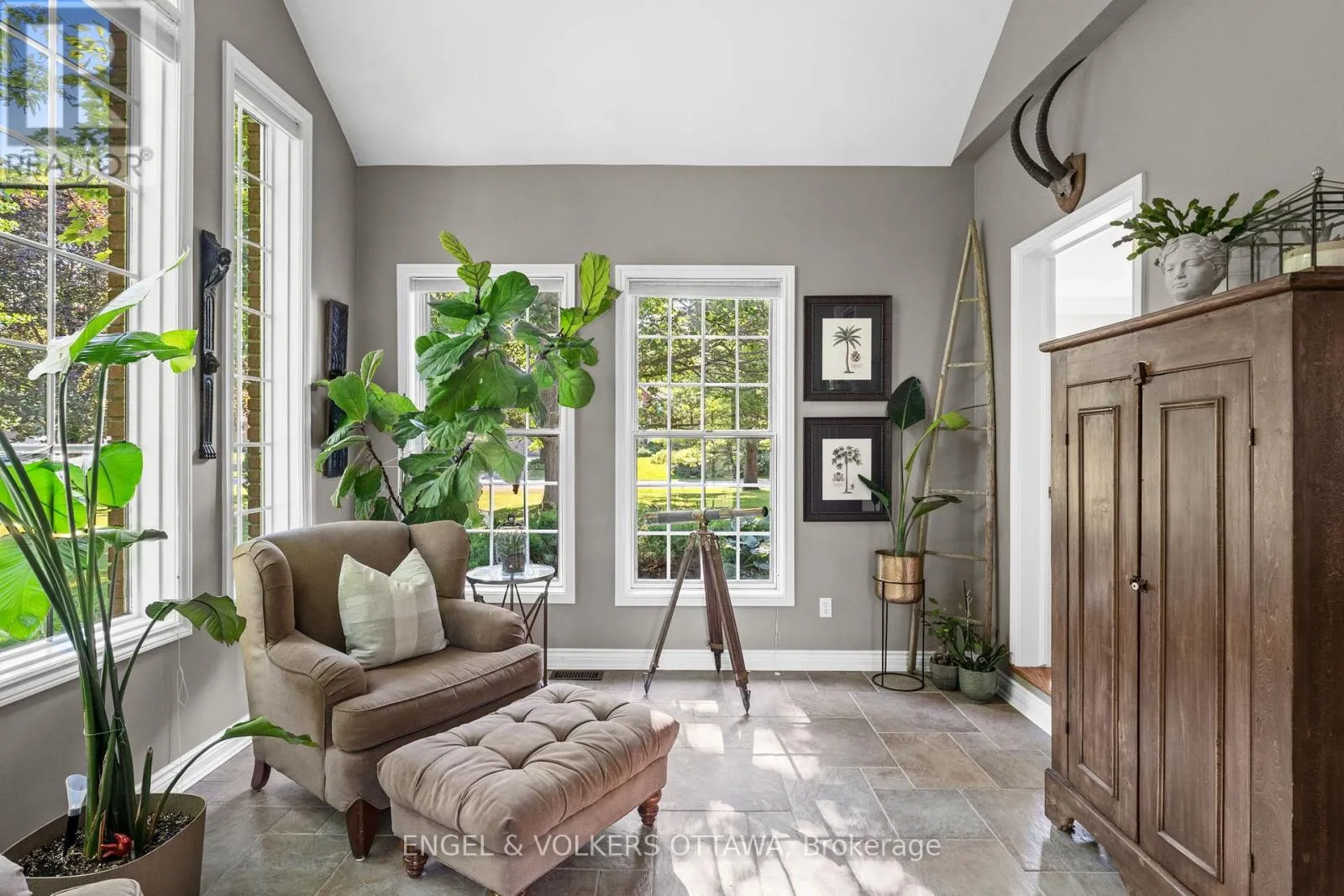 Cross Streets: Bankfield/Potter Drive. ** Directions: Bankfield to Potter, left on Pettapiece, the property will be on your left side. Poised on a serene ravine lot within the prestigious enclave of Manotick Estates, this beautiful Georgian-inspired all-brick residence embodies distinguished architectural character and timeless elegance. Upon entry, elevated ceiling heights, custom millwork, and a gracefully crafted hardwood staircase create an immediate sense of sophistication. The traditional cross-hall plan reveals a formal living room with soaring windows and an elegant gas fireplace, complemented by a grand dining room ideal for entertaining. At the heart of the home, the open-concept kitchen showcases bespoke Cabico cabinetry, quartz countertops, and premium stainless steel appliances. The adjoining breakfast area flows seamlessly into a warm and inviting family room, anchored by a handcrafted brick wood-burning fireplace of exceptional character. Extending from this space, a spectacular sunroom wrapped in floor-to-ceiling windows offers panoramic views of the landscaped grounds and private ravine setting. Thoughtfully designed, the layout also includes a charming side entrance with a covered porch, leading into a well-appointed mudroom and laundry area, along with a versatile office that could easily serve as a main floor bedroom. The home's upper storey is graced with an elegant and spacious primary suite, featuring a stunning ensuite with dual custom walnut vanities, a travertine glass shower, deep soaker tub, and heated flooring. Three additional bedrooms, each generously scaled and filled with natural light, share access to a beautifully appointed bathroom. The meticulously finished lower level presents a cozy family room with a striking feature brick wall, versatile flex rooms ideal for a gym or recreation space, abundant storage, and convenient direct access to the garage. Outdoors, the enchanting backyard evokes the charm of an English garden, with a serene courtyard, water features, and sweeping views of the private ravine lot, a perfect setting for future poolside living. (id:27476)