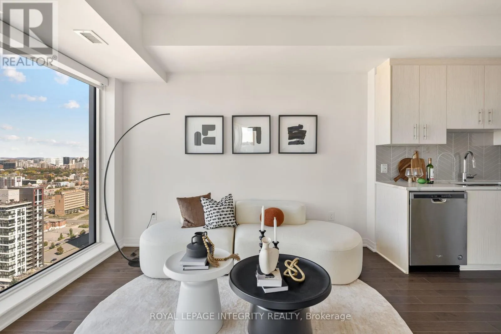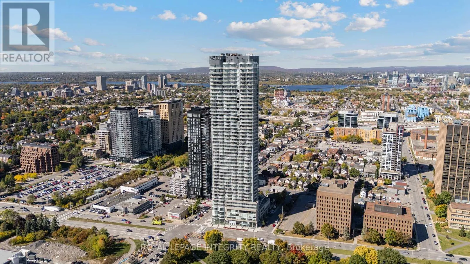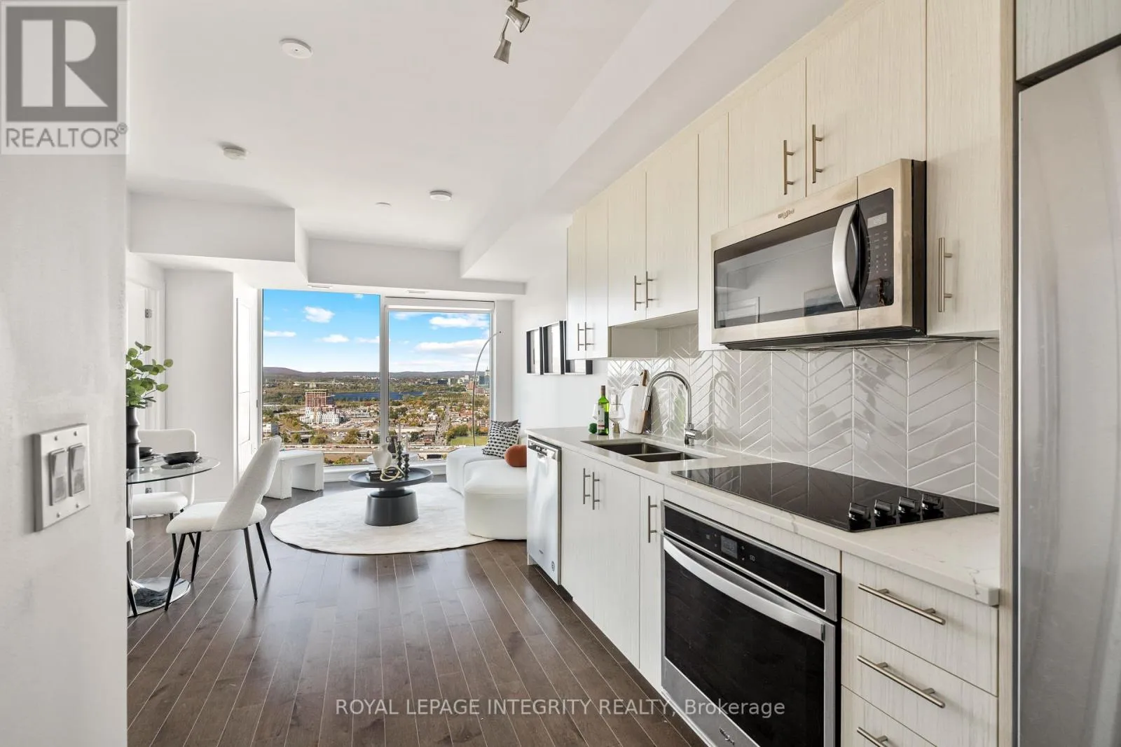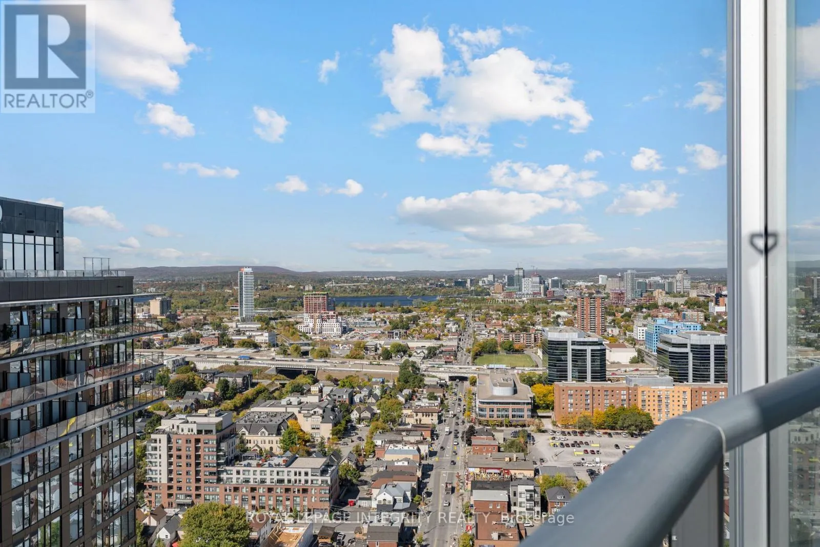 Cross Streets: Preston / Carling. ** Directions: Preston to Carling. Welcome to elevated living at The Icon - Ottawa's most prestigious address. Perched on the 29th floor, this freshly painted corner-unit residence offers breathtaking views of the Gatineau Hills and radiant sunsets over the city. Designed for the discerning buyer, this 2-bedroom, 1-bath home is a masterclass in sophistication and comfort. Step inside to a bright, open-concept layout adorned with soaring 9-ft ceilings, floor-to-ceiling windows, and timeless finishes. Sleek hardwood floors flow throughout, anchored by the chefs kitchen complete with gleaming quartz countertops, modern cabinetry, and high-end stainless steel appliances. Both bedrooms offer large closets and access to a private, shared balcony - perfect for your morning coffee or evening wine with panoramic views. Enjoy the ease of in-unit laundry, underground parking, and a spacious storage locker. Resort-style amenities elevate your lifestyle: fully equipped gym with lake views, yoga studio, indoor pool, sauna, theatre, party room, rooftop terrace with BBQs, and 24-hour concierge service. Located beside Dows Lake and vibrant Little Italy, you're surrounded by Ottawa's best dining, cafés, festivals, and outdoor activities - skating, kayaking, cycling and more. Just minutes from downtown. Live above it all - luxury, lifestyle, location. Book your private showing today! (id:27476)