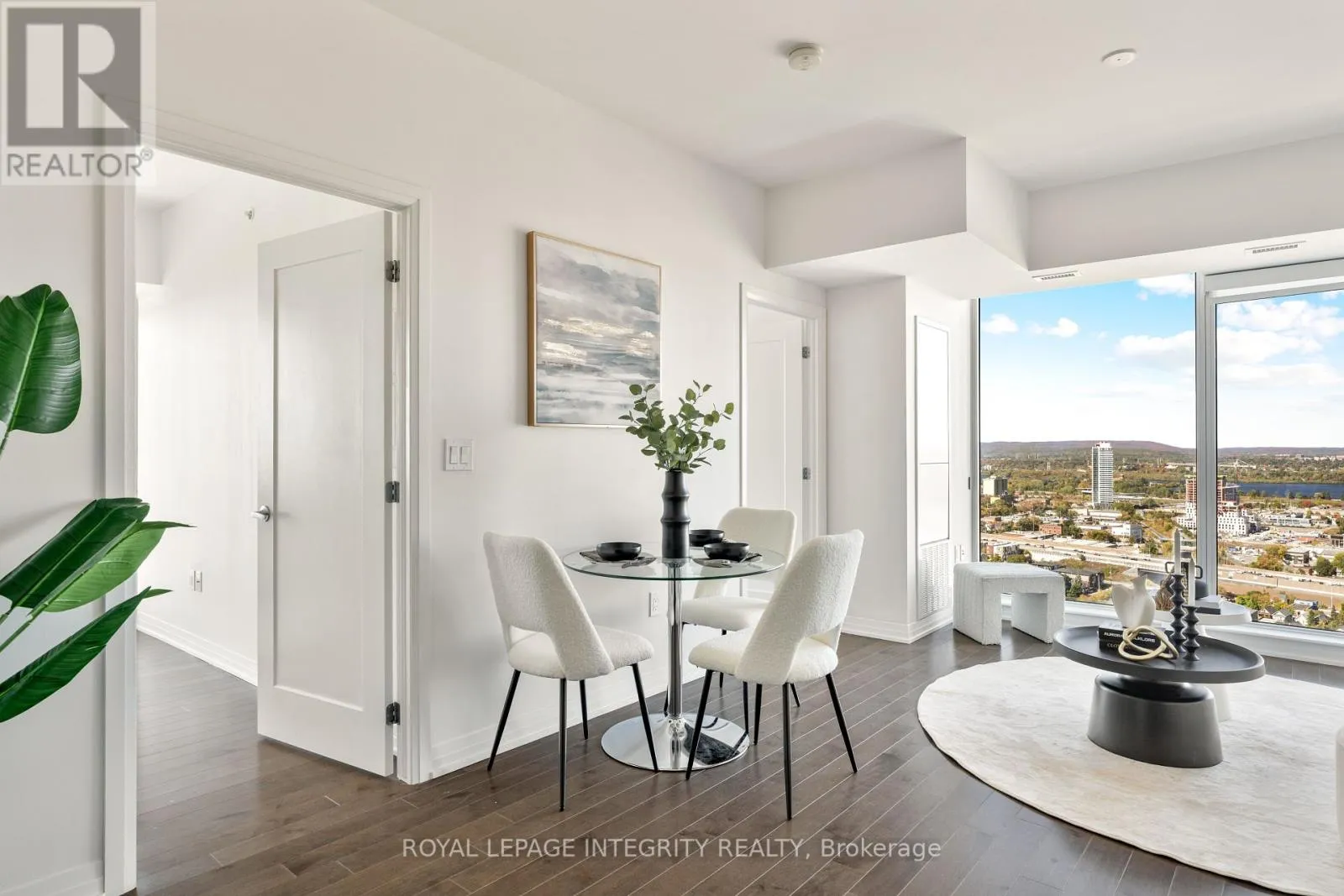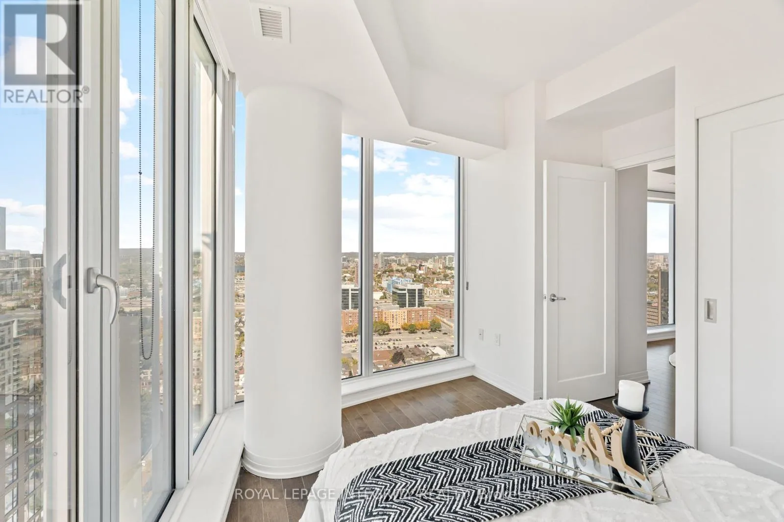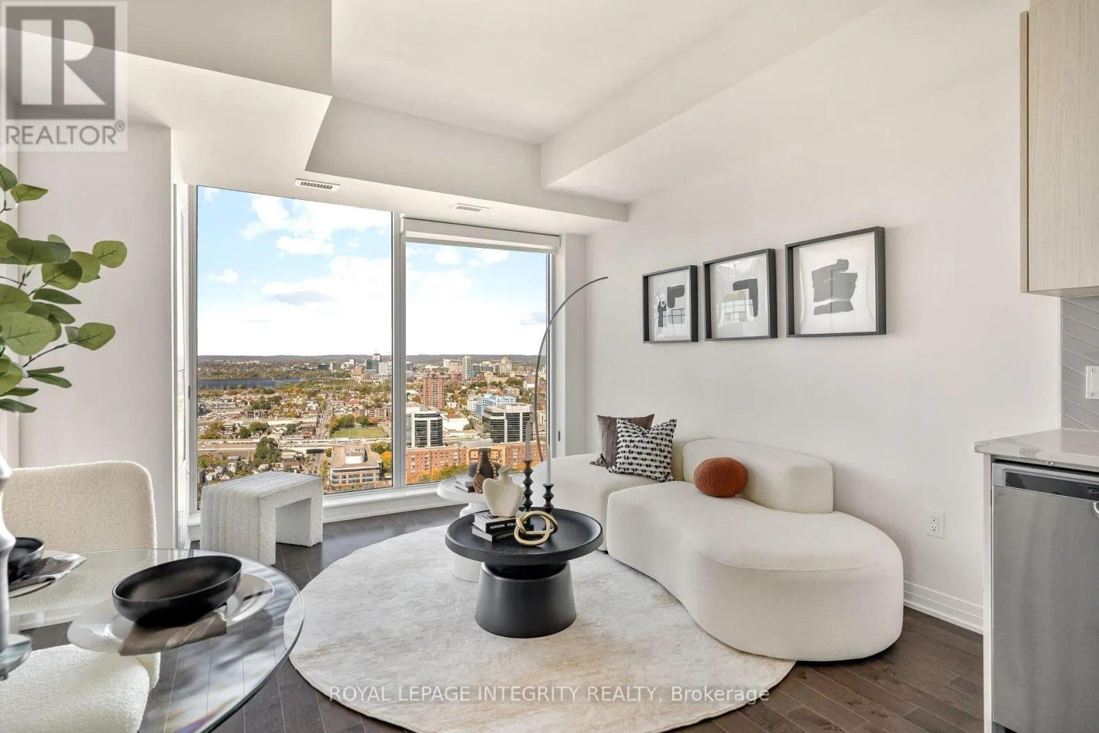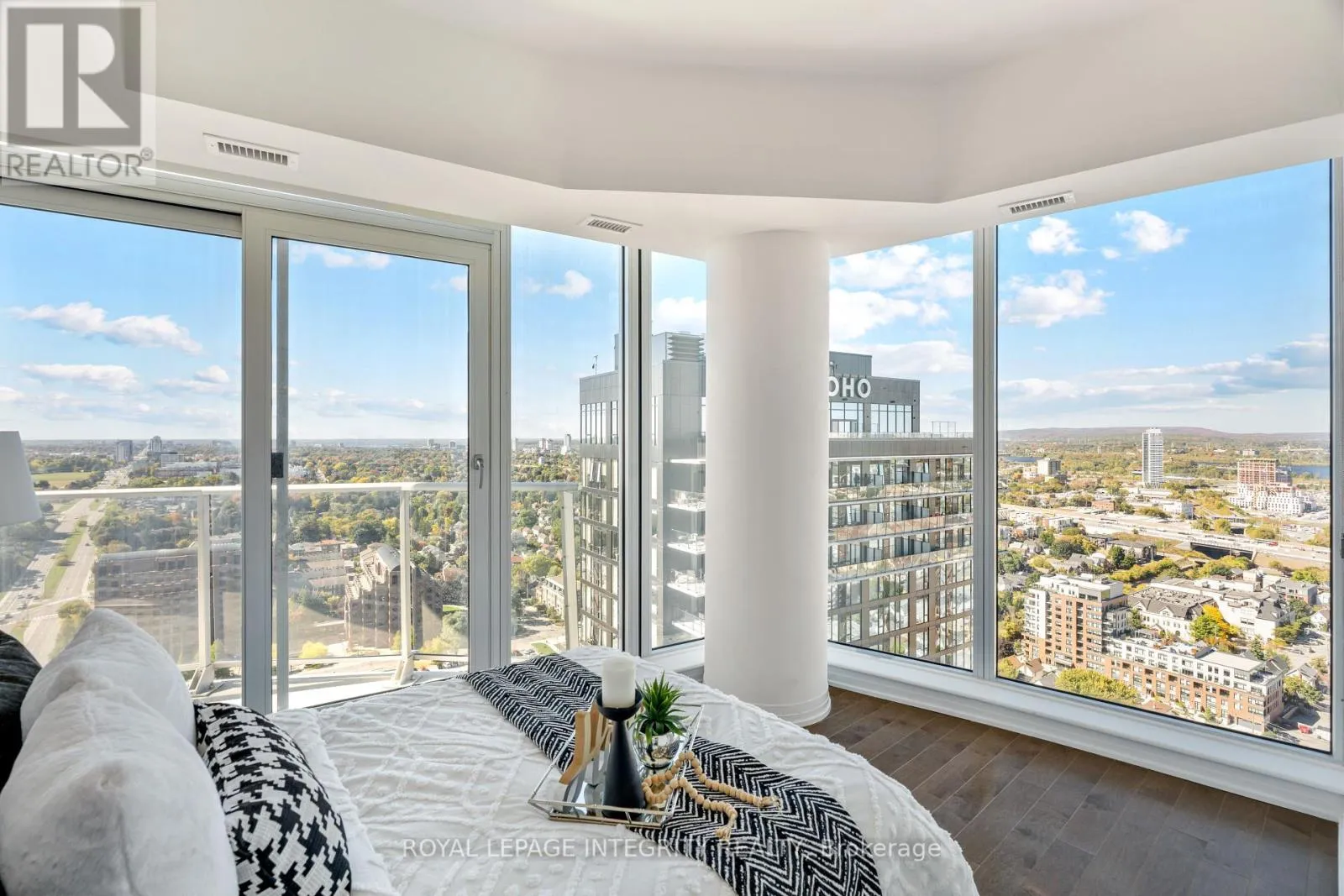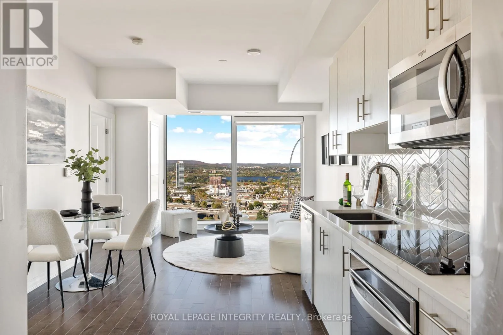 Cross Streets: Preston / Carling. ** Directions: Preston to Carling. Welcome to elevated living at The Icon - Ottawa's most prestigious address. Perched on the 29th floor, this freshly painted corner-unit residence offers breathtaking views of the Gatineau Hills and radiant sunsets over the city. Designed for the discerning buyer, this 2-bedroom, 1-bath home is a masterclass in sophistication and comfort. Step inside to a bright, open-concept layout adorned with soaring 9-ft ceilings, floor-to-ceiling windows, and timeless finishes. Sleek hardwood floors flow throughout, anchored by the chefs kitchen complete with gleaming quartz countertops, modern cabinetry, and high-end stainless steel appliances. Both bedrooms offer large closets and access to a private, shared balcony - perfect for your morning coffee or evening wine with panoramic views. Enjoy the ease of in-unit laundry, underground parking, and a spacious storage locker. Resort-style amenities elevate your lifestyle: fully equipped gym with lake views, yoga studio, indoor pool, sauna, theatre, party room, rooftop terrace with BBQs, and 24-hour concierge service. Located beside Dows Lake and vibrant Little Italy, you're surrounded by Ottawa's best dining, cafés, festivals, and outdoor activities - skating, kayaking, cycling and more. Just minutes from downtown. Live above it all - luxury, lifestyle, location. Book your private showing today! (id:27476)