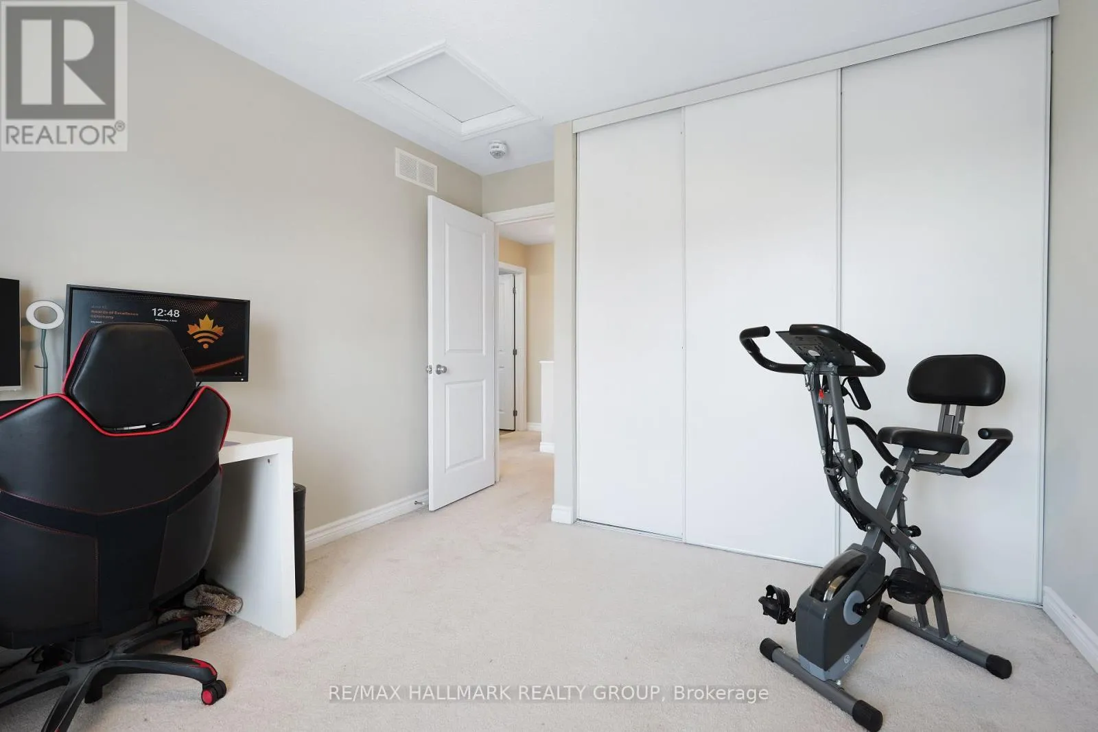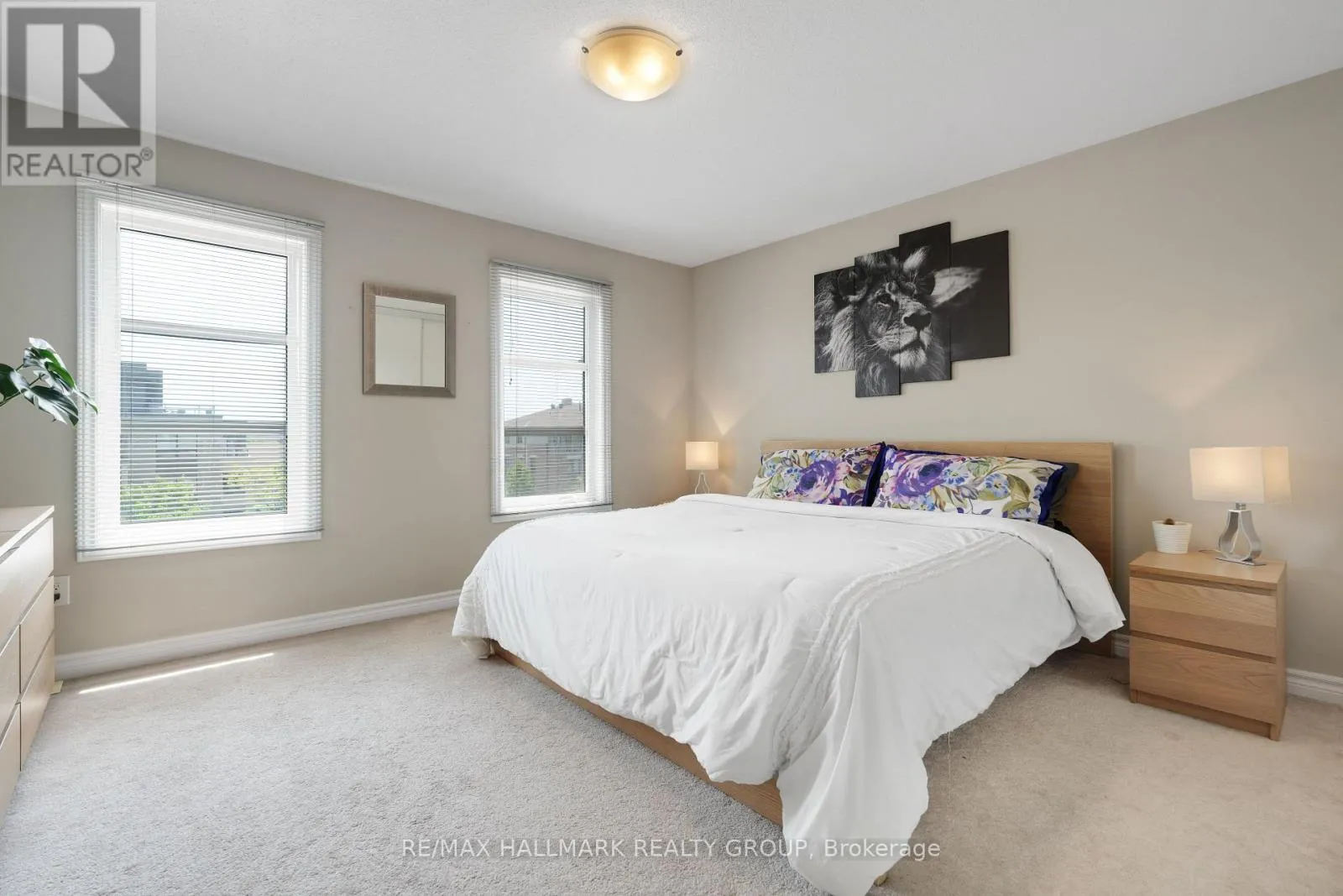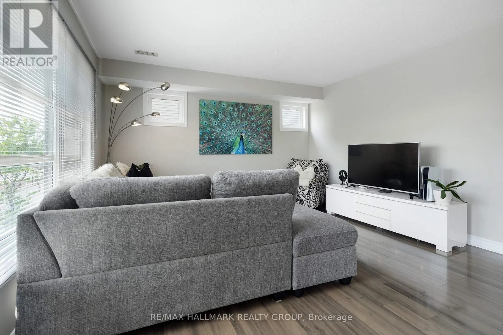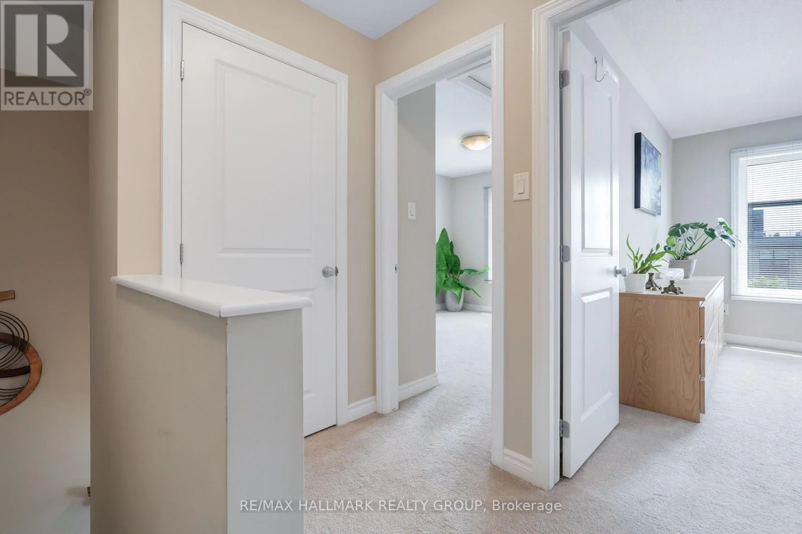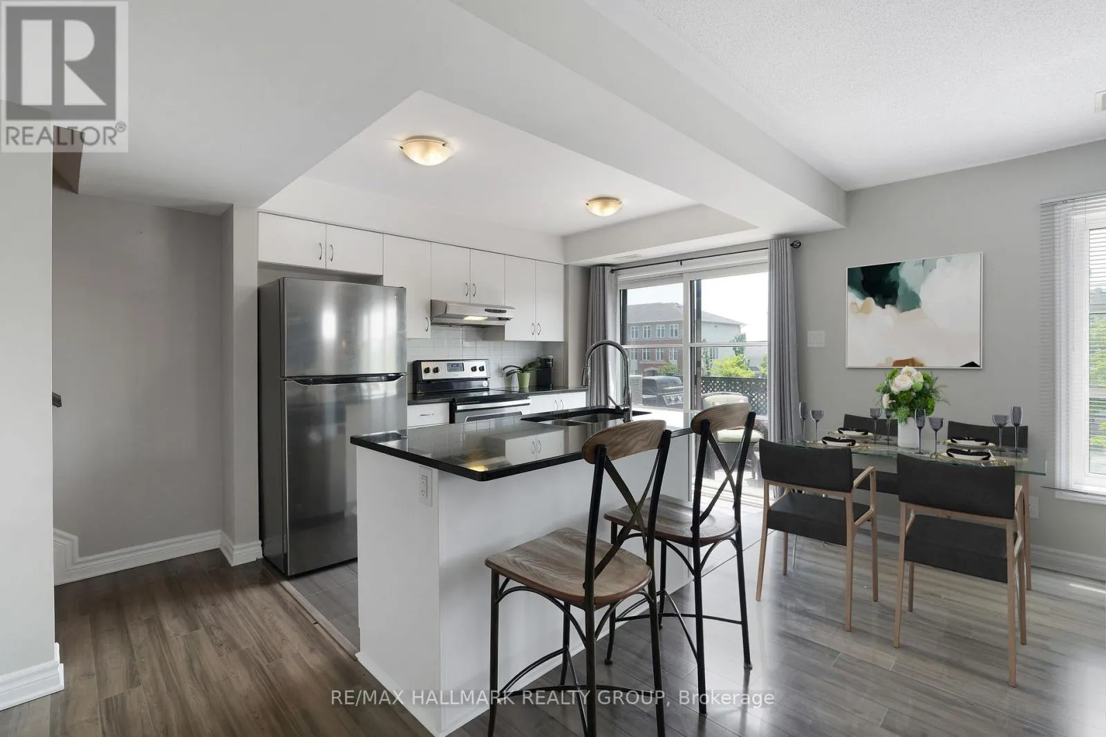 Cross Streets: Chapman Mills & Longfields. ** Directions: South on Woodroffe Avenue to Chapman Mills then turn West (right) property is on the northwest side of road (right) side just before Longfields Drive. Note: parking located behind the building. Stunning Upper End-Unit Condo in Prime Barrhaven Location Welcome to this bright and modern 2-bedroom, 1.5-bathroom upper end-unit condo, just a short stroll from the vibrant Chapman Mills Marketplace. Enjoy the convenience of restaurants, shops, Loblaws, and a movie theatre all within walking distance! Designed with an open-concept layout and flooded with natural light thanks to its desirable eastern exposure, this home is perfect for first-time buyers, professionals, downsizers, or investors alike. The main level features a stylish white kitchen with quartz countertops, ceramic tile flooring, and stainless-steel appliances. The large island breakfast bar offers ample space for meal prep and casual dining, making it ideal for entertaining. The living and dining areas showcase wide plank grey laminate flooring and expansive windows with custom window coverings. A terrace door off the dining area leads to a spacious private balcony, perfect for morning coffee or evening BBQs. A convenient powder room completes the main level. Upstairs, you'll find two generous bedrooms with wall-to-wall closets and neutral broadloom, along with a full 4-piece bathroom featuring ceramic tile flooring and a tiled tub/shower. A second-floor laundry closet adds everyday functionality. This home includes one dedicated parking space, with plenty of visitor parking nearby. Enjoy the ease of urban living with parks, schools, and transit at your doorstep, including a direct 25-minute bus ride to downtown Ottawa. Everything you need is within walking distance, and the cost to purchase with minimum down payment is equivalent to renting in the area. Move-in ready and perfectly located don't miss this opportunity to own a stylish condo in one of Barrhavens most walkable and well-connected neighbourhoods! (id:27476)