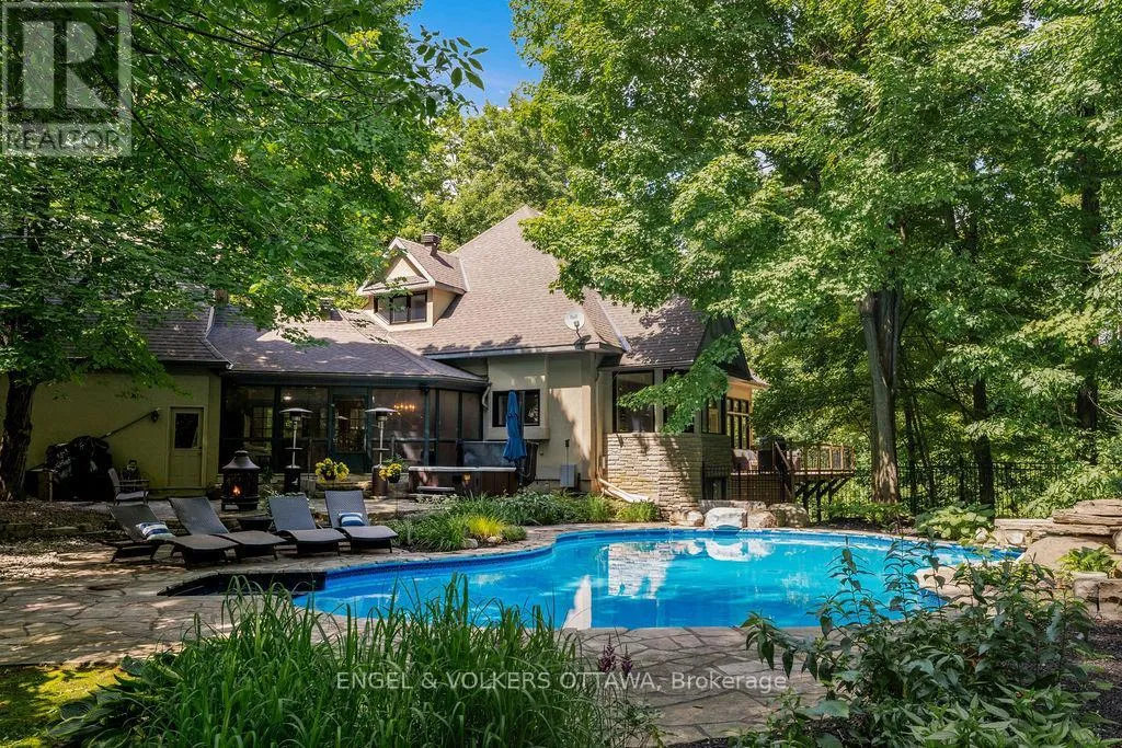 Cross Streets: North on March Road, Turn right on Maxwell, Turn right on Hedge which turns into Houston. Property is on the right. ** Directions: Exit 138, keep right on March Road, turn right on Maxwell, turn right on Hedge Drive (which turns into Houston). Property is on the right. Designed by renowned architect Gerhard Linse, this award-winning home blends timeless elegance with modern luxury. Set on a private 2-acre lot in a prestigious estate enclave, this exceptional home offers a peaceful retreat just minutes from Kanata North and . Enjoy a breathtaking living room with panoramic windows and a new deck overlooking the lush backyard with a heated saltwater pool, hot tub, and gardens. The chef's kitchen features custom cabinetry, a gas range, built-in pantry, and bistro-style dining area.The main-floor primary suite is a spa-inspired retreat with marble finishes, a soaker tub, double vanity, and glass shower. Upstairs, two bedrooms share a stylish Jack & Jill bath.The walk-out lower level adds a bedroom, games and theatre rooms, wood-burning fireplace, and new full bath. Major updates include new furnace, triple-pane windows, reverse-osmosis water treatment, high-end bathroom renovations and much more. Incredible location moments to the sought-after Kanata North - Ottawas Premier Tech Hub, enjoy proximity to leading tech companies such as Nokia, Mitel, Ciena and Cisco. Top-rated schools, both public and private are minutes away: Kanata Montessori School, March Academy, Blue Sky School, Peak Center Academy, Kanata Academy, St.Isidore Catholic School and many more. ****Visit the listing website for full details and list of updates.**** (id:27476)