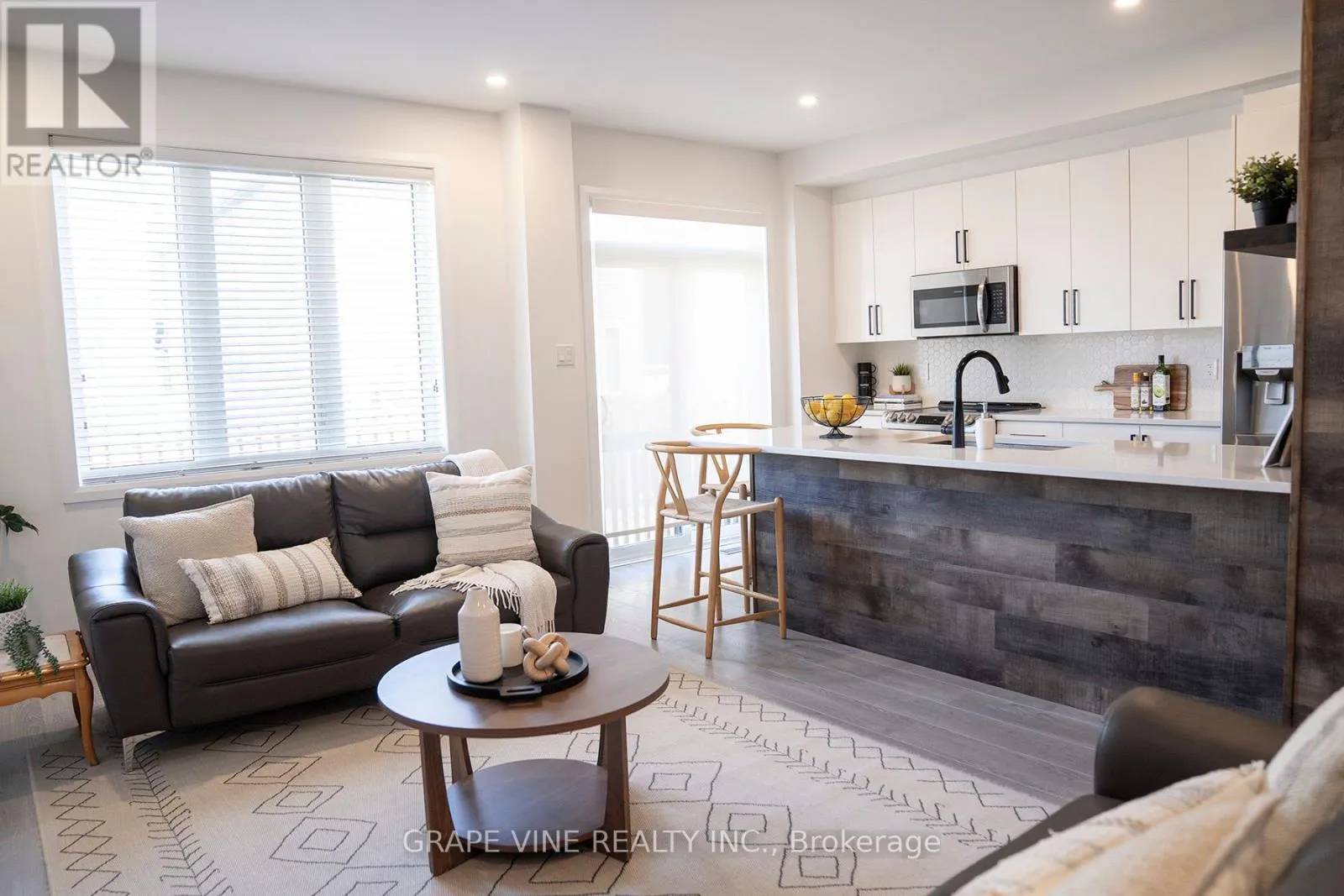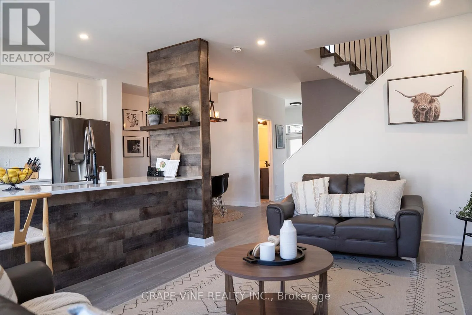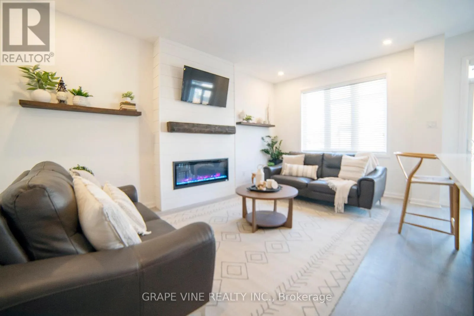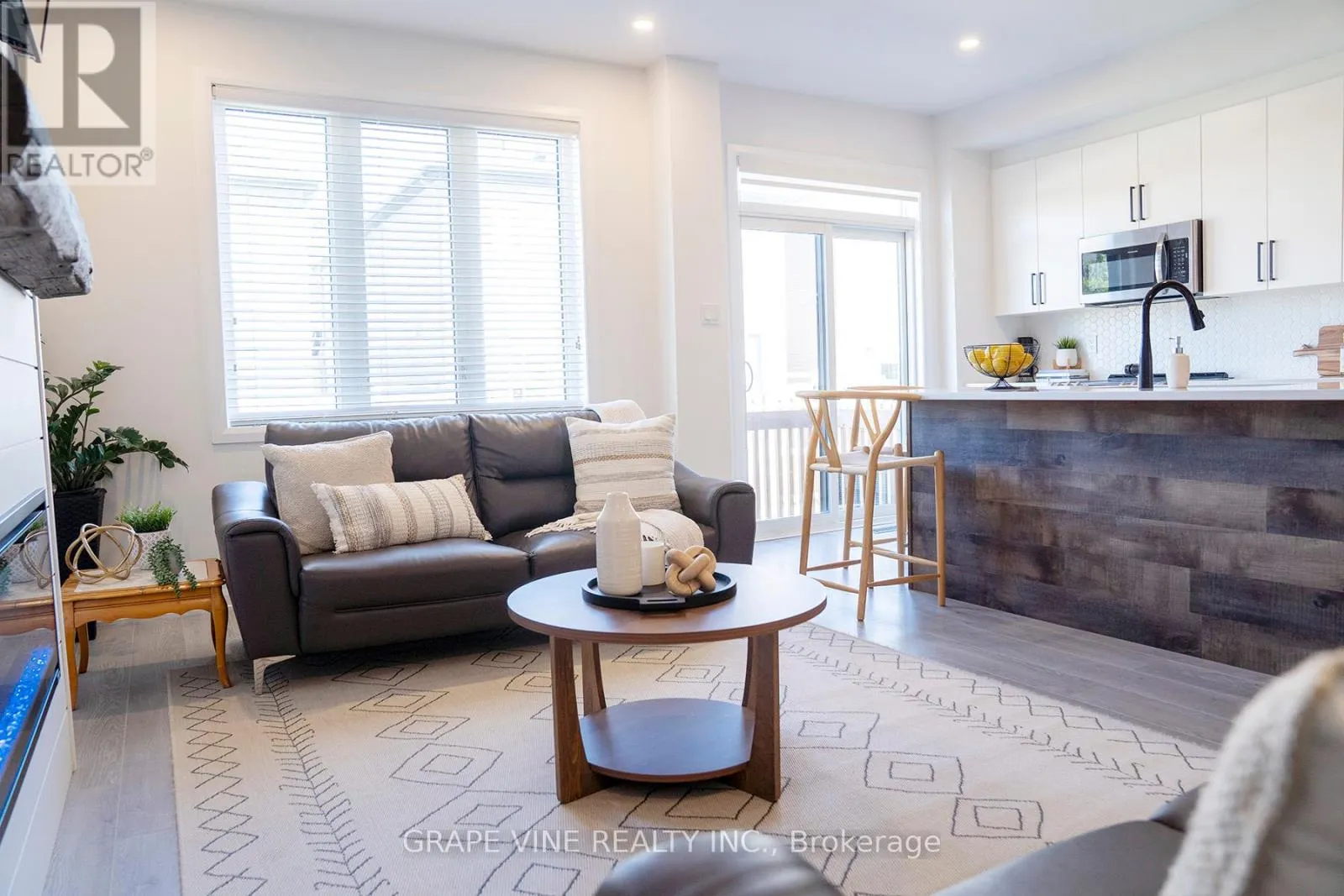 Cross Streets: Robin Easey. ** Directions: Located in the beautiful Quinn's Pointe Community near Greenbank and Barnsdale. Turn from Greenbank onto Cappamore, right onto Robin Easey, left onto Caltra Cres. Move-in ready! Welcome to this beautiful, newly built (2021) and upgraded 3 bedroom contemporary freehold townhome showcasing over $60,000 in premium upgrades. Enjoy high-end flooring throughout, including the finished basement, and a bright, open-concept layout perfect for modern living. The chef's kitchen features quartz countertops, an oversized island, sleek backsplash, and stainless steel appliances-ideal for entertaining. The living room boasts large windows and a custom gas fireplace with a rustic beam mantel and stylish board-and-batten detail. Upstairs, the primary suite offers a walk-in closet and spa-inspired ensuite, while two additional south-facing bedrooms share a beautifully upgraded full bath. Additional highlights include quartz counters in all baths, pot lights, California shutters, custom blinds, iron spindle staircase, upgraded lighting, spacious garage, and more. Backing onto single-family homes and steps from schools, parks, transit, shopping, and the Minto Rec Centre, this stylish, sun-filled home in Quinn's Pointe/Half Moon Bay is the perfect blend of comfort and sophistication. (id:27476)