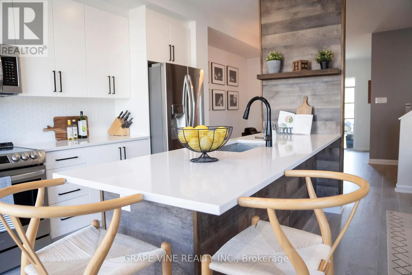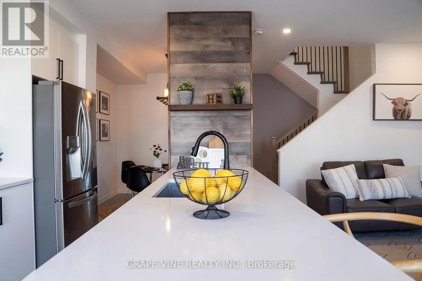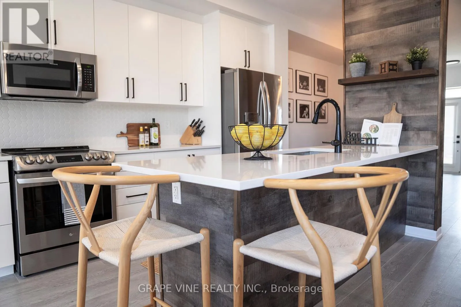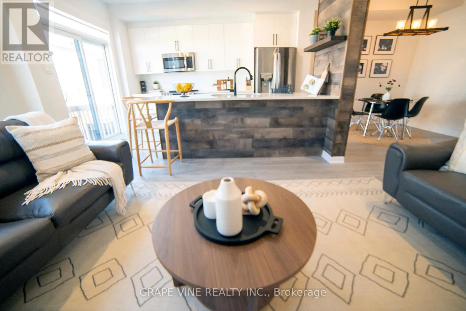 Cross Streets: Robin Easey. ** Directions: Located in the beautiful Quinn's Pointe Community near Greenbank and Barnsdale. Turn from Greenbank onto Cappamore, right onto Robin Easey, left onto Caltra Cres. Move-in ready! Welcome to this beautiful, newly built (2021) and upgraded 3 bedroom contemporary freehold townhome showcasing over $60,000 in premium upgrades. Enjoy high-end flooring throughout, including the finished basement, and a bright, open-concept layout perfect for modern living. The chef's kitchen features quartz countertops, an oversized island, sleek backsplash, and stainless steel appliances-ideal for entertaining. The living room boasts large windows and a custom gas fireplace with a rustic beam mantel and stylish board-and-batten detail. Upstairs, the primary suite offers a walk-in closet and spa-inspired ensuite, while two additional south-facing bedrooms share a beautifully upgraded full bath. Additional highlights include quartz counters in all baths, pot lights, California shutters, custom blinds, iron spindle staircase, upgraded lighting, spacious garage, and more. Backing onto single-family homes and steps from schools, parks, transit, shopping, and the Minto Rec Centre, this stylish, sun-filled home in Quinn's Pointe/Half Moon Bay is the perfect blend of comfort and sophistication. (id:27476)