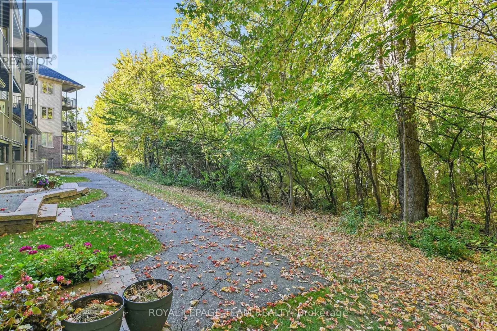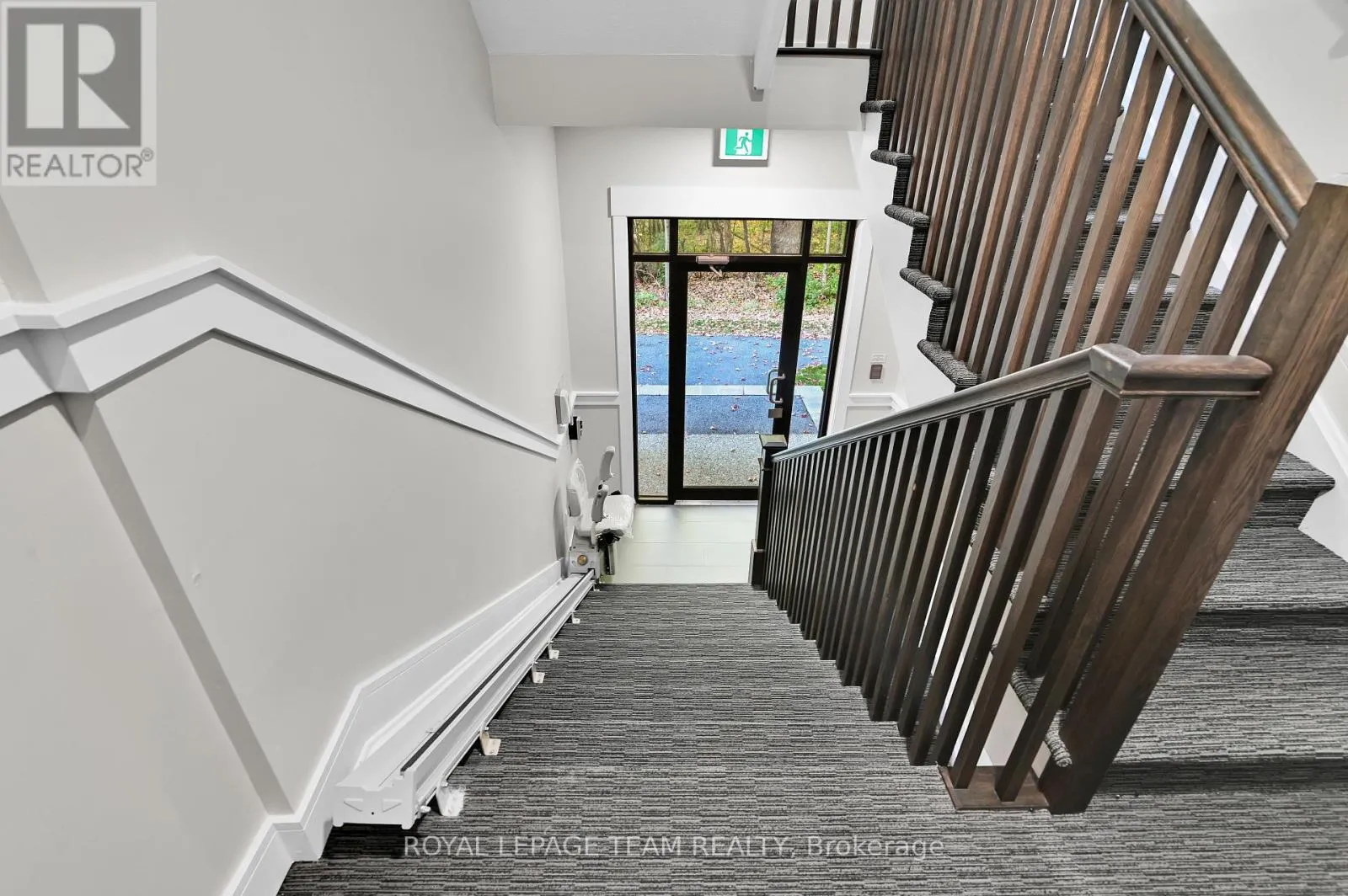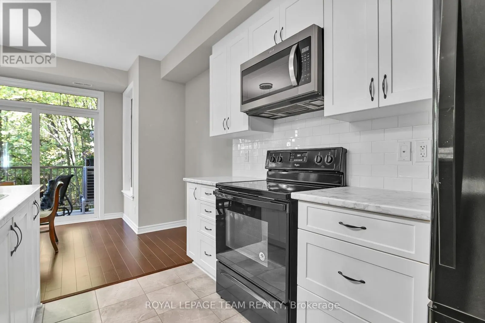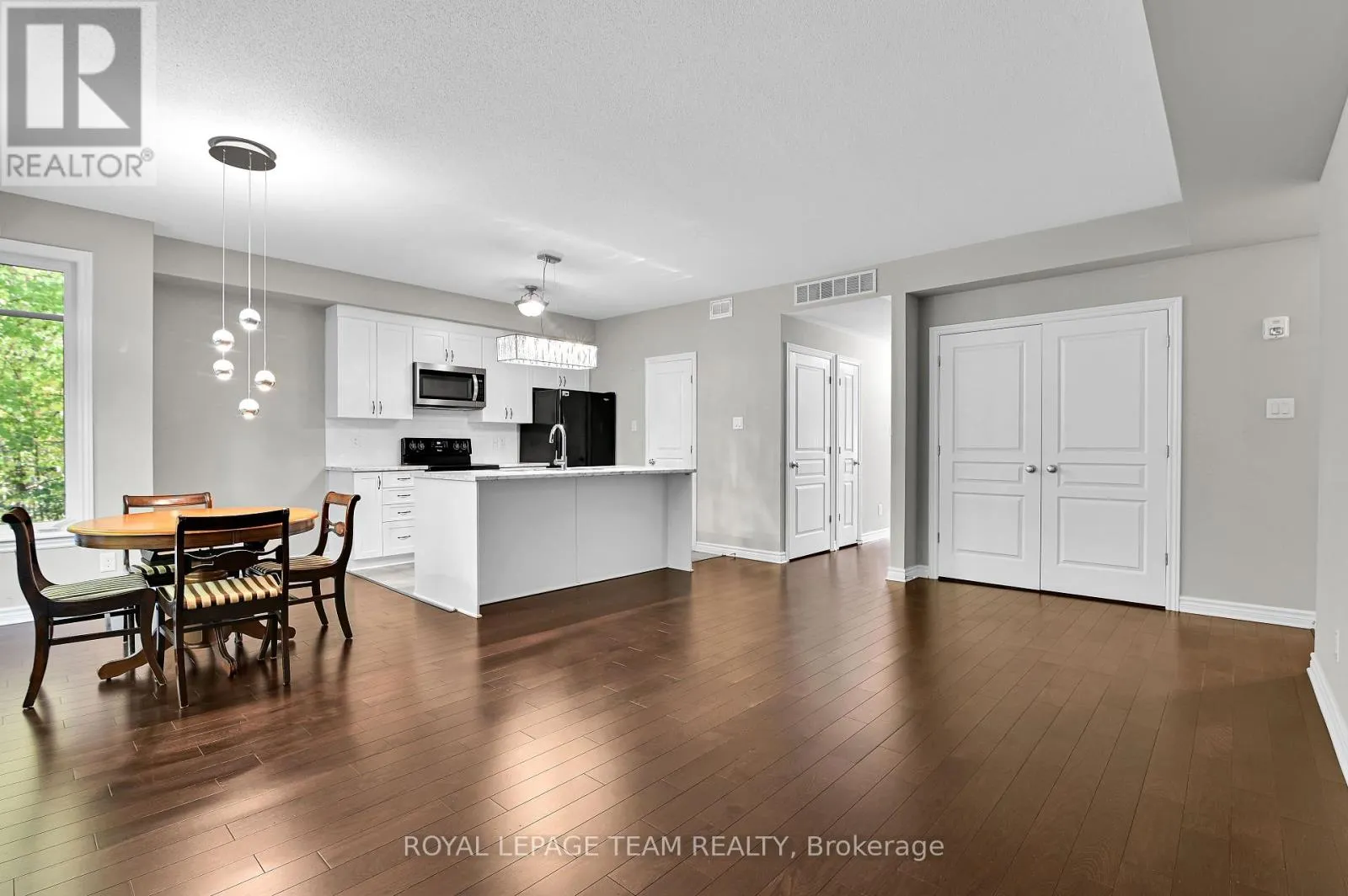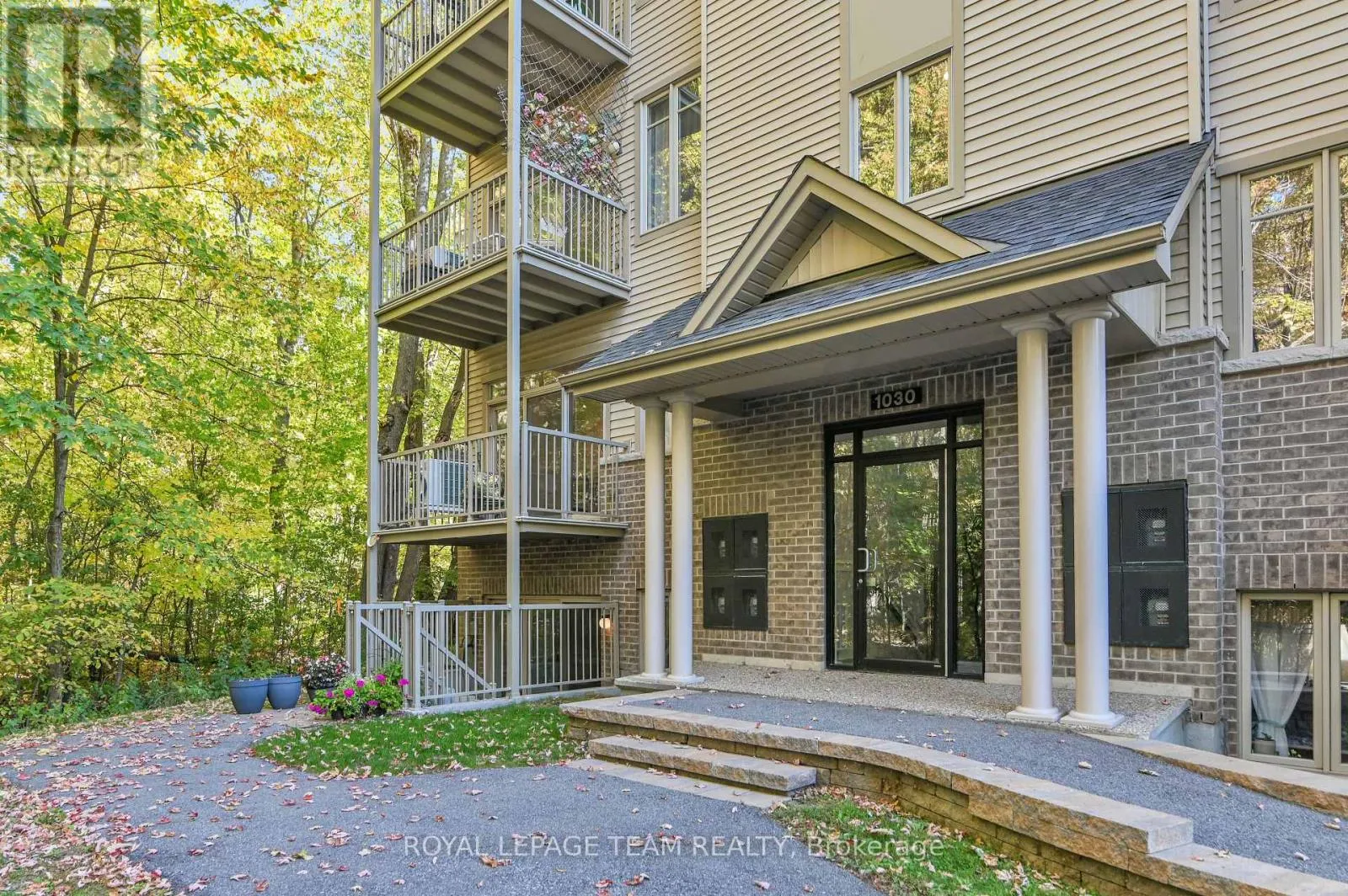 Cross Streets: Earl Armstrong & Canyon Walk. ** Directions: Earl Armstrong to Canyon Walk to Beryl Pvt. Exceptional 2 bedroom, 2 bath, END UNIT backing onto beautiful trees and with a private balcony to sit and enjoy nature. There are so many great features of this particular unit and with it's ideal location, there is only 1 shared wall which is in the foyer. The open concept plan showcases the spaciousness (and 9' ceilings) and the natural light that fills the home. Beautiful hardwood flooring in the primary living areas and cozy carpeting in both bedrooms, all in excellent condition. The bright European style designer kitchen offers a convenient pantry and large breakfast bar at the center island. Gorgeous, upgraded lighting adds to the comfort of the tasteful decor. The Primary bedroom is spacious, and provides a walk-in closet and lovely 3 piece ensuite with walk-in shower. There is also a roomy second bedroom and 4 piece main bathroom with tub / shower combo complete with subway tiles. Enjoy the in-unit, full size washer / dryer and handy linen closet. This condo has 2 separate entries and is only 1 short flight of stairs up from the front entrance. The second entrance has ramp access and a stairlift along with an extra wide door making access easier for those with mobility restrictions. The Primary bedroom and main bathroom also have wider doorways (33"). TWO PARKING SPOTS, one directly outside the front door! An easy walk to the new O-Train, OC Transpo bus, and loads of new retail outlets. This condo has Energy Star rating with low E-Argon windows, higher insulation in exterior walls and high efficiency furnace. Water is included in the condo fees. No smoking permitted in units or in common areas. Pets are allowed. Don't wait...this unit stands out, and with all the special features, it won't be around for long!! (id:27476)