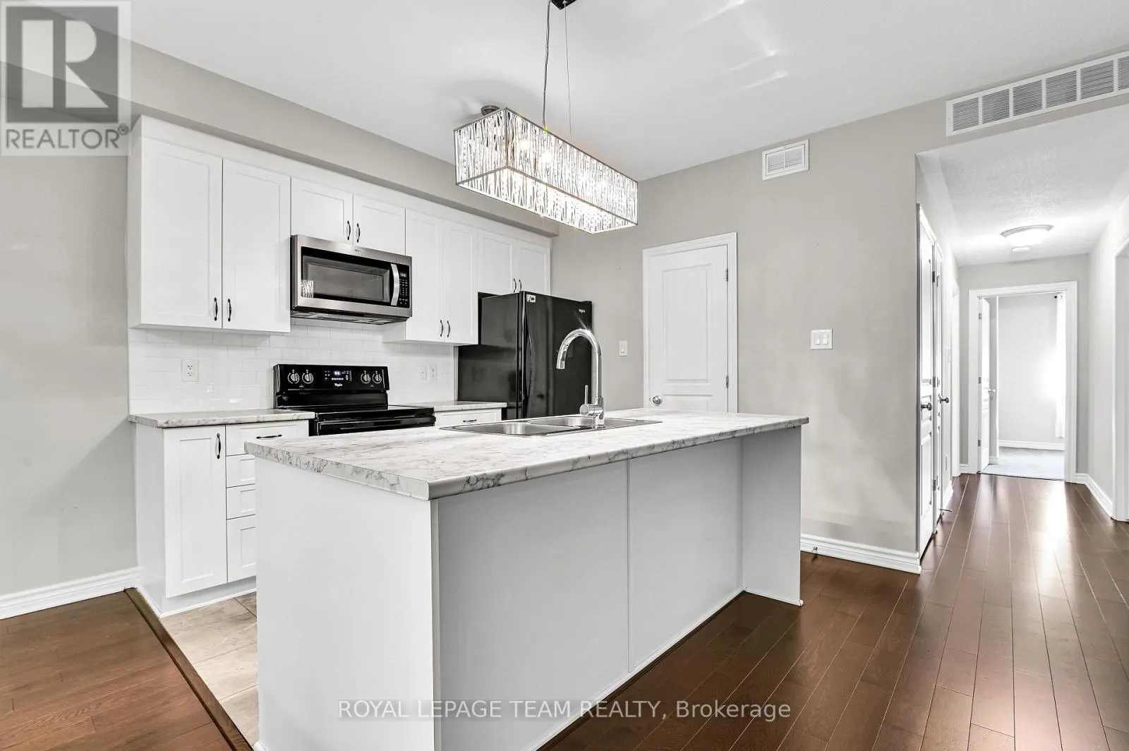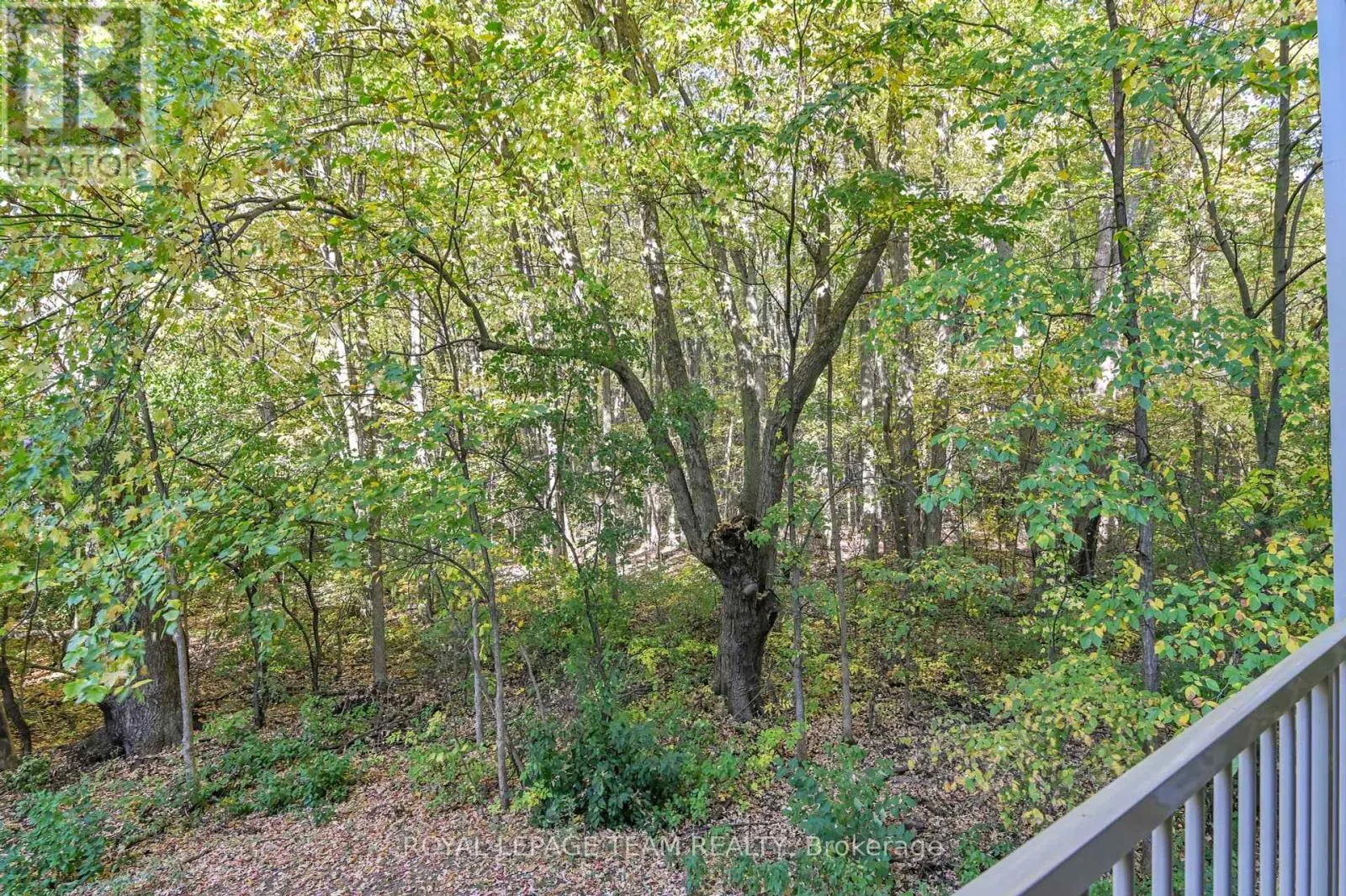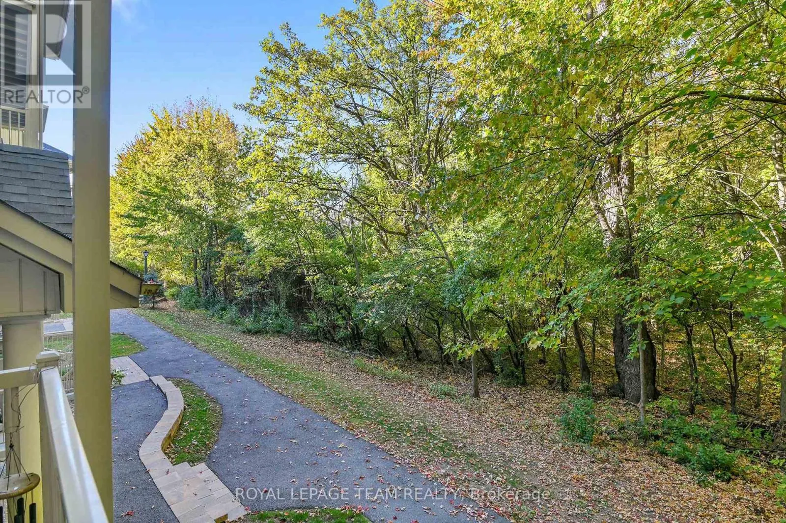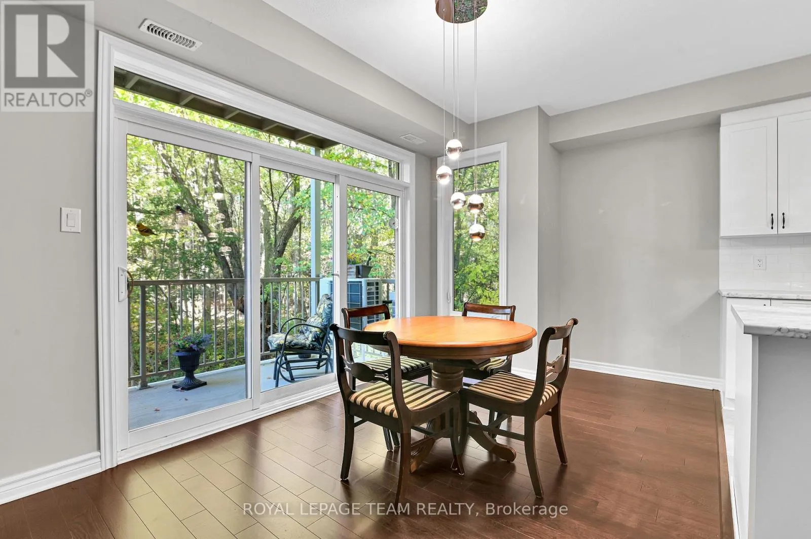 Cross Streets: Earl Armstrong & Canyon Walk. ** Directions: Earl Armstrong to Canyon Walk to Beryl Pvt. Exceptional 2 bedroom, 2 bath, END UNIT backing onto beautiful trees and with a private balcony to sit and enjoy nature. There are so many great features of this particular unit and with it's ideal location, there is only 1 shared wall which is in the foyer. The open concept plan showcases the spaciousness (and 9' ceilings) and the natural light that fills the home. Beautiful hardwood flooring in the primary living areas and cozy carpeting in both bedrooms, all in excellent condition. The bright European style designer kitchen offers a convenient pantry and large breakfast bar at the center island. Gorgeous, upgraded lighting adds to the comfort of the tasteful decor. The Primary bedroom is spacious, and provides a walk-in closet and lovely 3 piece ensuite with walk-in shower. There is also a roomy second bedroom and 4 piece main bathroom with tub / shower combo complete with subway tiles. Enjoy the in-unit, full size washer / dryer and handy linen closet. This condo has 2 separate entries and is only 1 short flight of stairs up from the front entrance. The second entrance has ramp access and a stairlift along with an extra wide door making access easier for those with mobility restrictions. The Primary bedroom and main bathroom also have wider doorways (33"). TWO PARKING SPOTS, one directly outside the front door! An easy walk to the new O-Train, OC Transpo bus, and loads of new retail outlets. This condo has Energy Star rating with low E-Argon windows, higher insulation in exterior walls and high efficiency furnace. Water is included in the condo fees. No smoking permitted in units or in common areas. Pets are allowed. Don't wait...this unit stands out, and with all the special features, it won't be around for long!! (id:27476)