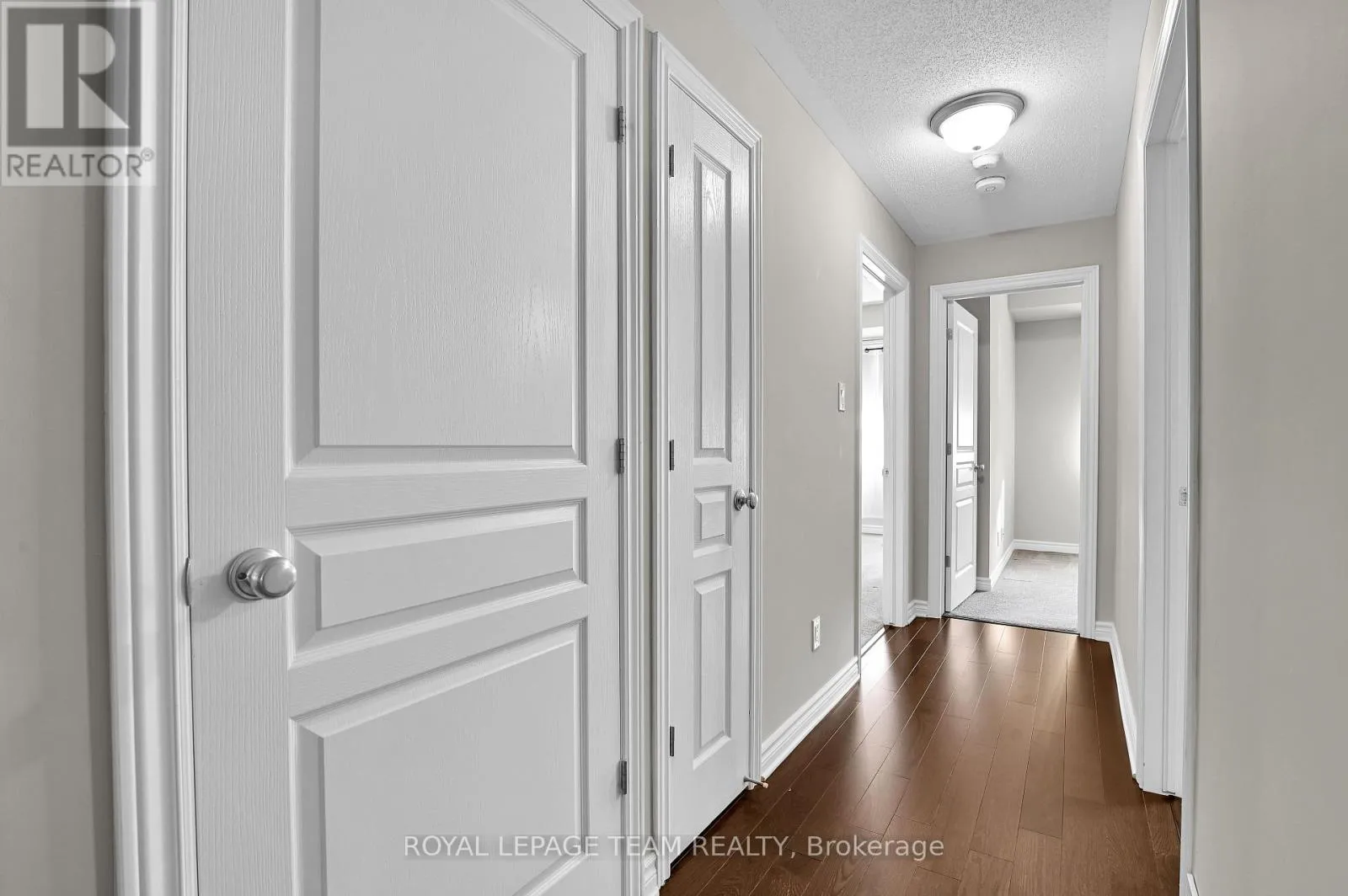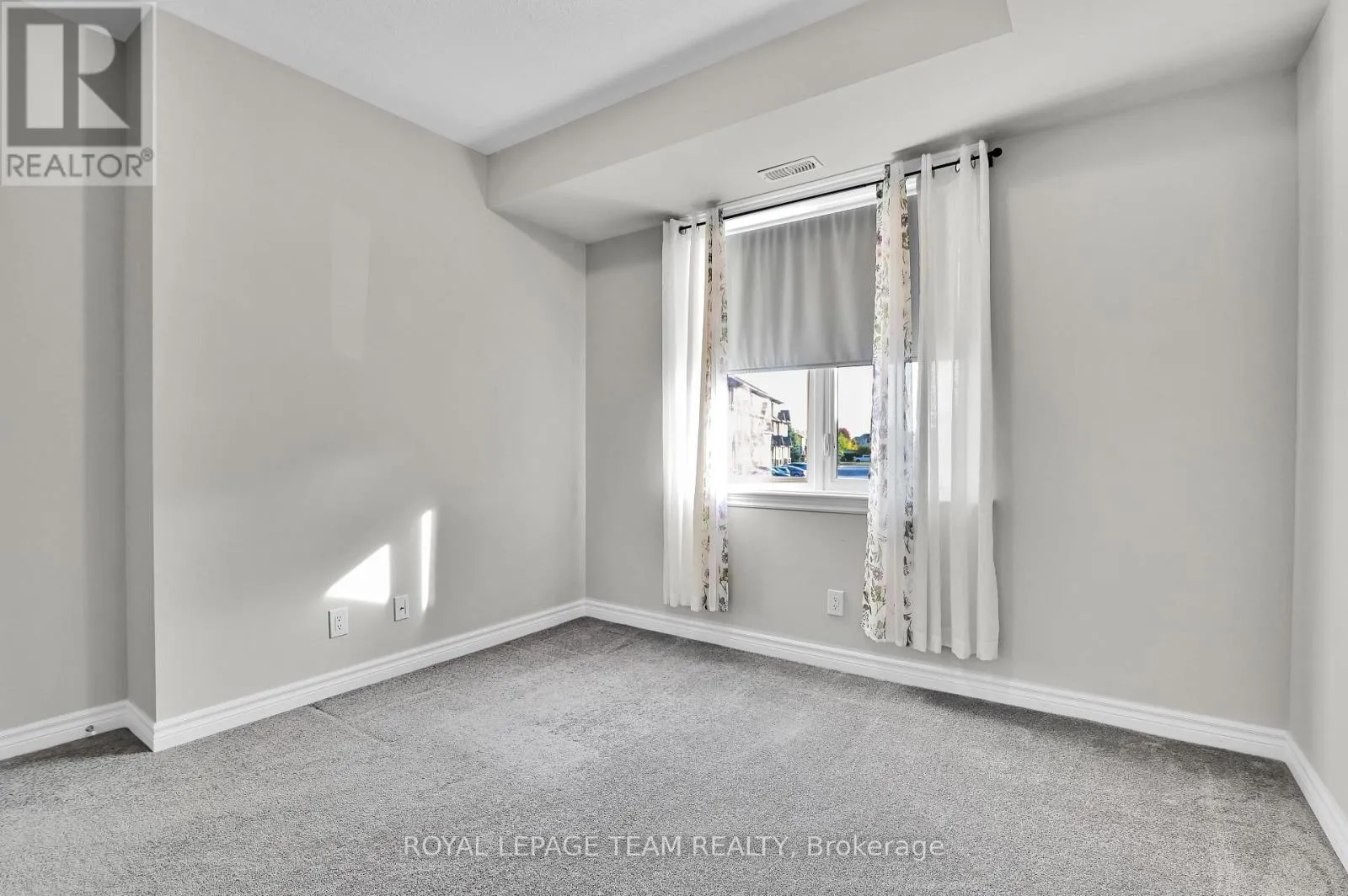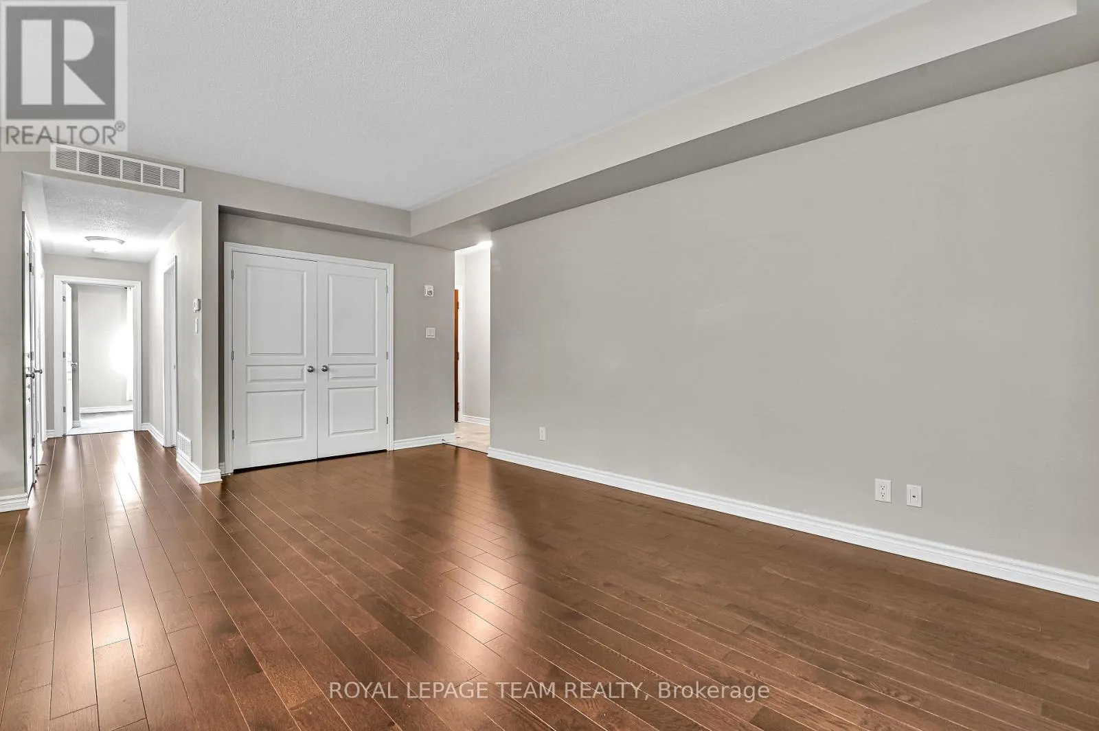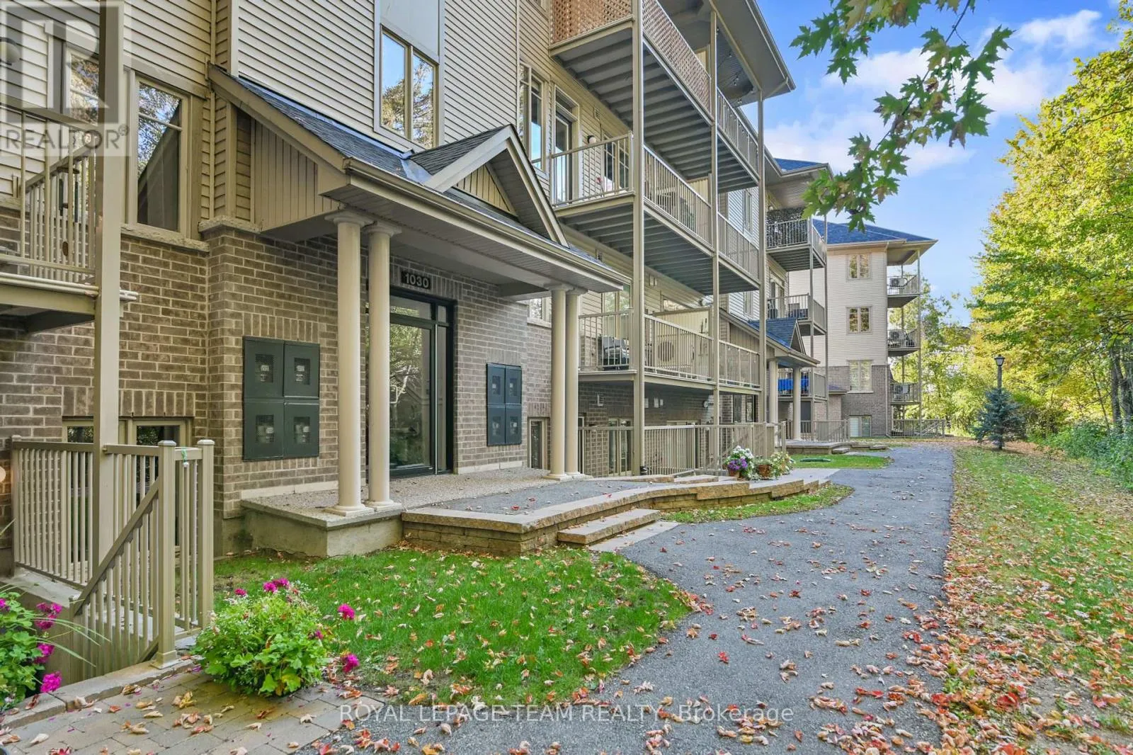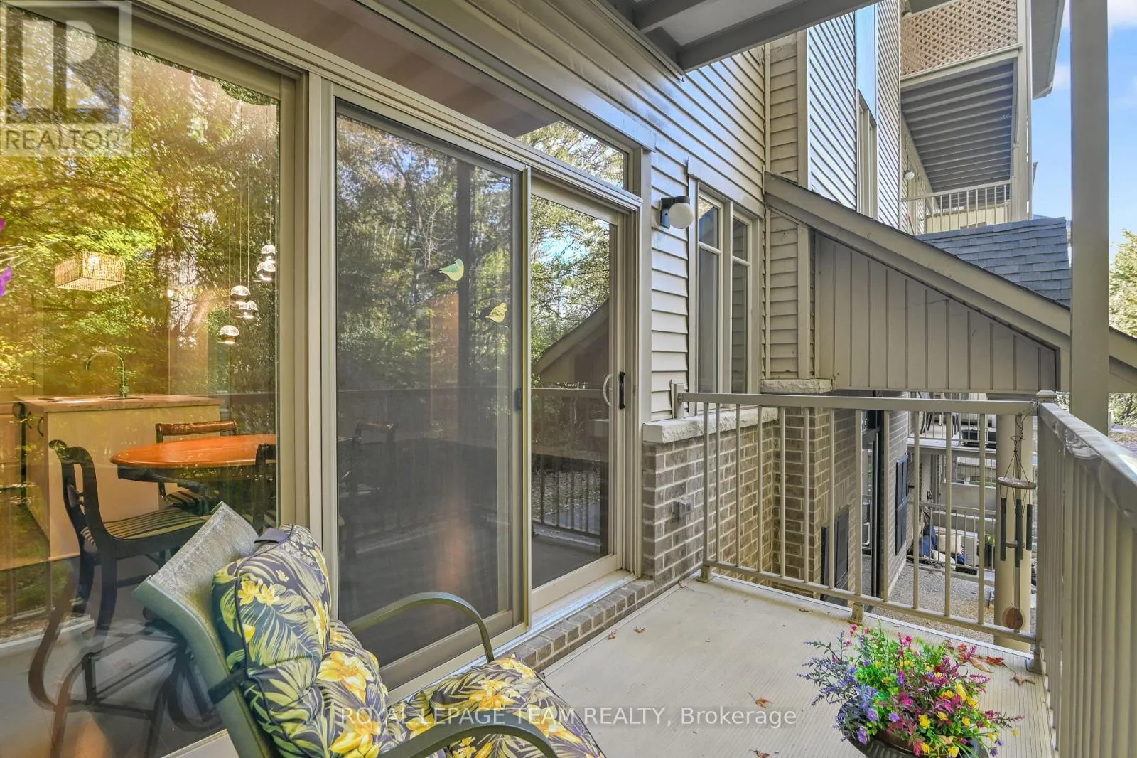 Cross Streets: Earl Armstrong & Canyon Walk. ** Directions: Earl Armstrong to Canyon Walk to Beryl Pvt. Exceptional 2 bedroom, 2 bath, END UNIT backing onto beautiful trees and with a private balcony to sit and enjoy nature. There are so many great features of this particular unit and with it's ideal location, there is only 1 shared wall which is in the foyer. The open concept plan showcases the spaciousness (and 9' ceilings) and the natural light that fills the home. Beautiful hardwood flooring in the primary living areas and cozy carpeting in both bedrooms, all in excellent condition. The bright European style designer kitchen offers a convenient pantry and large breakfast bar at the center island. Gorgeous, upgraded lighting adds to the comfort of the tasteful decor. The Primary bedroom is spacious, and provides a walk-in closet and lovely 3 piece ensuite with walk-in shower. There is also a roomy second bedroom and 4 piece main bathroom with tub / shower combo complete with subway tiles. Enjoy the in-unit, full size washer / dryer and handy linen closet. This condo has 2 separate entries and is only 1 short flight of stairs up from the front entrance. The second entrance has ramp access and a stairlift along with an extra wide door making access easier for those with mobility restrictions. The Primary bedroom and main bathroom also have wider doorways (33"). TWO PARKING SPOTS, one directly outside the front door! An easy walk to the new O-Train, OC Transpo bus, and loads of new retail outlets. This condo has Energy Star rating with low E-Argon windows, higher insulation in exterior walls and high efficiency furnace. Water is included in the condo fees. No smoking permitted in units or in common areas. Pets are allowed. Don't wait...this unit stands out, and with all the special features, it won't be around for long!! (id:27476)