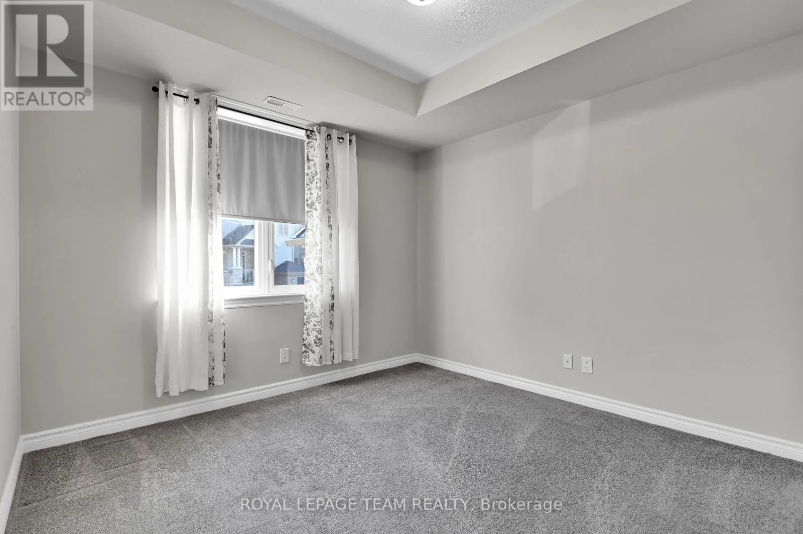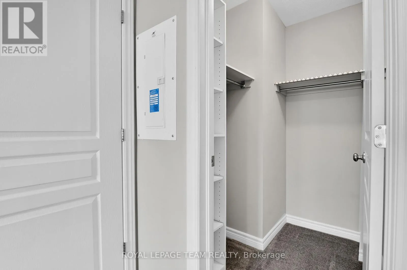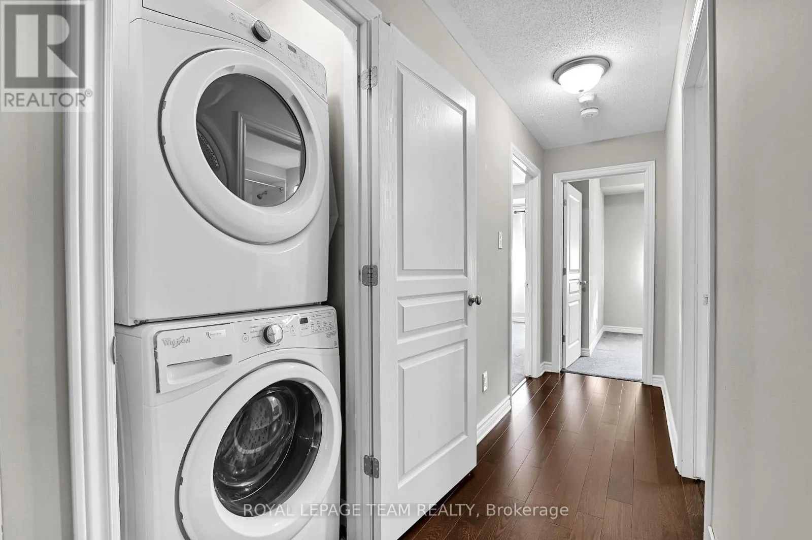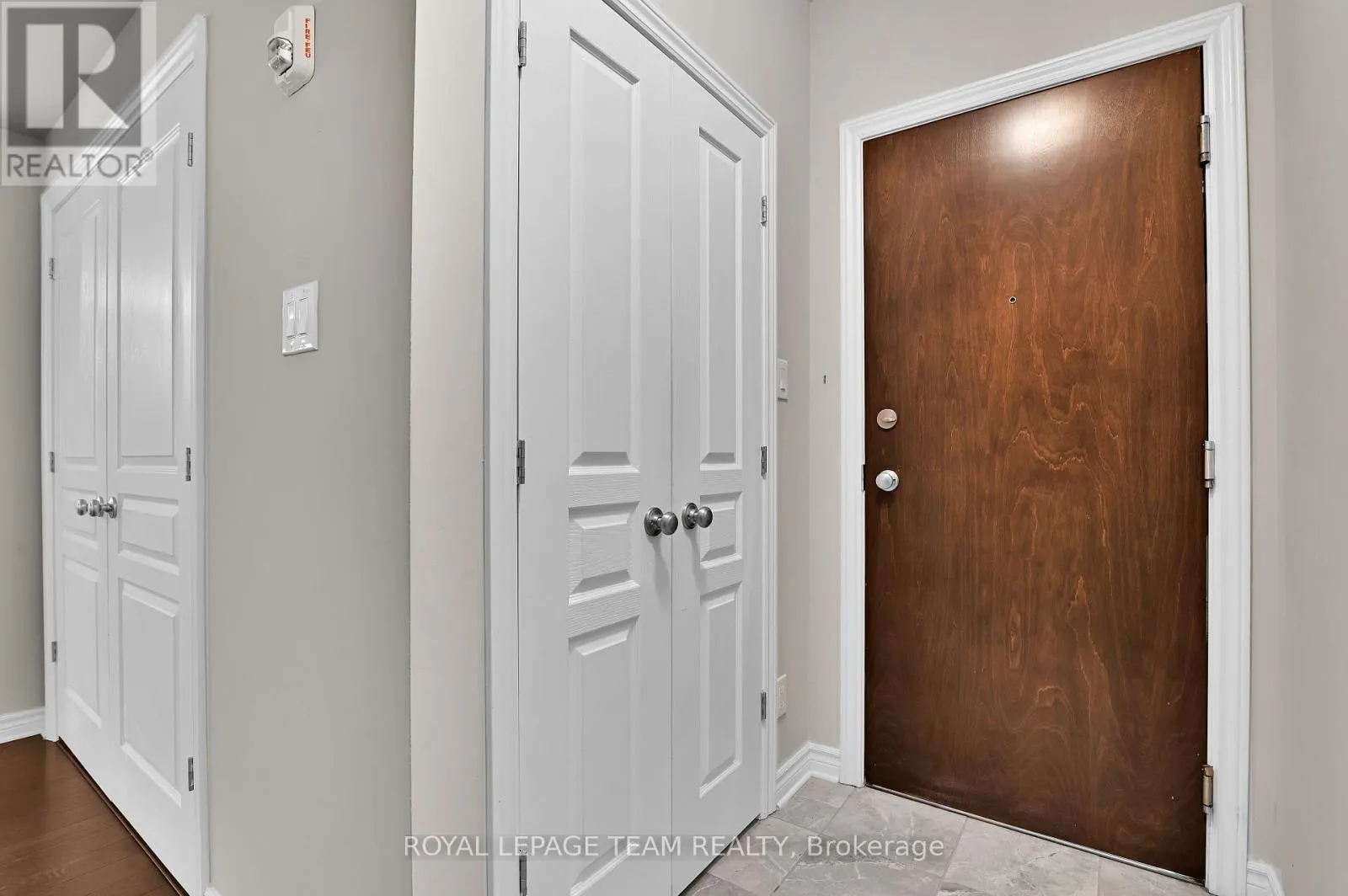 Cross Streets: Earl Armstrong & Canyon Walk. ** Directions: Earl Armstrong to Canyon Walk to Beryl Pvt. Exceptional 2 bedroom, 2 bath, END UNIT backing onto beautiful trees and with a private balcony to sit and enjoy nature. There are so many great features of this particular unit and with it's ideal location, there is only 1 shared wall which is in the foyer. The open concept plan showcases the spaciousness (and 9' ceilings) and the natural light that fills the home. Beautiful hardwood flooring in the primary living areas and cozy carpeting in both bedrooms, all in excellent condition. The bright European style designer kitchen offers a convenient pantry and large breakfast bar at the center island. Gorgeous, upgraded lighting adds to the comfort of the tasteful decor. The Primary bedroom is spacious, and provides a walk-in closet and lovely 3 piece ensuite with walk-in shower. There is also a roomy second bedroom and 4 piece main bathroom with tub / shower combo complete with subway tiles. Enjoy the in-unit, full size washer / dryer and handy linen closet. This condo has 2 separate entries and is only 1 short flight of stairs up from the front entrance. The second entrance has ramp access and a stairlift along with an extra wide door making access easier for those with mobility restrictions. The Primary bedroom and main bathroom also have wider doorways (33"). TWO PARKING SPOTS, one directly outside the front door! An easy walk to the new O-Train, OC Transpo bus, and loads of new retail outlets. This condo has Energy Star rating with low E-Argon windows, higher insulation in exterior walls and high efficiency furnace. Water is included in the condo fees. No smoking permitted in units or in common areas. Pets are allowed. Don't wait...this unit stands out, and with all the special features, it won't be around for long!! (id:27476)