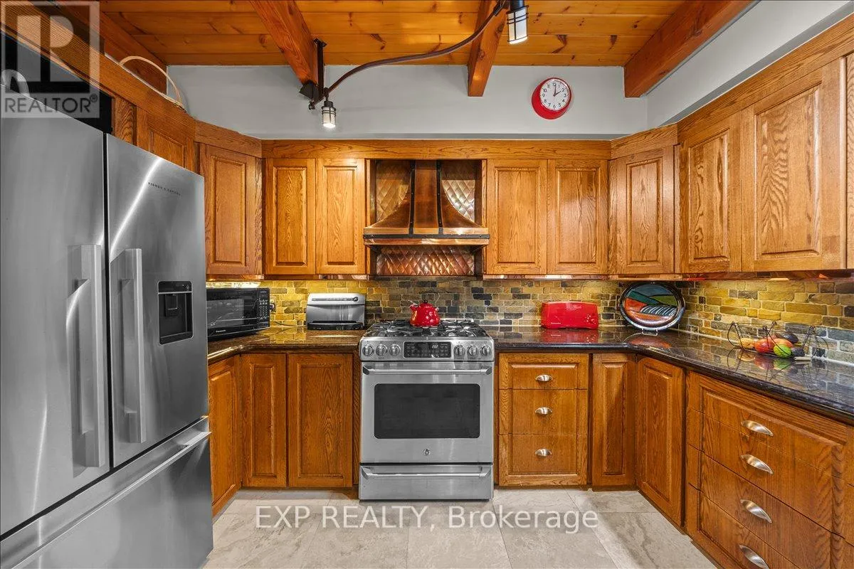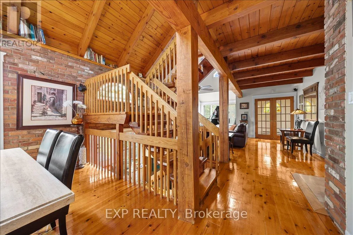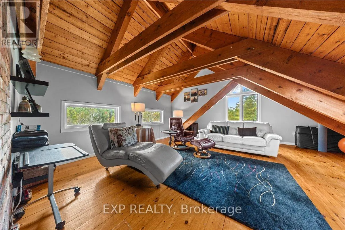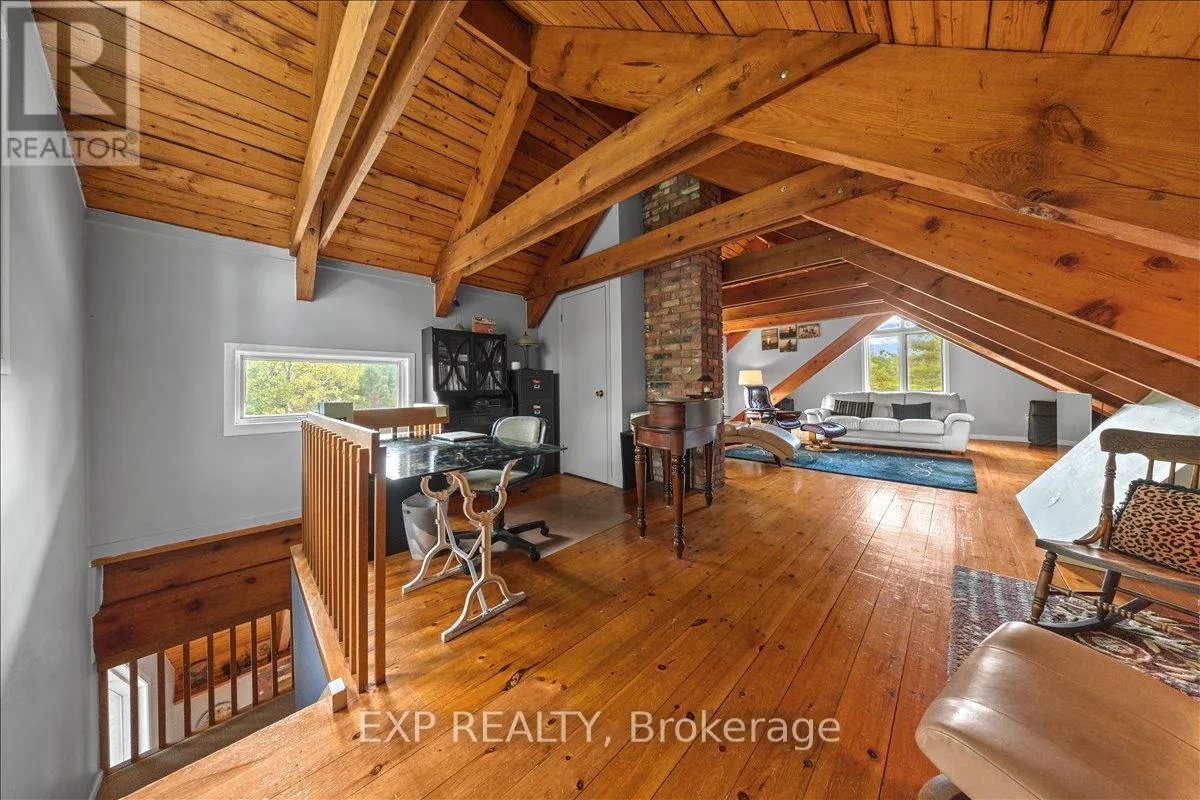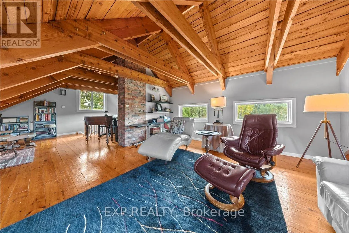 Cross Streets: Spruce Ridge Road/ Hazeldean Road. ** Directions: Just west of Stittsville off Hwy 7 turn right on Spruce Ridge Rd. Incredible opportunity to own a one-of-a-kind custom home on 25 acres of private, wooded land with vast future potential. Designed with passive solar principles, this home features a south-facing double brick wall encapsulated by a greenhouse, maximizing energy efficiency and natural light throughout the seasons. Inside, handcrafted details shine with exposed structural BC fir beams, wide plank pine flooring, and custom oak kitchen cabinetry. The kitchen is both functional and beautiful, complete with stainless steel appliances and a custom hood fan, all thoughtfully integrated into the homes warm, natural aesthetic. The multi-level layout offers spacious principal rooms, vaulted ceilings, a screened-in porch, and flexible areas ideal for family living, working from home, or entertaining. Step outside to your private backyard oasis featuring a wood-burning sauna, scenic trails, and a custom treehouse nestled in the trees perfect for relaxation or play. A large detached shop provides excellent space for a home-based business or serious hobbyist, while the attached garage adds everyday convenience. Roofing has been thoughtfully maintained with new shingles installed in 2024, and durable metal sections designed for long-term performance. Located just 5 minutes to Farm Boy, 20 minutes to Kanata, and featuring side yard frontage on Hazeldean Road, this home offers unmatched privacy with excellent proximity to amenities and significant future development potential thanks to its visibility and access. A truly rare property that combines craftsmanship, energy efficiency, and long-term opportunity. (id:27476)