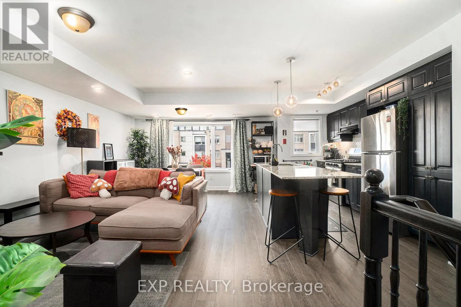 Cross Streets: Montreal Road & Codd's Road. ** Directions: Montreal Road to Codd's Road, Right on Mikinak Road. ** LUXURY 2 BED, 1.5 BATH, 1 PARKING TOWNHOME with ROOFTOP TERRACE at Rockcliffe's Wateridge Village! This Upper Unit features an open-concept living space, which includes a Spacious Kitchen w/SS Appliances, Granite Countertops, Backsplash & Large Island with Breakfast Bar overlooking combined Living & Dining Area. Tucked Away Powder Room completes Main. Upgraded Carpeted Stairs lead to the Primary Bedroom with a walk-in closet, Private Balcony, a Cheater Ensuite including an Upgraded Vanity with Granite Counters & Shower/Tub Combo. Bedroom 2 & Laundry complete level. Luxury Torlys Everwood Elite Flooring throughout Main and Upper Levels. Retreat to your HUGE rooftop terrace with gas line for BBQ, ideal for relaxing and watching sunsets and future get-togethers with family & friends! Spacious Convenient Storage Closet on Upper Level as well! Close to nature and all amenities and steps to NCC Aviation Parkway. Just minutes away from downtown, Montfort Hospital, CSE, CSIS, CMHC, Blair LRT, HWY 174 & 417, Beechwood Village & St. Laurent Shopping Centre. Includes 1 Surface Parking. (id:27476)
