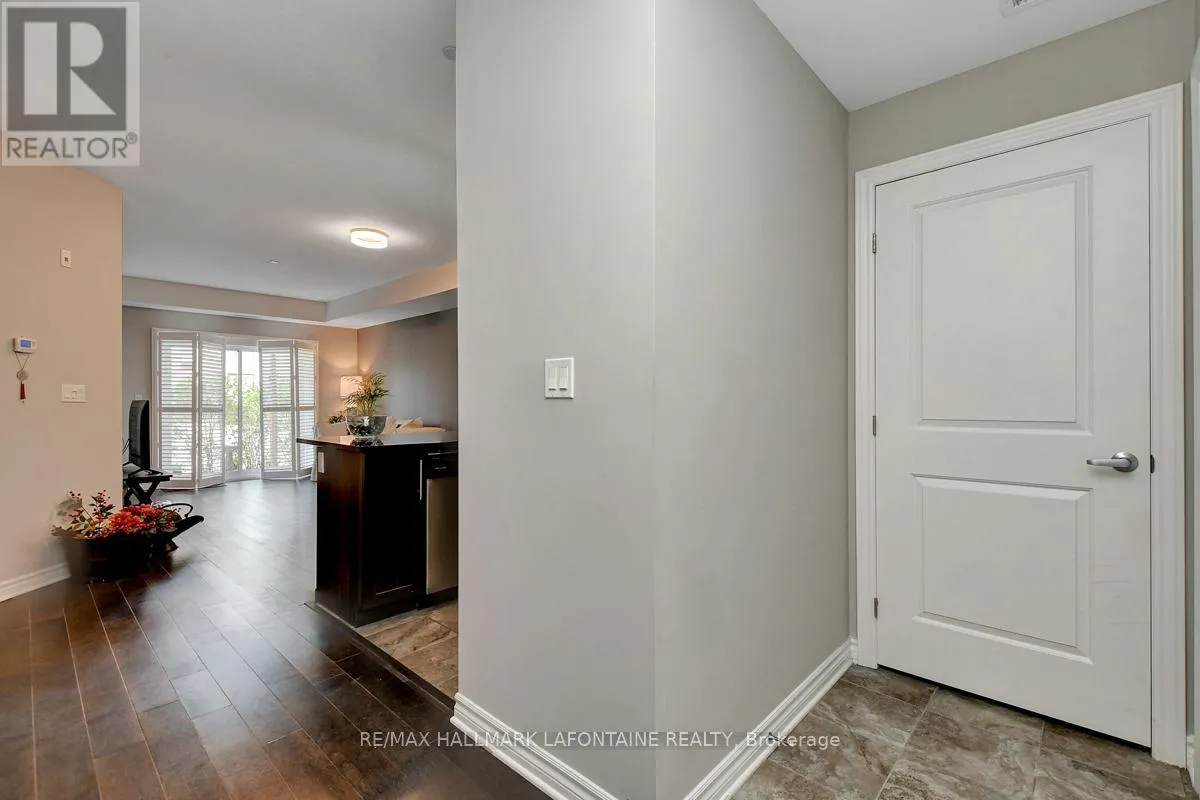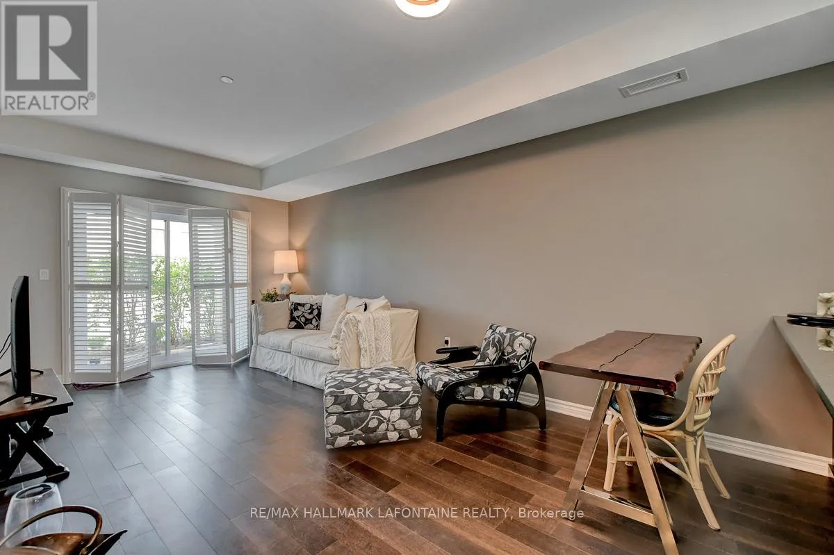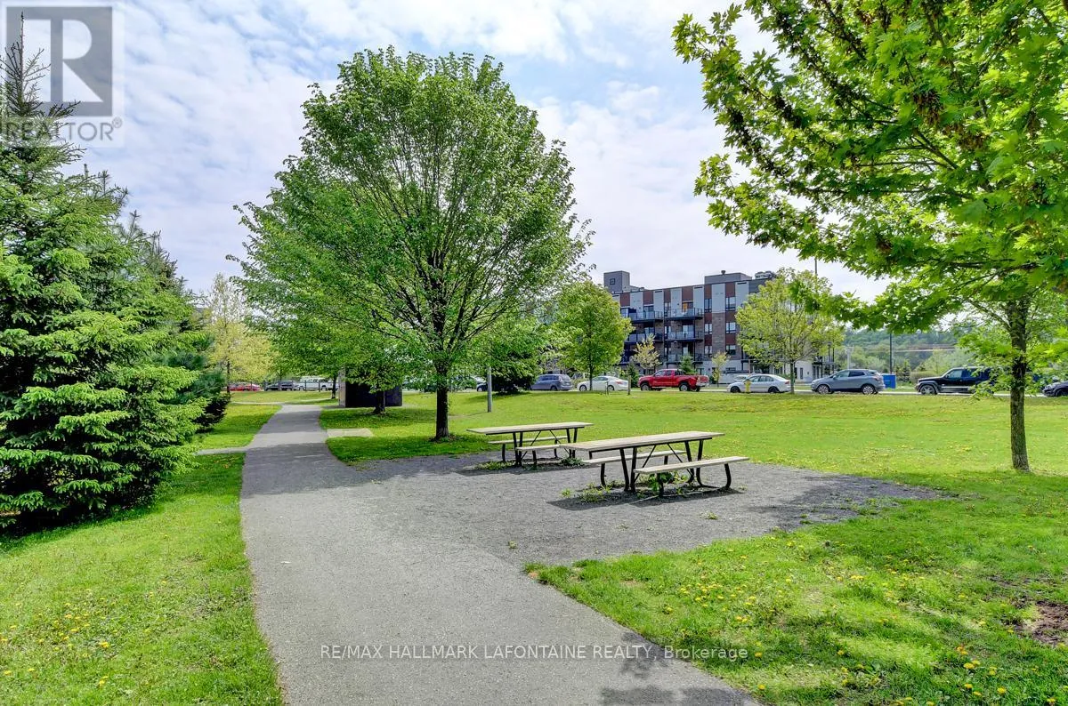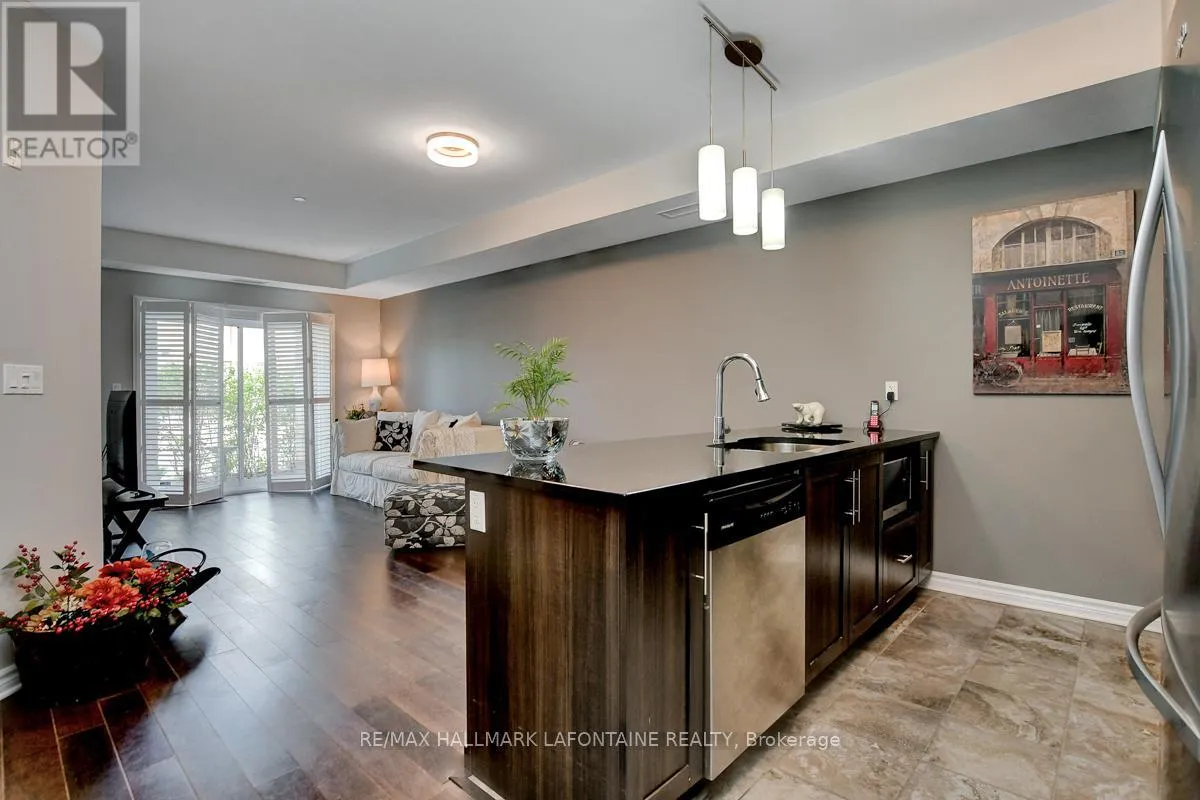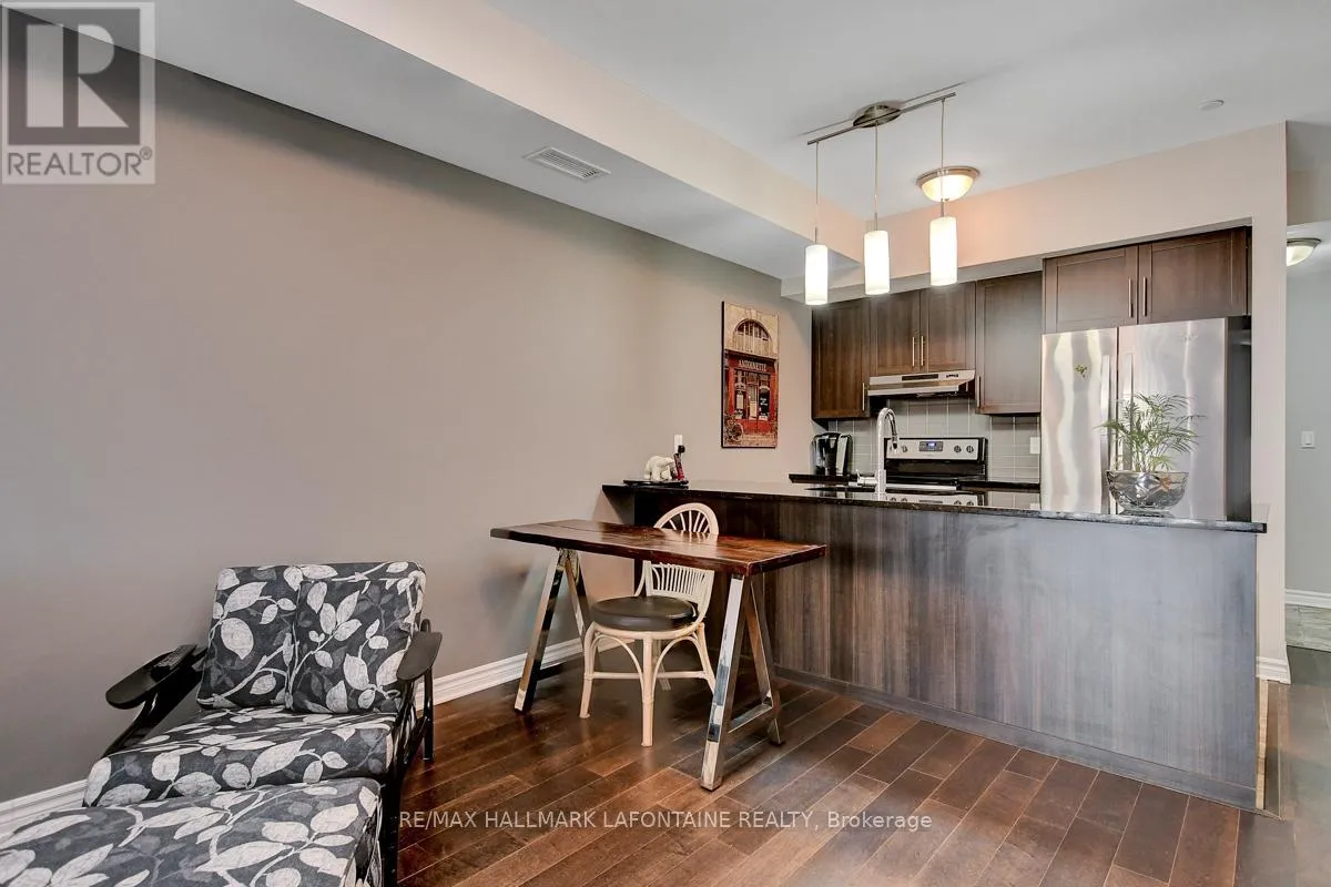 Cross Streets: Jeanne D'Arc and Prestige. ** Directions: Jeanne D'Arc to Prestige. Welcome to Petrie's Landing! This spacious and thoughtfully designed 2-bedroom condo combines modern comfort with a fantastic location. Enjoy effortless access to transportation and the beautiful Ottawa River trails just steps from your door.The bright, open-concept living and dining area features engineered hardwood flooring, California shutters, and sliding doors that lead to your private terrace - perfect for morning coffee or evening relaxation. The kitchen boasts granite countertops, a breakfast bar, stainless steel appliances, and a stylish backsplash.The generous primary bedroom includes a luxurious ensuite with a soaker tub, separate shower, granite counters, and ceramic tile flooring. A second full bathroom with matching finishes conveniently connects to the in-unit laundry room.Nestled on the quiet side of the building, this condo is surrounded by greenery and even has a small park right out front. A wonderful blend of nature, style, and convenience come see it for yourself! (id:27476)