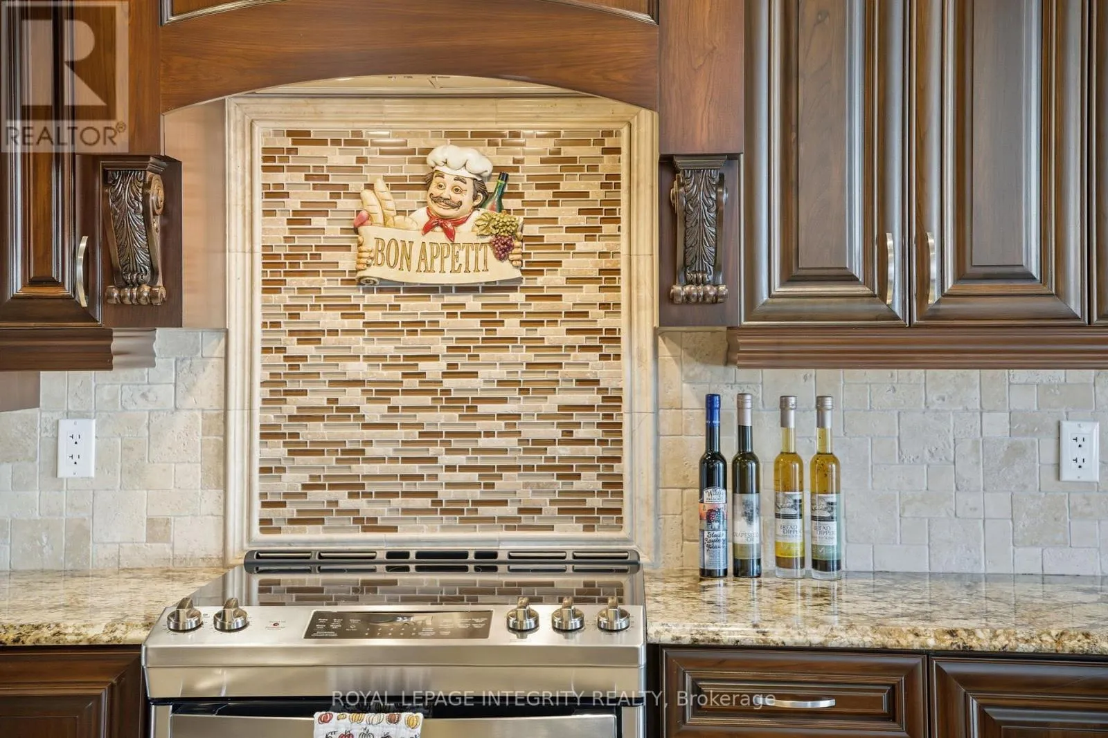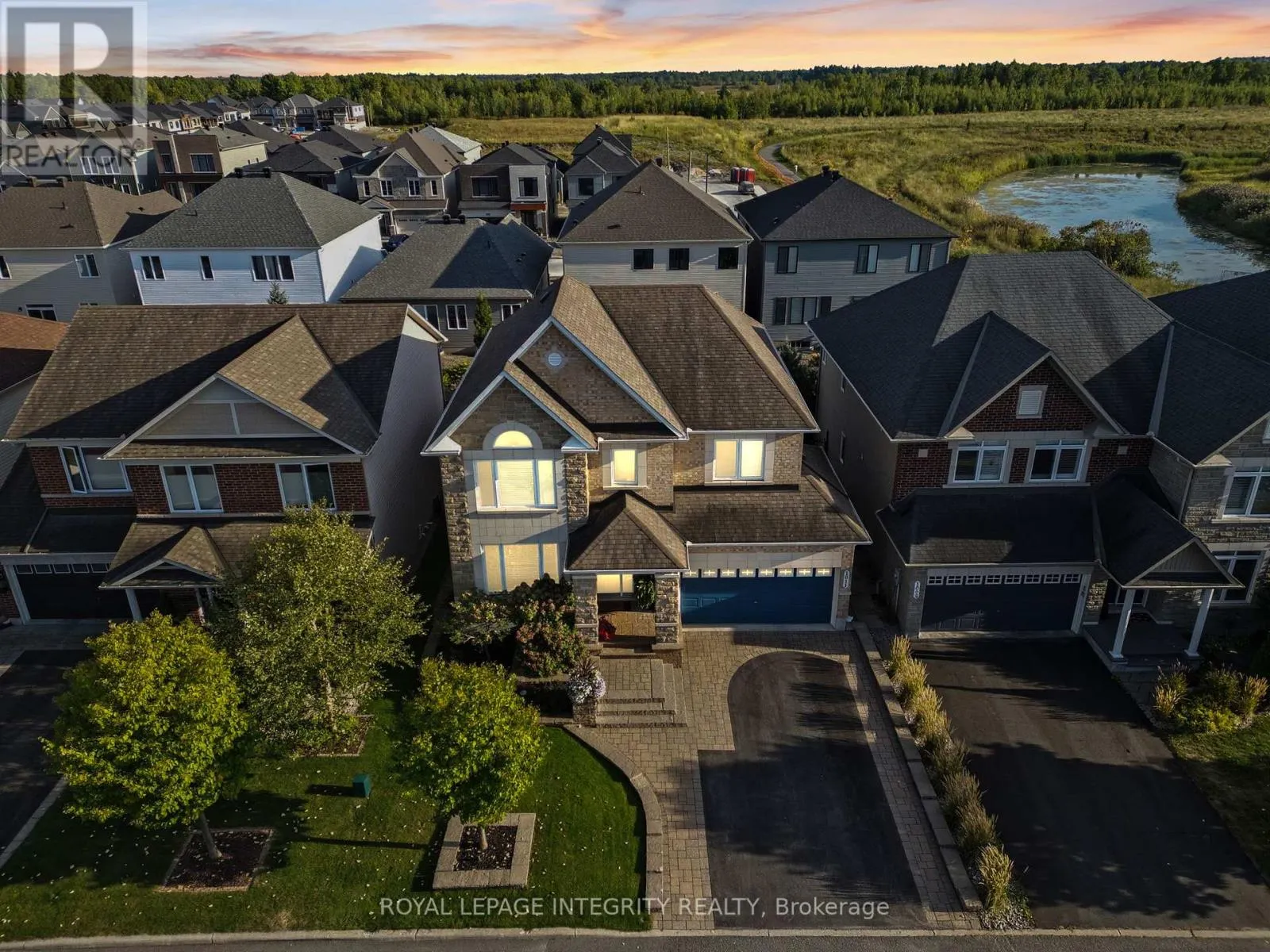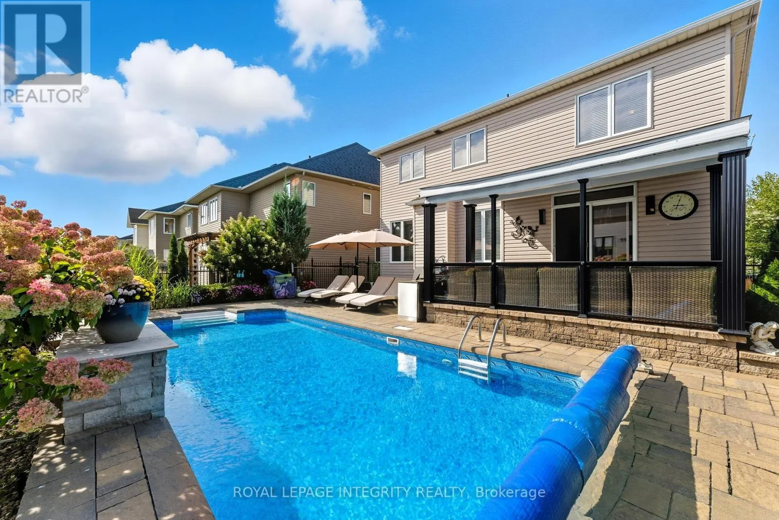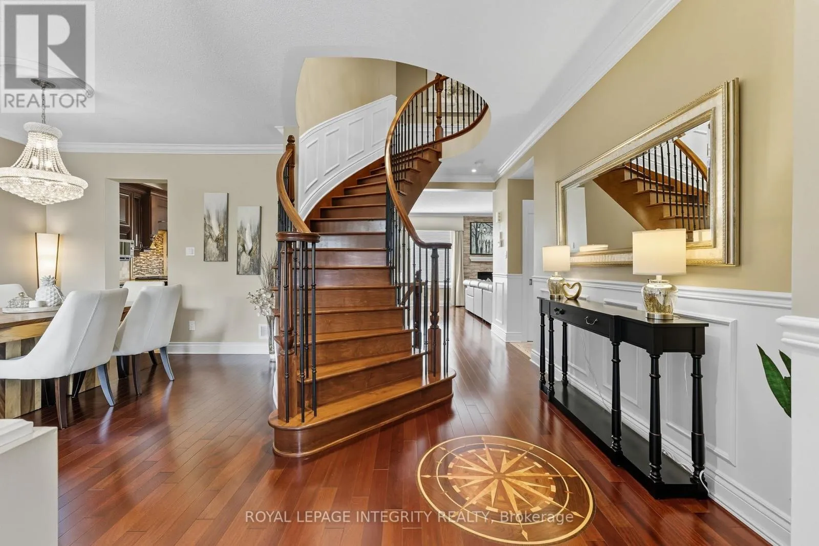 Cross Streets: Tenth Line Road and Harvest Valley Drive. ** Directions: Going South on Tenth Line Road, turn left onto Harvest Valley Ave, turn right onto Beaudelaire Dr., and turn left onto Winterspring Ridge. Exceptional 4-bedroom, 4-bath home with over $250k in upgrades offers over 2,900 sq ft of thoughtfully designed living space, combining elegance, comfort, and sophisticated craftsmanship at every turn. Beautiful front landscaping sets the stage from the moment you arrive, leading to an interior with a spiral staircase crowned by a crystal chandelier. 9 ft ceilings, rich Brazilian cherry hardwood floors, granite surfaces, custom millwork including wainscoting and crown moulding, and a built-in sound system create an atmosphere of elevated living, complemented by abundant potlights throughout. The family room, anchored by a gas fireplace with cultured stone surround, flows seamlessly into the kitchen, featuring a coffered ceiling, large granite island, and solid wood cabinetry - a perfect space for entertaining or daily family life. The primary bedroom is a private retreat, offering a walk-in closet and a spa-inspired 5-piece ensuite with a glass shower, soaker tub, and double sinks. Three additional bedrooms are spacious and bright, while the upper-level laundry with cabinetry adds convenience. The fully finished lower level with 9-foot ceilings unveils a grand entertaining haven, showcasing a custom granite and cultured stone bar, private gym, full bathroom with a large glass shower, workshop area, and extensive storage. Step outside to a sun-filled, resort-style backyard. A heated saltwater pool sits at the heart of the space, framed by custom interlocking stonework, with an expansive pavilion-style covered patio providing the perfect setting for summer gatherings. Southern exposure and lush landscaping envelop the property in warmth and serenity, creating a luxurious private oasis. Additional features include an irrigation system and celebright soffit lighting, showcasing the care and attention to detail evident throughout this remarkable property. Located steps from scenic walking trails surrounding a large pond. 24hr irrevocable on all offers. (id:27476)