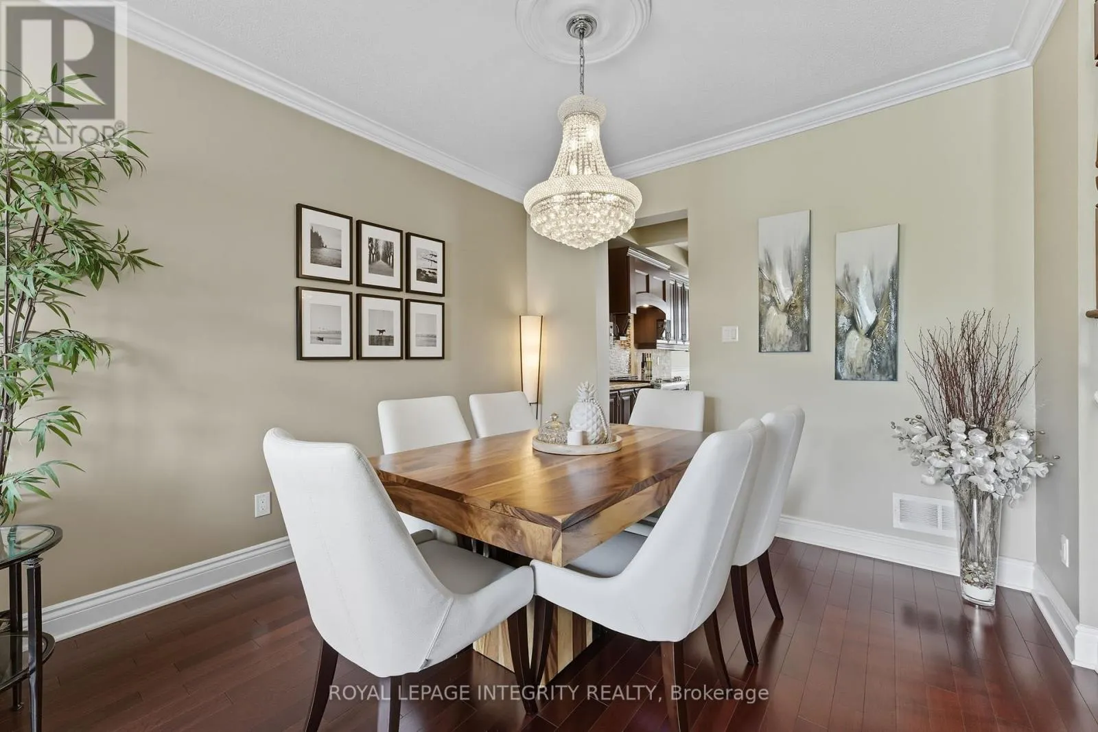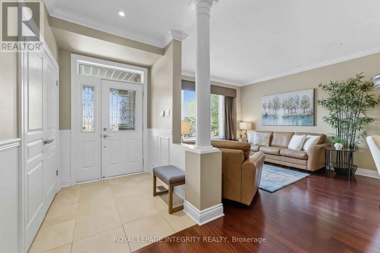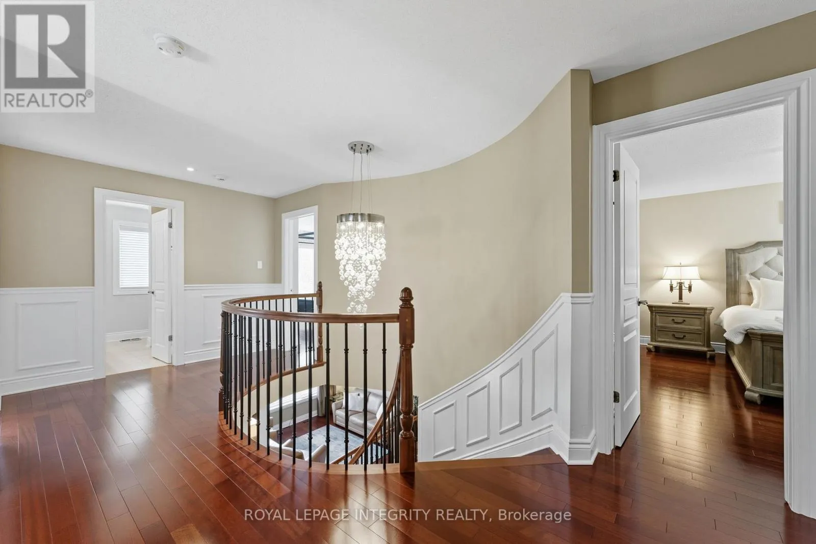 Cross Streets: Tenth Line Road and Harvest Valley Drive. ** Directions: Going South on Tenth Line Road, turn left onto Harvest Valley Ave, turn right onto Beaudelaire Dr., and turn left onto Winterspring Ridge. Exceptional 4-bedroom, 4-bath home with over $250k in upgrades offers over 2,900 sq ft of thoughtfully designed living space, combining elegance, comfort, and sophisticated craftsmanship at every turn. Beautiful front landscaping sets the stage from the moment you arrive, leading to an interior with a spiral staircase crowned by a crystal chandelier. 9 ft ceilings, rich Brazilian cherry hardwood floors, granite surfaces, custom millwork including wainscoting and crown moulding, and a built-in sound system create an atmosphere of elevated living, complemented by abundant potlights throughout. The family room, anchored by a gas fireplace with cultured stone surround, flows seamlessly into the kitchen, featuring a coffered ceiling, large granite island, and solid wood cabinetry - a perfect space for entertaining or daily family life. The primary bedroom is a private retreat, offering a walk-in closet and a spa-inspired 5-piece ensuite with a glass shower, soaker tub, and double sinks. Three additional bedrooms are spacious and bright, while the upper-level laundry with cabinetry adds convenience. The fully finished lower level with 9-foot ceilings unveils a grand entertaining haven, showcasing a custom granite and cultured stone bar, private gym, full bathroom with a large glass shower, workshop area, and extensive storage. Step outside to a sun-filled, resort-style backyard. A heated saltwater pool sits at the heart of the space, framed by custom interlocking stonework, with an expansive pavilion-style covered patio providing the perfect setting for summer gatherings. Southern exposure and lush landscaping envelop the property in warmth and serenity, creating a luxurious private oasis. Additional features include an irrigation system and celebright soffit lighting, showcasing the care and attention to detail evident throughout this remarkable property. Located steps from scenic walking trails surrounding a large pond. 24hr irrevocable on all offers. (id:27476)