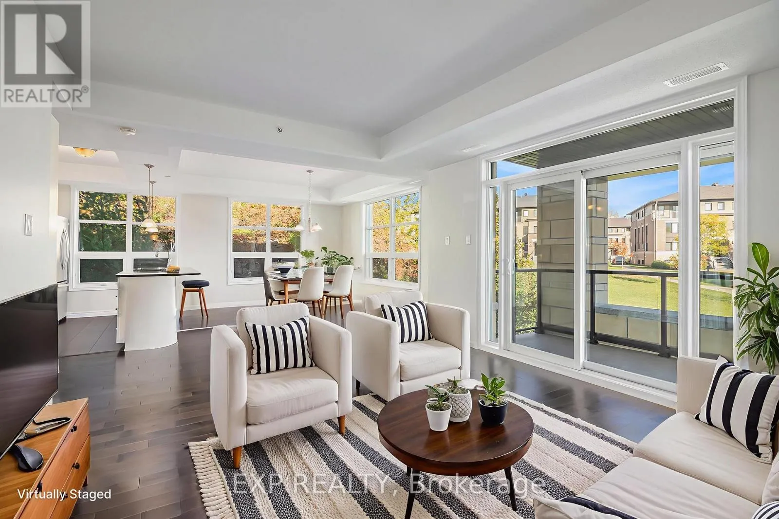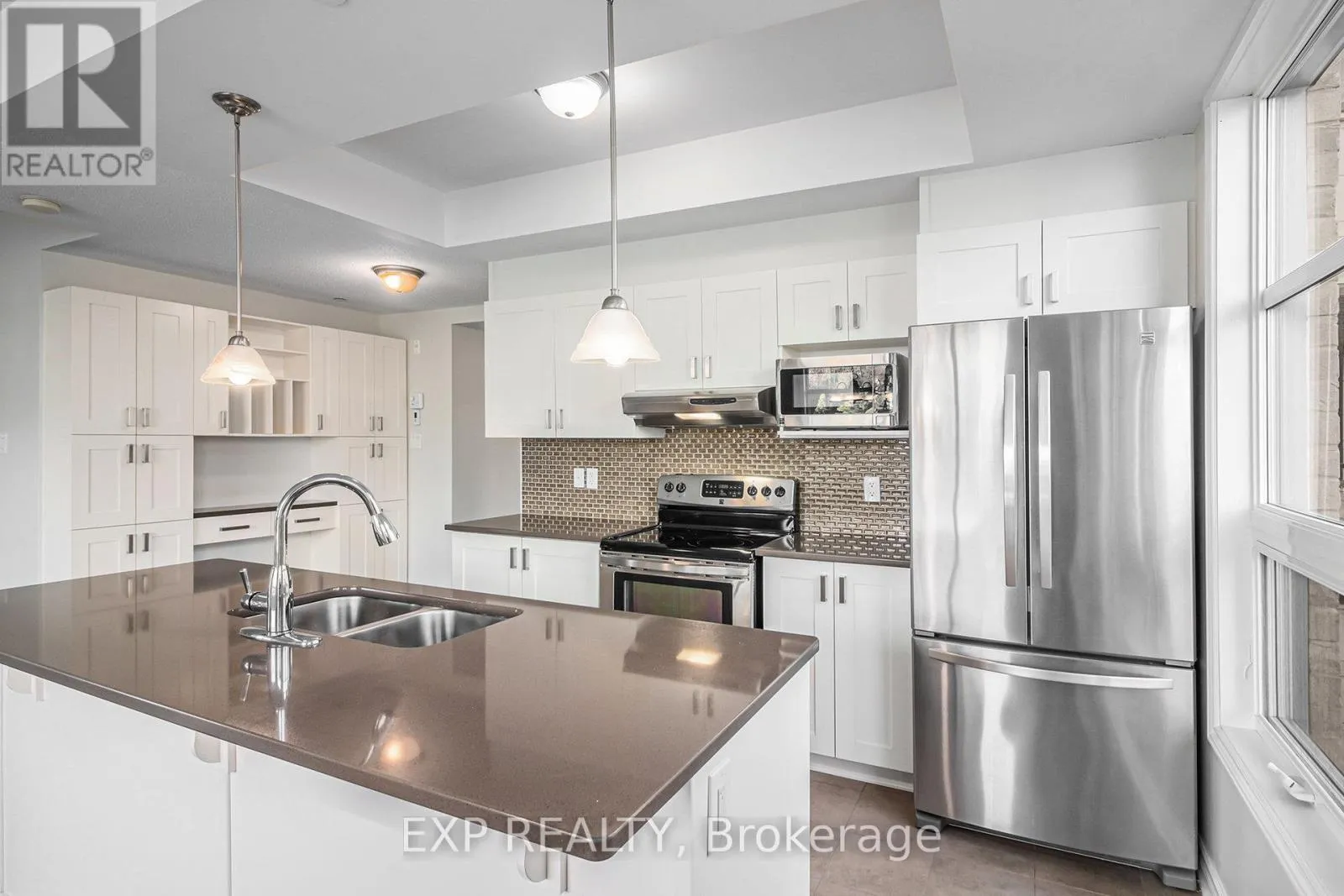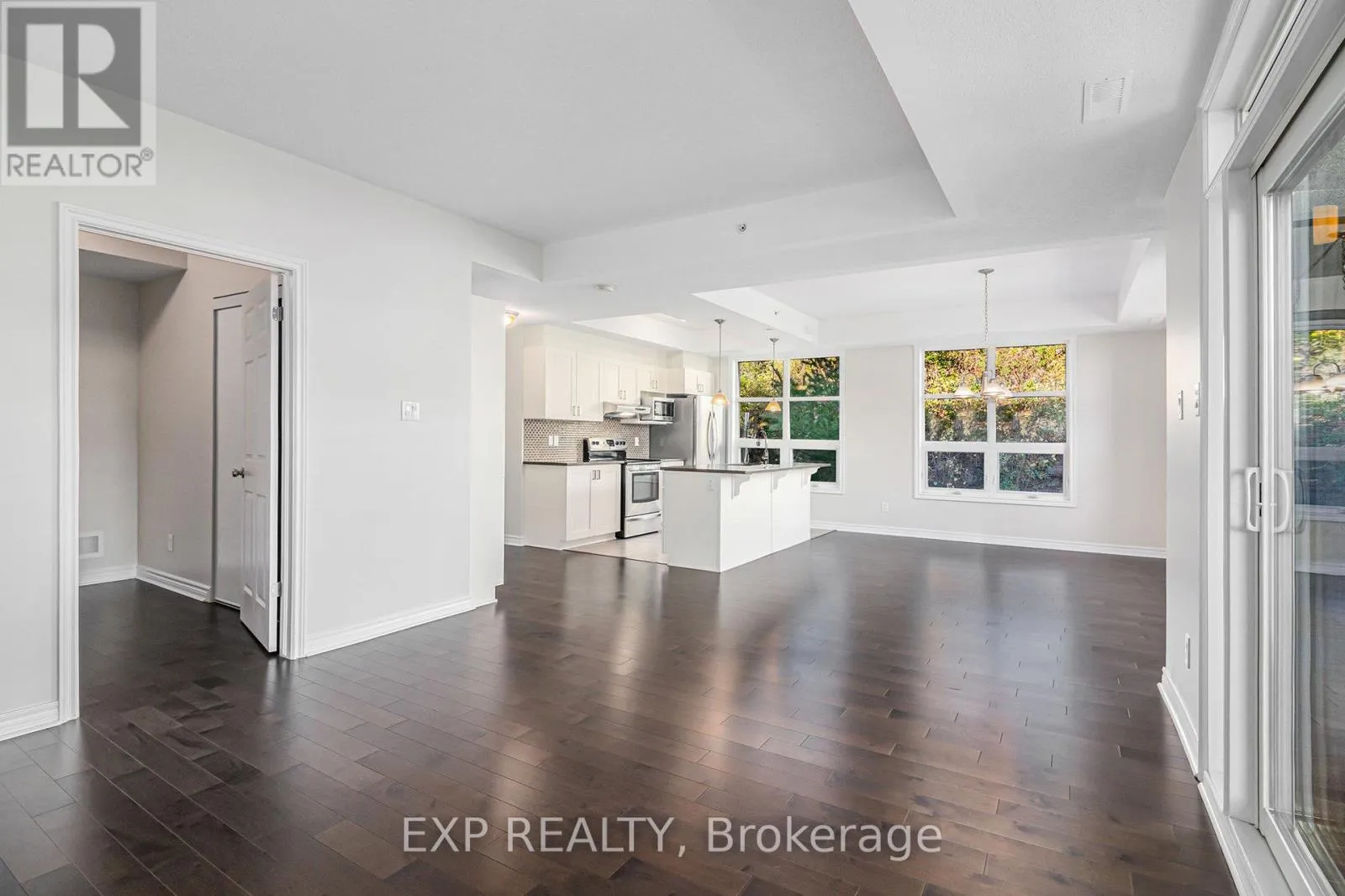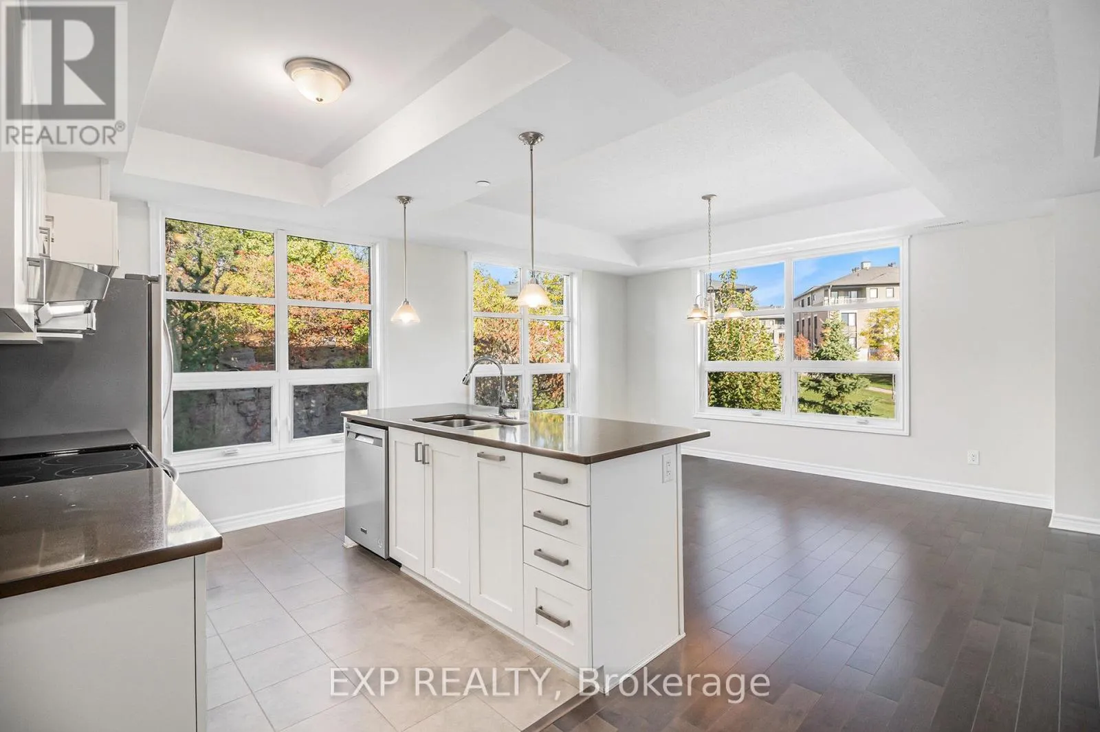 Cross Streets: Titanium/Montblanc. ** Directions: Jeanne D'Arc to Bilberry to Titanium to Montblanc. Experience premium single-level living in sought-after Quarry Glen! This turnkey 2 bedroom + den, 2 bath condo (with 2 parking spots!) combines style, comfort, and convenience in an unbeatable location and view - just a 3-minute drive to the O-Train station and offering quick access to Highway 174. The open-concept layout features a bright, welcoming living area that extends to a covered private balcony, perfect for relaxing outdoors. The kitchen boasts quartz countertops, backsplash, ample cabinetry, stainless steel appliances and an island with breakfast bar - ideal for both everyday living and entertaining. The spacious primary bedroom includes a walk-in closet and a 3 pc ensuite. A second bedroom and a versatile den provide flexible space for guests or a home office, complemented by a 4pc bathroom. Additional highlights include in-suite laundry, two parking spaces (1 in shared garage and 1 surfaced) and hardwood and ceramic flooring throughout - no carpet! Added bonus of an exclusive storage space in shared garage. Located in a building with elevator access, this condo offers easy maintenance free living. Enjoy nearby walking and cycling trails, parks, and all major amenities - Place d'Orléans Mall, Shenkman Arts Centre, restaurants, transit and more. Immediate occupancy available - move in and enjoy urban convenience! (id:27476)