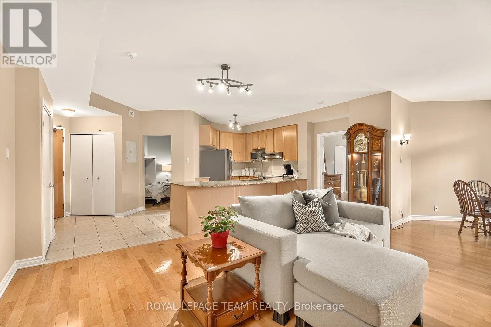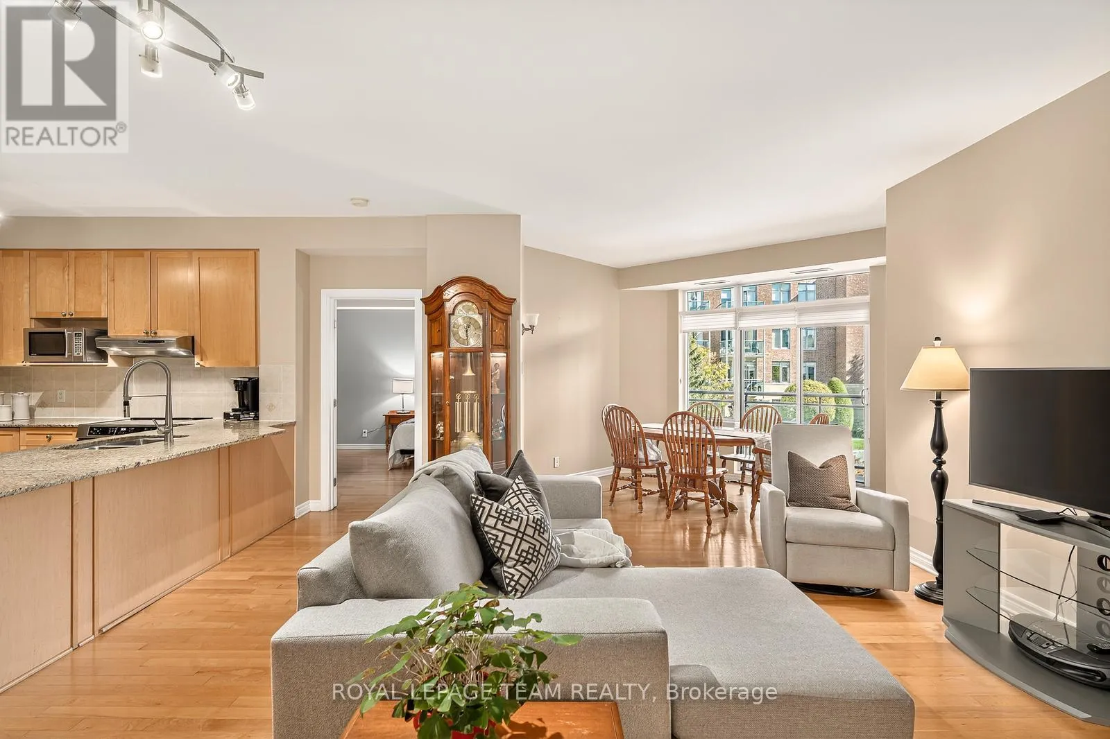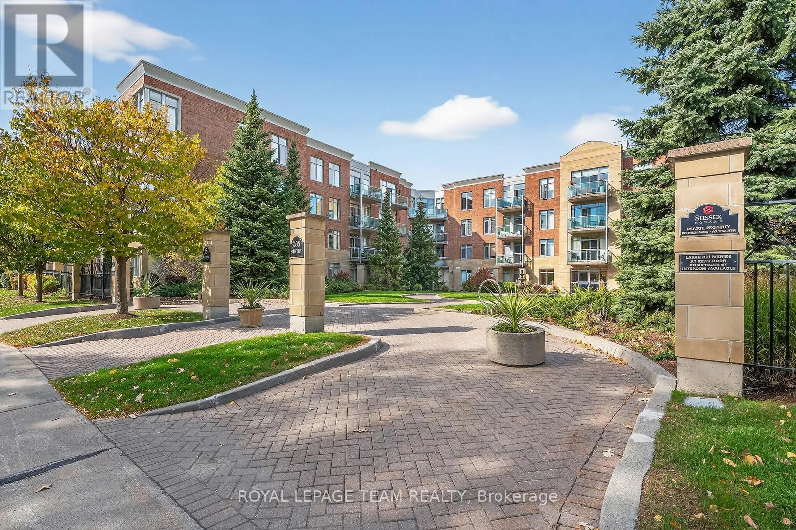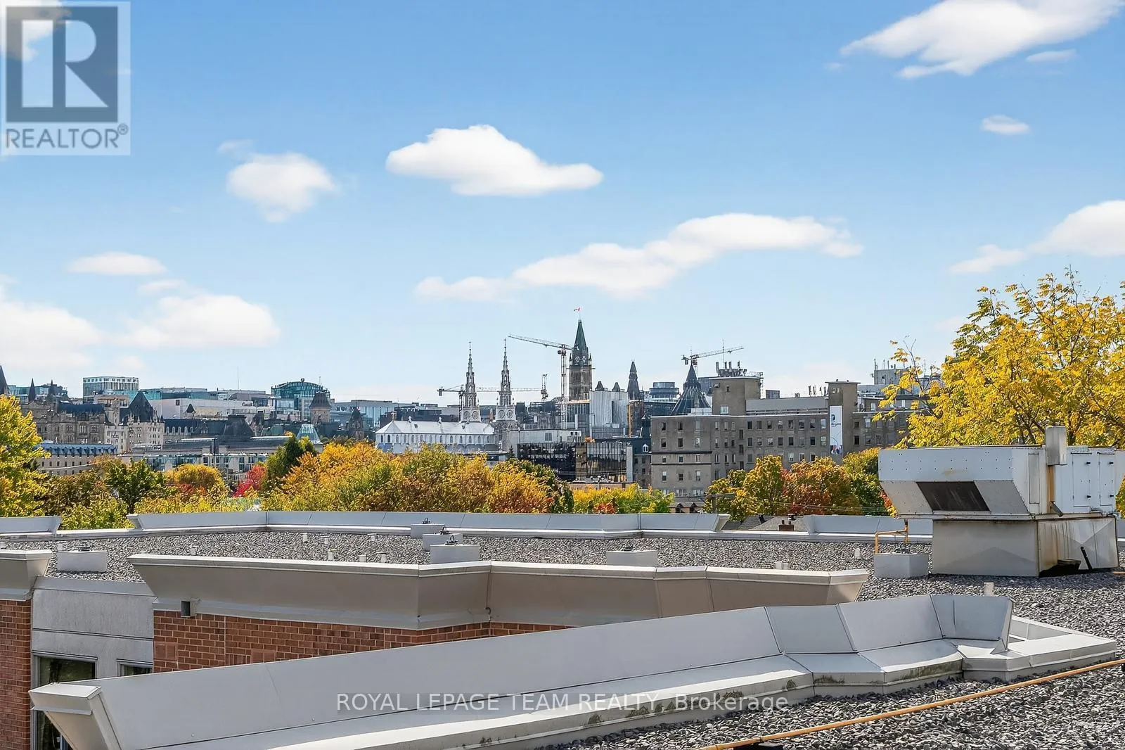 Dalhousie Street to Bolton Street The ideal location: blissful Lowertown energy, near the ByWard Market and Rideau River trails. Sussex Square blends downtown energy with quiet elegance. This two-bedroom, two bath plus den condo overlooks a landscaped courtyard with a central fountain, creating a private, European-style retreat. A tiled foyer leads to a versatile den and an open living/dining space with warm hardwood floors. The granite kitchen offers a large L-shaped island, roll-out cabinetry, and a new induction range. Sunlight pours into the dining nook and onto one of the buildings largest private terraces perfect for al-fresco meals or container gardening. The primary suite features an immense walk-in closet and a spa-inspired ensuite with slate-tiled accessible shower, while the immense second bedroom sits beside a full bath. In-unit laundry adds convenience. Residents enjoy a fully equipped gym, spacious party room, a common rooftop patio with BBQ area with stunning panoramic views of the city and Gatineau. Includes a storage locker, and secure underground parking. Truly, urban living with comfort and style. (id:27476)