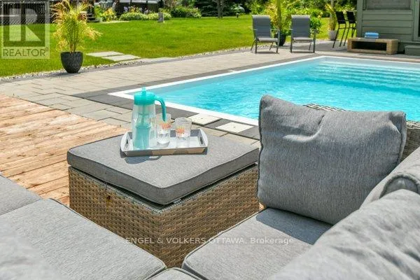 Cross Streets: West on Highway 417 to March Road. South on March Rd toward Almonte. Left on Bearhill Rd then Rt on Delaney. ** Directions: West on Highway 417 to March Road. South on March Rd toward Almonte. Left on Bearhill Rd then Rt on Delaney. A handsome all brick bungalow on a prime lot with brilliant sun exposure and almost 500 feet of frontage awaits. Less than 10 minutes away from the charming community of Almonte which is steeped in history and interesting locale fare, restaurants , golf and a local hospital. The vaulted beamed main family room is anchored with a high end gas fireplace and overlooks the gardens and pool area beyond. The living room/den served as a 4th bedroom or home office in the past and is flooded with sunlight throughout the day. Gleaming hardwood floors throughout the interior create a sense of warmth and the scale of every room is generous and unique for the time the home was built. Bay windows in the breakfast area over looking the pool and patio doors onto a private deck off the Primary Suite are thoughtful luxuries in the original design. A main level laundry off the kitchen is well positioned. Baths have been updated. The lower level boasts an expansive home base for watching sports or movies and warmed by a handsome high end gas fireplace. A built in bar, games area and additional space for a bedroom or office is well laid out and the unfinished space offers storage and workshop potential. The home is equipped with a newer well, pressure tank, - all updated in 2021. Septic was pumped June 2025; inspection in spring 2025 indicates several more years of life with proper maintenance. Roof and mechanicals updated in 2018, interlock landscaping in 2017, granite counters and backsplash in 2020, ensuite and hardwood floors in 2019. Interior repainted in 2025. Upgraded main bath in Spring 2025, and new Windows mid Nov 2025. (id:27476)