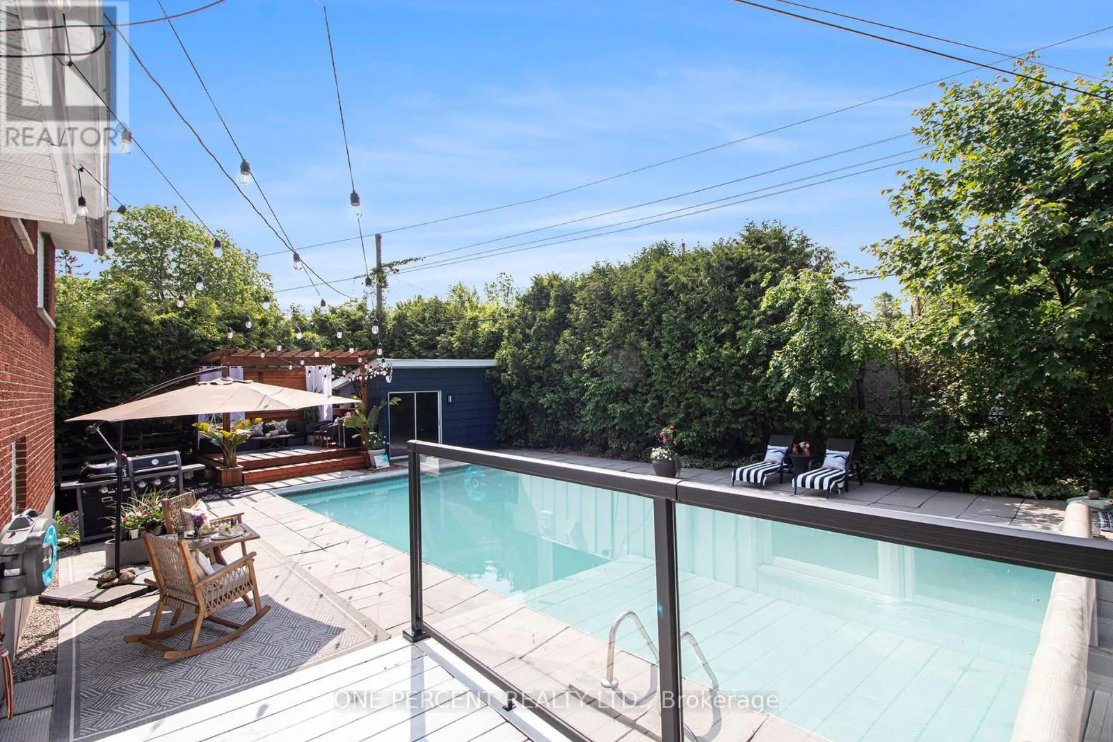 Cross Streets: McCarthy Road and Walkley Road. ** Directions: Walkley Road to Wexford Way, Right onto Harkness Avenue. Step into a lifestyle where every day feels like a getaway. This designer-renovated 3+1 bedroom home blends privacy, natural light, and modern comfort on a quiet, no-through street in Riverside Park. Set on an oversized, south-facing lot, the property enjoys over 10 hours of sunlight daily. Behind soaring cedar hedges lies your own backyard paradise featuring a sparkling pool, glass railings (2024), a custom cedar cabana (2021), and multiple outdoor zones for lounging, dining, and entertaining.Inside, the home has been completely reimagined by a renowned local designer. The welcoming foyer (2020) opens to a spacious living room with a wood-burning fireplace. The kitchen offers a gas range, Bosch dishwasher, stainless steel appliances, and floor-to-ceiling sliders framing peaceful backyard views. Step out directly to the deck and pool for seamless indoor-outdoor living. Recent updates include a rejuvenated primary suite (2024), custom built-ins and closets (2024), main-floor bedroom (2023), renovated laundry (2024), and a spa-inspired main bathroom (2025). Fresh interior paint (2025), a glass-railed front porch (2025), and a custom front fence (2020) enhance curb appeal. The lower level offers a flexible layout with an additional bedroom, full bathroom, and generous storage-ideal for guests, teens, or a home office. Key updates: windows (2015), 30-year shingles (2017), furnace (2013).Enjoy the best of city living without the bustle. Riverside Park is known for its park-centric design, no cut-through traffic, and quiet streets-steps to schools, Walkley LRT, and easy access downtown via Bronson or out of the city in any direction. A must see! (id:27476)