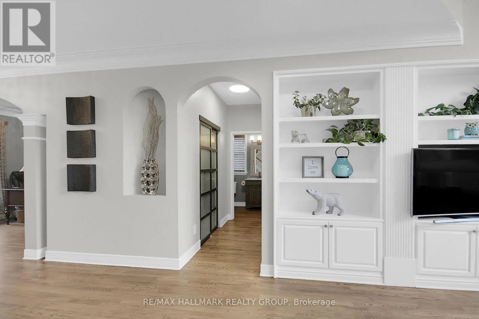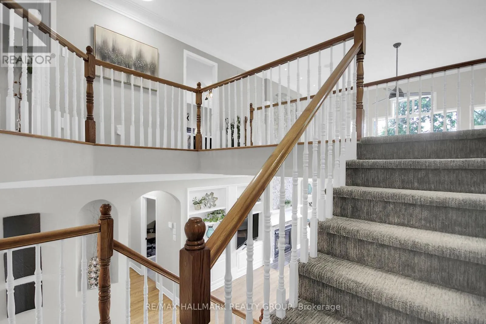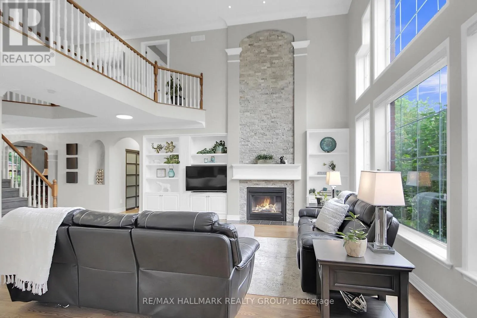 Cross Streets: Brae Cres. and Cypress Gardens. ** Directions: Stittsville Main to Brae Cres to Beechgrove Gdn. Welcome to 13 Beechgrove Gardens, an elegant all-brick home set on a rare, expansive, and private lot in one of Stittsville's most coveted neighbourhoods. Surrounded by lush landscaping, this impressive home offers a tranquil pond, mature greenery, a 9-zone irrigation system, and a three-season built-in room-all complemented by a three-car garage and beautifully interlocked driveway, walkway, and front porch.Step inside to a grand foyer that introduces a breathtaking open-to-above living room with 20-foot ceilings, walls of windows, and a striking fireplace. The main level also features a private office, powder room, and a welcoming family room with a second fireplace. A formal dining room with a butler's pantry seamlessly connects to the gourmet kitchen, complete with a walk-in pantry, bright eating area, and convenient mudroom/laundry with a secondary staircase leading to the soundproof family room above the garage. The sun-filled three-season room with a hot tub provides the perfect spot to unwind while enjoying views of the beautifully manicured backyard.Upstairs, discover four spacious bedrooms, including a luxurious primary retreat featuring a private balcony, a two-sided fireplace shared with the spa-inspired ensuite, and a generous walk-in closet. Bedroom two offers its own ensuite, while bedrooms three and four share a stylish Jack-and-Jill bath.The finished lower level is ideal for both entertaining and relaxation, showcasing oversized windows, an expansive recreation area, a fifth bedroom currently used as a games room, and ample storage space.This remarkable property offers the perfect blend of luxury, comfort, and functionality-a truly rare opportunity to own a one-of-a-kind home in a prime Stittsville location, ideal for family living and entertaining.FURNACES AND AC'S UPDATE SEPT 2025 (id:27476)