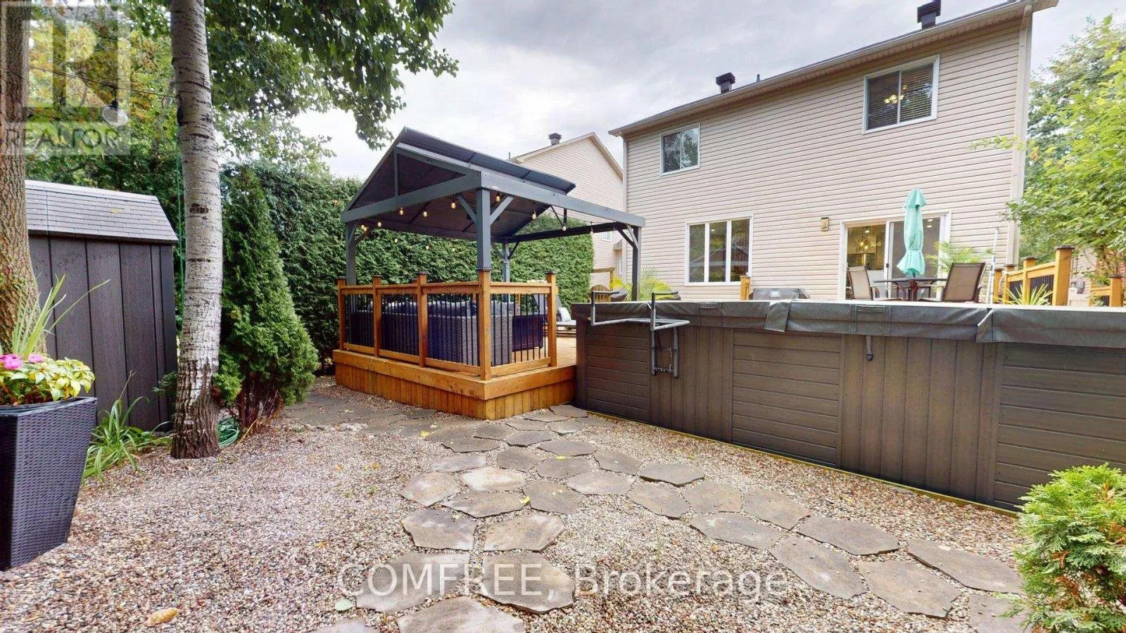 Cross Streets: Carp Rd & Kittiwake Dr. ** Directions: Kittiwake Dr to Sirocco Crescent. Beautifully renovated 2-storey home offering 2700 sq. ft. of living space, featuring 3+2 bedrooms and 4 bathrooms. Extensive renovations completed in 2021 showcase high-end, modern finishes throughout. The bright and inviting main floor is filled with natural light from large windows overlooking a landscaped backyard and spacious deck (2020). The kitchen boasts a quartz countertop, ample cabinetry, and contemporary fixtures, while the adjacent dining area and generous den provide flexibility for work or leisure. Upstairs, the primary bedroom impresses with a vaulted ceiling, a luxurious ensuite with a double-sink vanity, a large glass-enclosed shower, and a walk-in closet. Two additional bedrooms, sitting/flex area and a full bathroom complete the upper level. The fully finished basement offers a large family room, two additional bedrooms, and a full bathroom ideal for guests, extended family, or recreational use. The insulated and heated double garage adds year-round convenience. Recent updates include roof (2019), main bathroom (2025), and heat pump (2024). Situated on a quiet crescent with no rear neighbours, this property provides a private, treed low maintenance backyard oasis including a raised garden bed area, with a huge deck great for entertaining with room for sitting/lounging and a swim spa area next to the spacious gazebo, while being close to parks, public transit, and shopping. (id:27476)