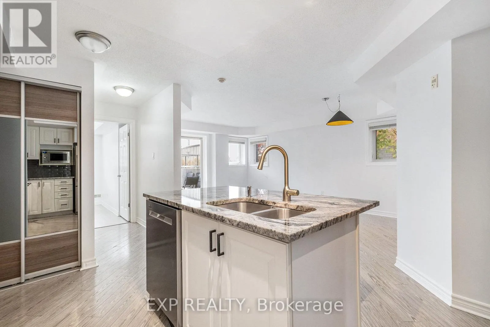 Cross Streets: Barnstone dr & Stonefield Pvt. ** Directions: Barnstone Drive turn into parking lot. Discover the perfect blend of comfort and convenience in this bright end-unit lower-level condo featuring 2 spacious bedrooms, a versatile den, and 2 bathrooms. Step inside to an open-concept layout with a modern kitchen showcasing upgraded cabinetry, a sleek backsplash, granite countertops, and a central island with double sink - ideal for cooking or entertaining. The living and dining area offers warm laminate flooring and access to a covered patio where your BBQ is ready to fire up year-round. Both bedrooms feature wall-to-wall closets providing plenty of storage, while the den makes a perfect home office or creative space. Enjoy a large 4-piece bath with a deep soaker tub and shower combo, plus a convenient powder room and in-unit laundry. Located steps from Fresco, Tim Hortons, shops, parks, and the Rideau River, and just minutes to the Vimy Memorial Bridge for quick access around the city - this condo offers the lifestyle and location you've been waiting for! (id:27476)