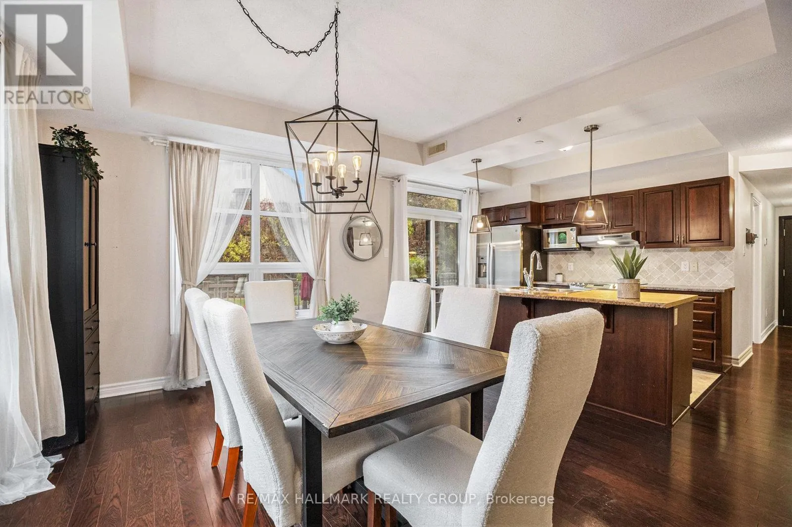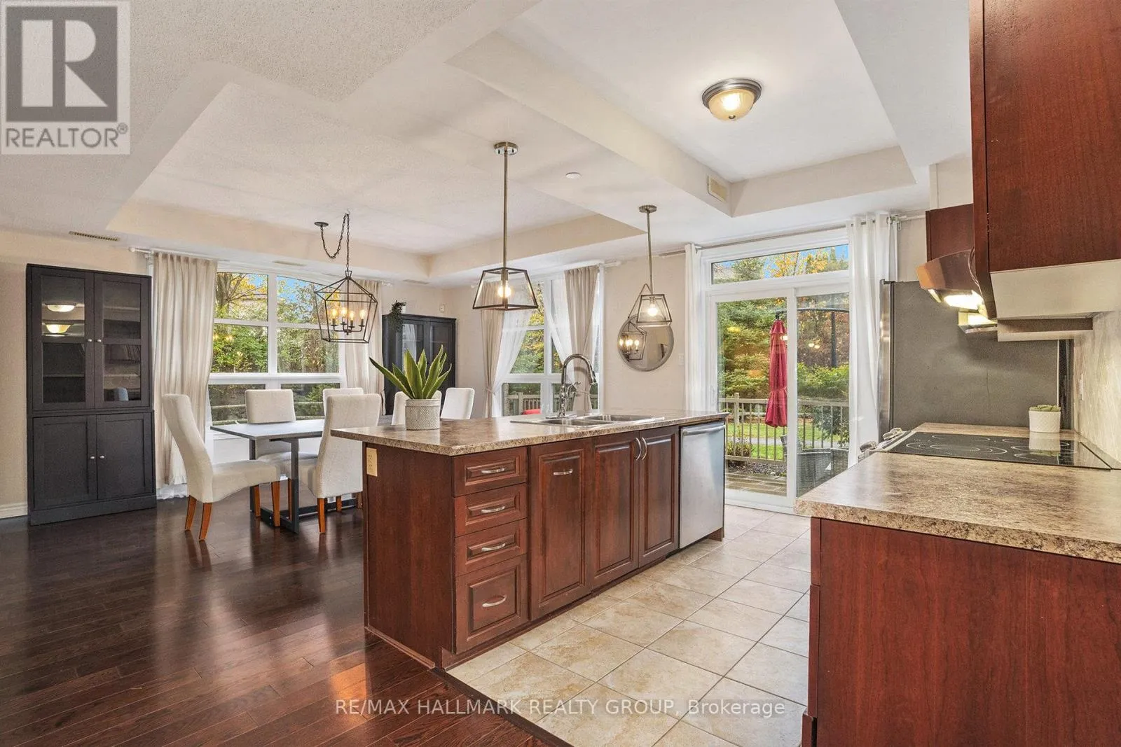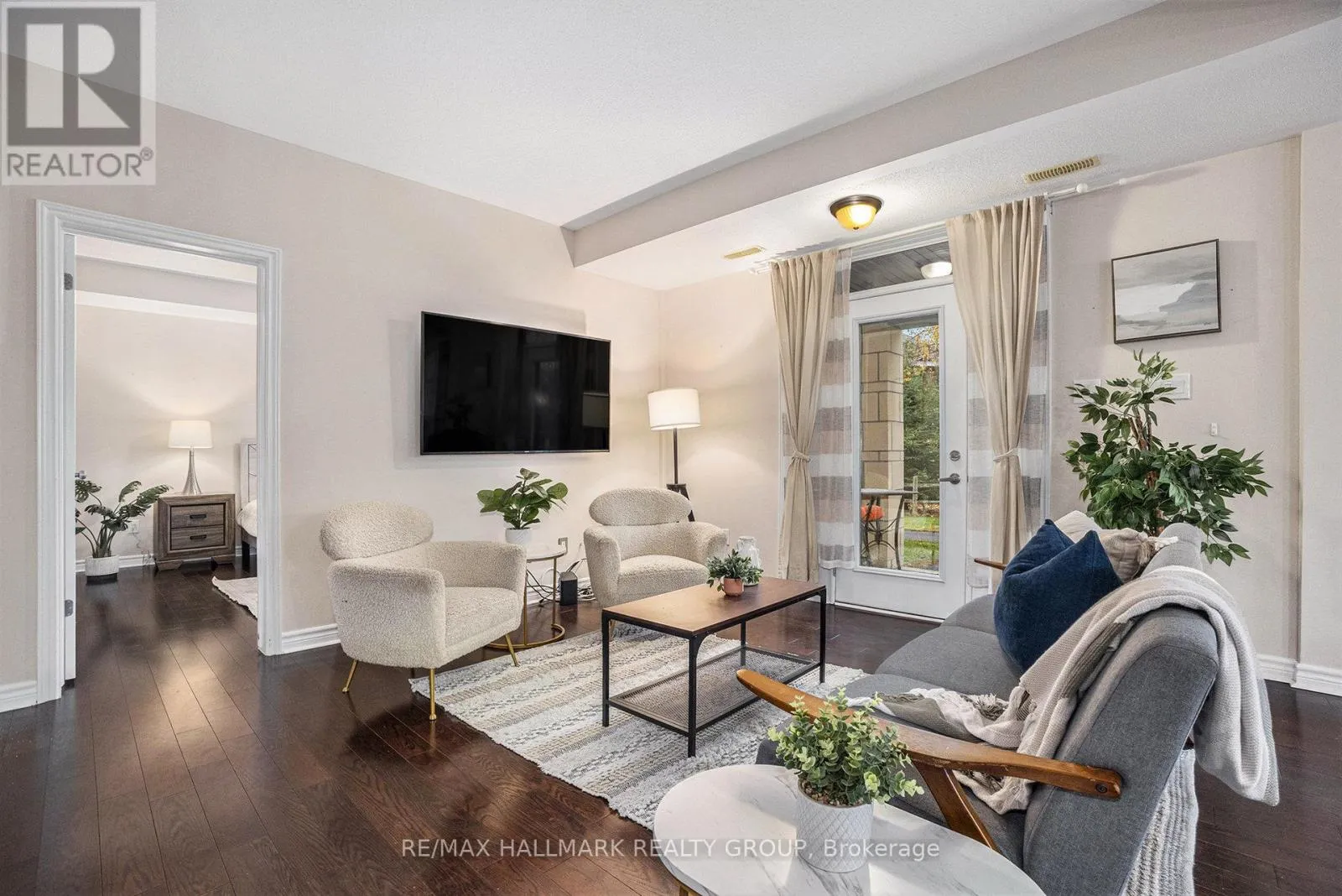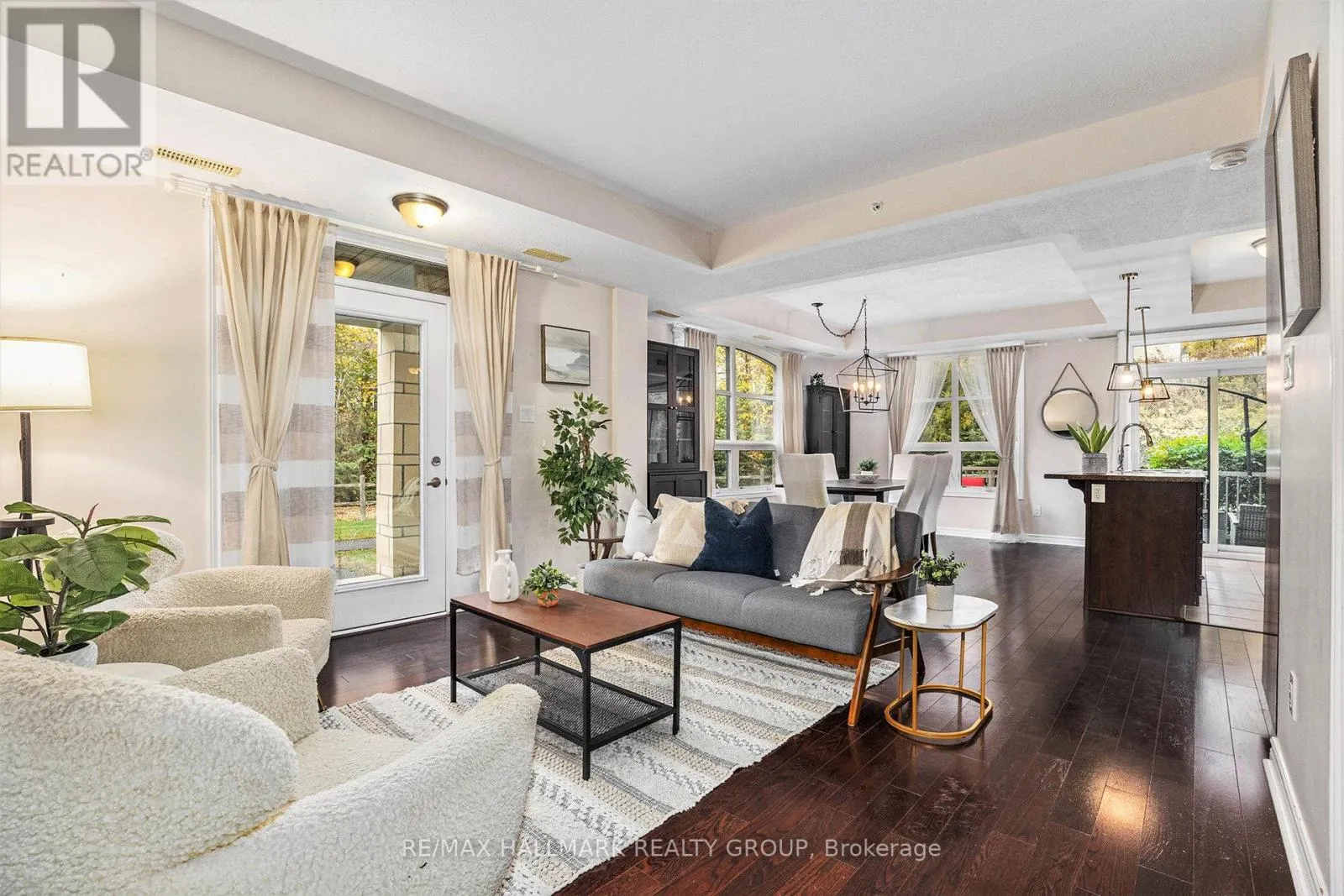 Cross Streets: Bilberry/Titanium. ** Directions: HWY 174, exit Place D'Orleans to Champlain to Jeanne d'arc North, left Bilberry Drive, Right Titanium Drive, left Montblanc Private, Building #120. Gorgeous 2 bedroom plus den, ground level corner unit. Located in the exclusive adult oriented community of Quarry Ridge in Orleans, surrounded by paths and nature. If you are looking to downsize or simply get all your living onto one level without sacrificing space, this unit will impress as it offers approx.1326sqft of living space with 2 spacious patios surrounded by beautiful landscaping. The interior space is thoughtfully laid out with a great open concept kitchen, living and dining area with lots of natural light sitting in the heart of the home. While 2 spacious bedrooms are at separate ends of the unit. There is also a den that can be utilized as a 3rd bedroom/home office/guest room. The primary room can fit even the largest of bedroom sets and has vaulted ceilings, a walk-in closet, another closet, and an ensuite bathroom with spacious walk-in shower. The secondary bedroom is also a great size and has a full bathroom located just across the hall from it. Dining area is large enough to accommodate a large dining table. The chefs kitchen has a large island and loads of cabinet and counter space. The main patio is a great size which can fit a BBQ area, outdoor living space and dining area. Inside access to your own garage and storage locker, with a secondary parking space right there as well. If you're looking for convenience, space, low maintenance, and a scenic, quiet location to call home, look no further. 24 hours irrevocable on all offers, schedule B to accompany all offers. (id:27476)