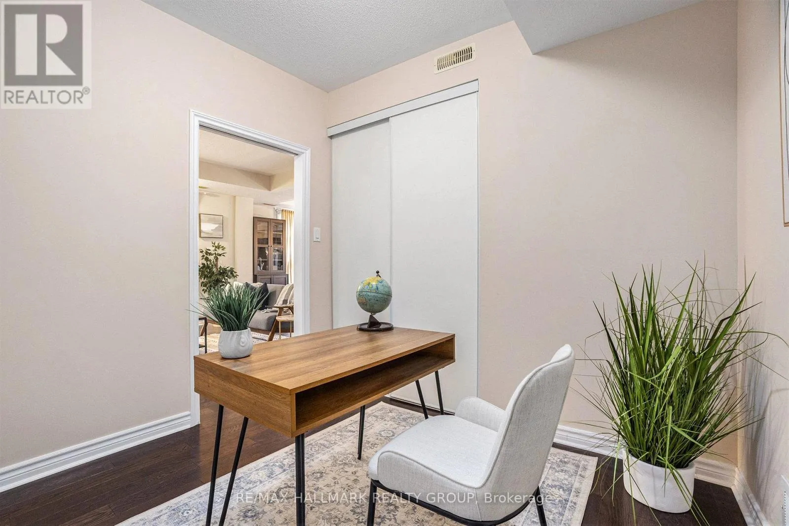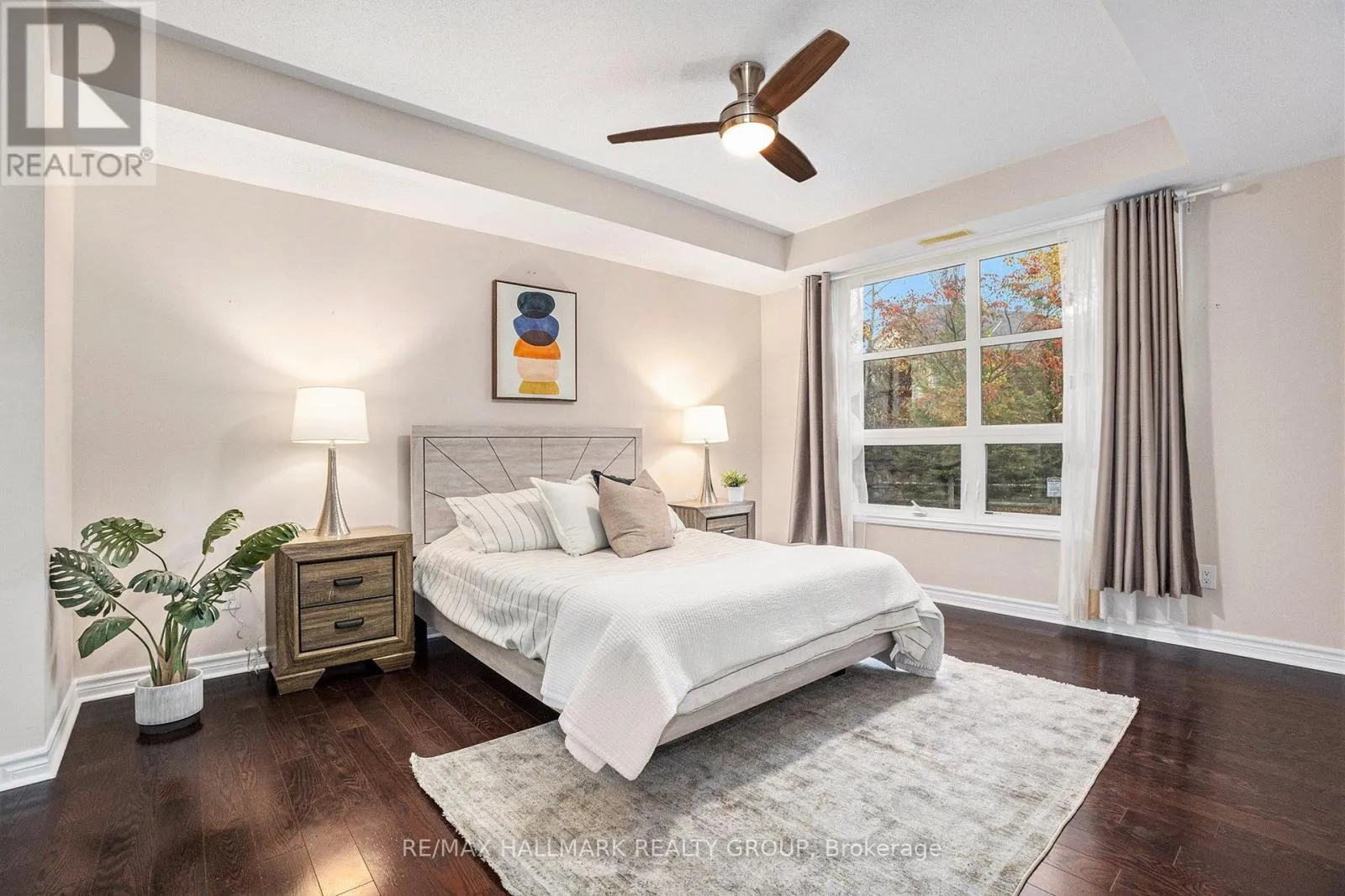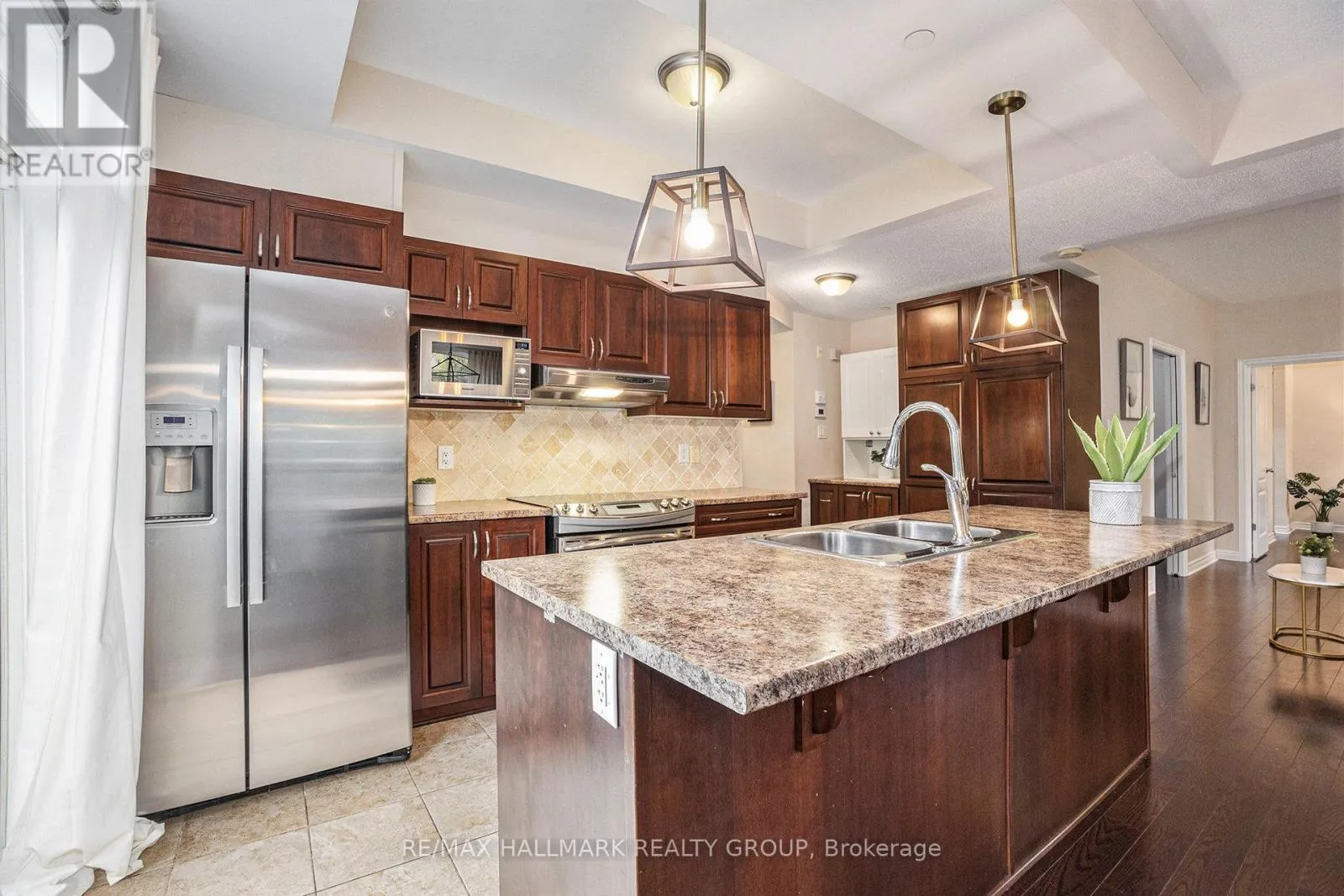 Cross Streets: Bilberry/Titanium. ** Directions: HWY 174, exit Place D'Orleans to Champlain to Jeanne d'arc North, left Bilberry Drive, Right Titanium Drive, left Montblanc Private, Building #120. Gorgeous 2 bedroom plus den, ground level corner unit. Located in the exclusive adult oriented community of Quarry Ridge in Orleans, surrounded by paths and nature. If you are looking to downsize or simply get all your living onto one level without sacrificing space, this unit will impress as it offers approx.1326sqft of living space with 2 spacious patios surrounded by beautiful landscaping. The interior space is thoughtfully laid out with a great open concept kitchen, living and dining area with lots of natural light sitting in the heart of the home. While 2 spacious bedrooms are at separate ends of the unit. There is also a den that can be utilized as a 3rd bedroom/home office/guest room. The primary room can fit even the largest of bedroom sets and has vaulted ceilings, a walk-in closet, another closet, and an ensuite bathroom with spacious walk-in shower. The secondary bedroom is also a great size and has a full bathroom located just across the hall from it. Dining area is large enough to accommodate a large dining table. The chefs kitchen has a large island and loads of cabinet and counter space. The main patio is a great size which can fit a BBQ area, outdoor living space and dining area. Inside access to your own garage and storage locker, with a secondary parking space right there as well. If you're looking for convenience, space, low maintenance, and a scenic, quiet location to call home, look no further. 24 hours irrevocable on all offers, schedule B to accompany all offers. (id:27476)
